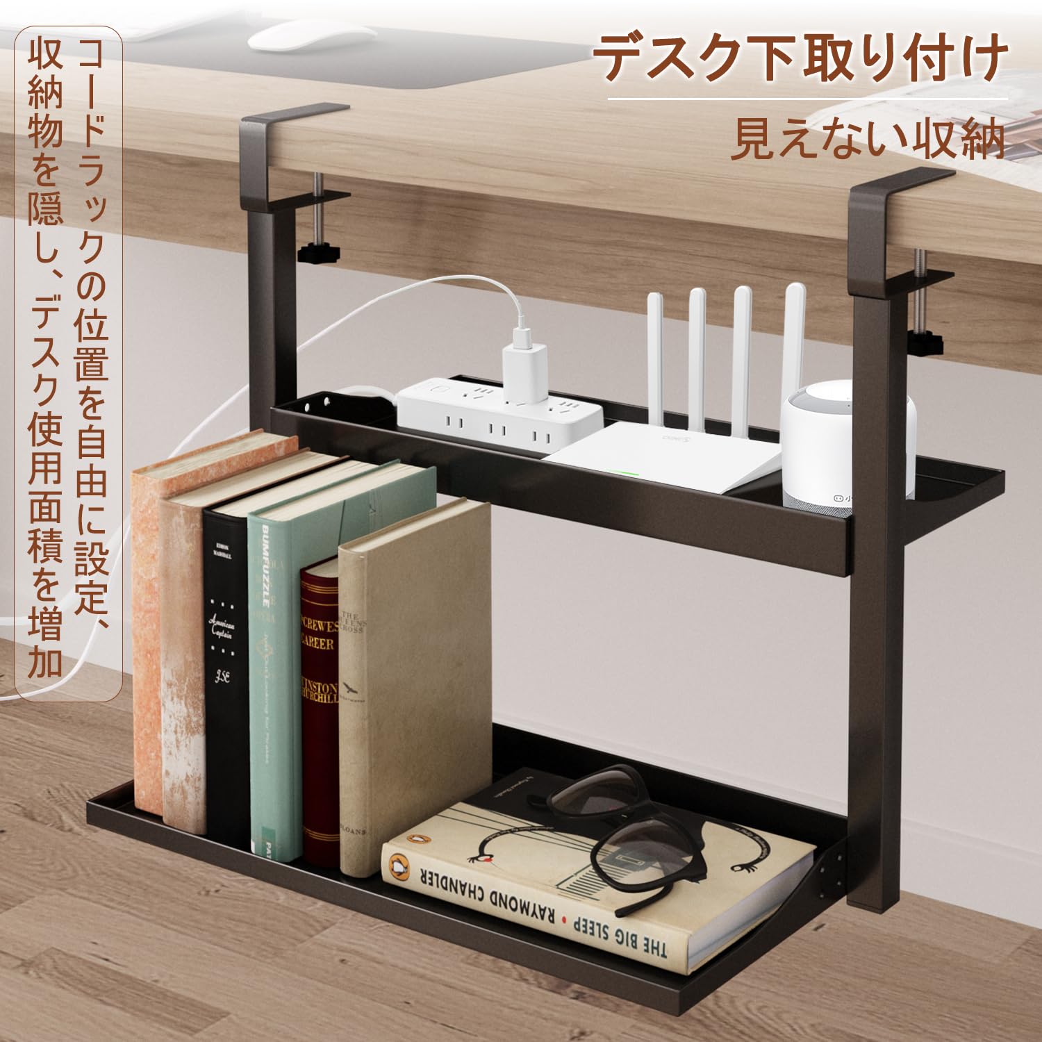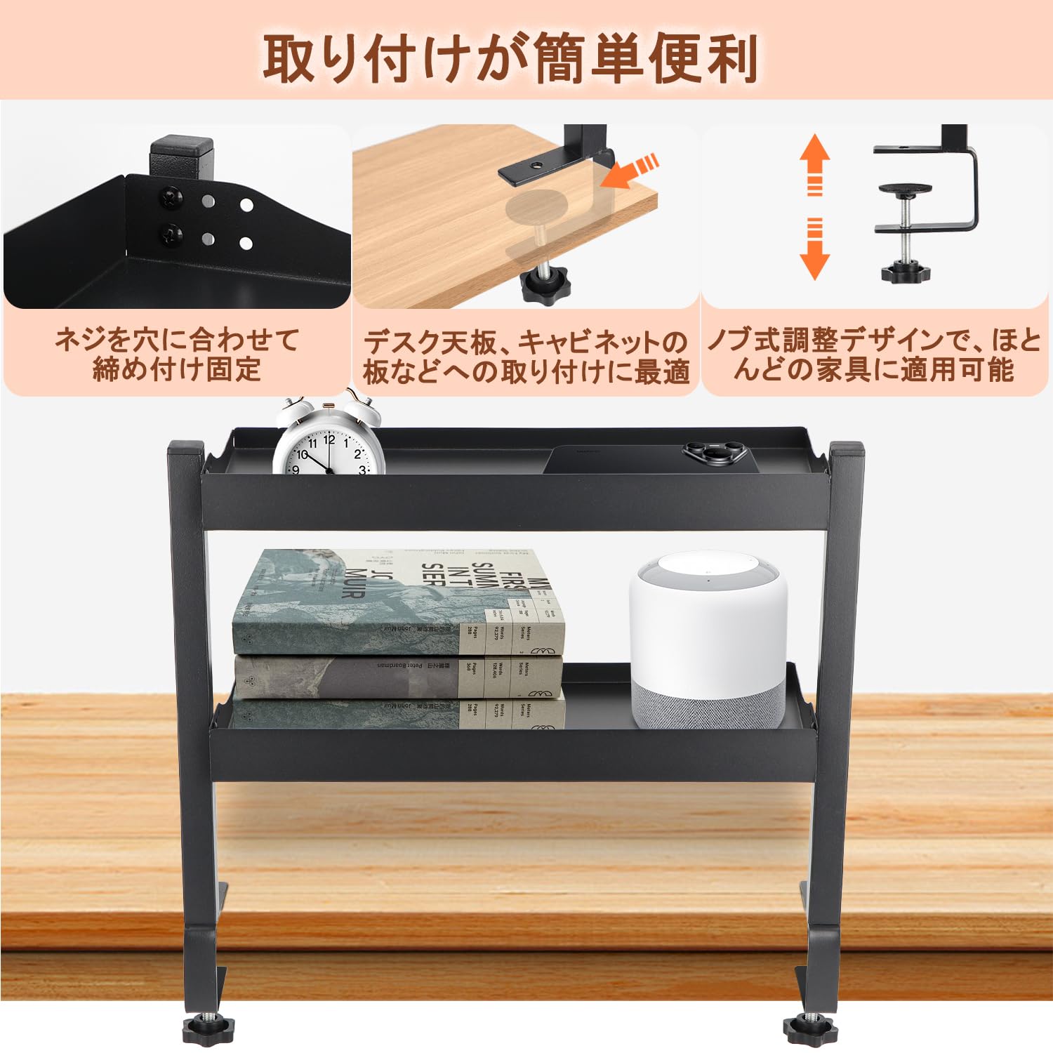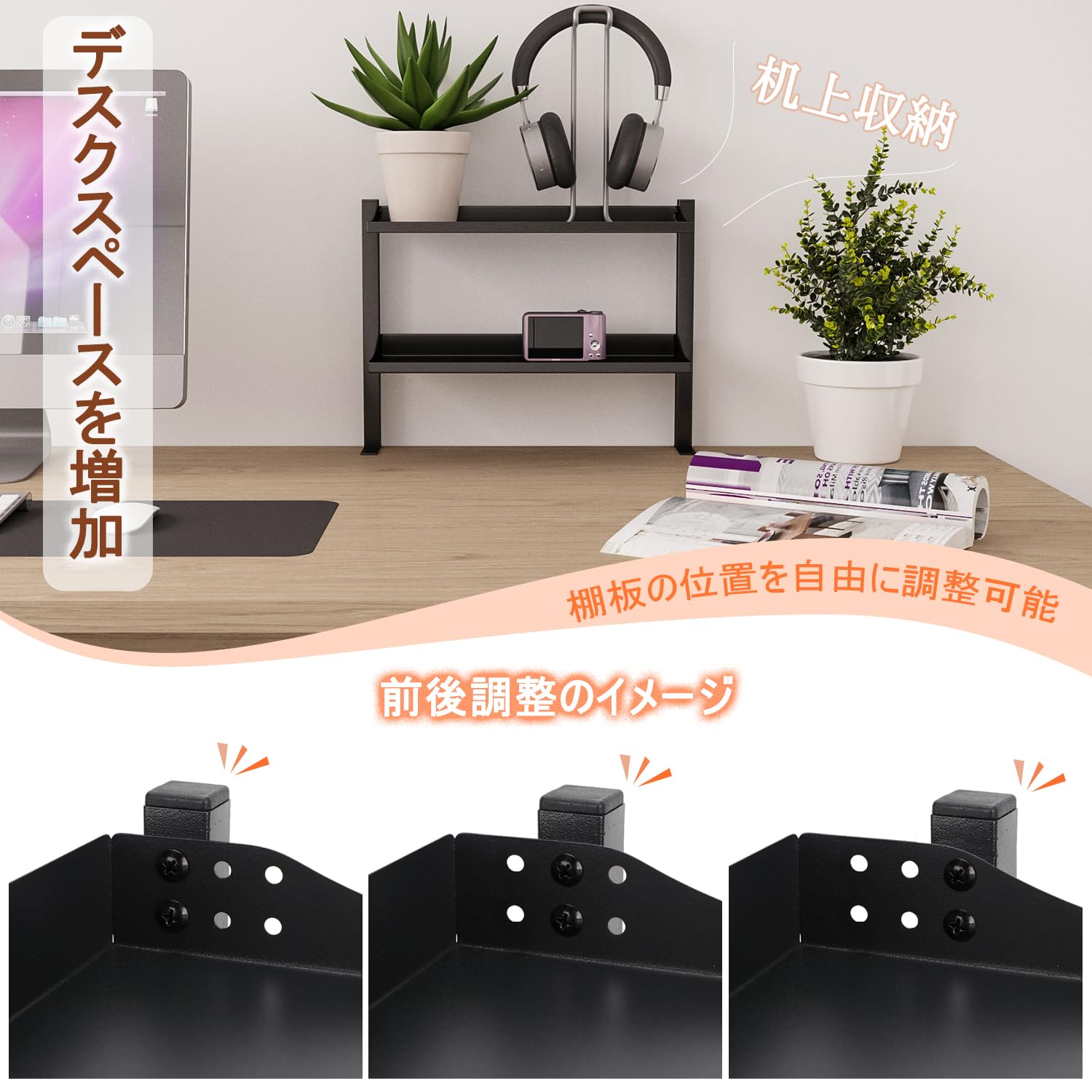 Aissiora デスク上収納 穴あけ不要 デスクサイドラック 二段机上台 卓上棚 卓上ラック 可動 クランプ固定 前後に調節できるデスク上/下 ケーブル 本 小物収納