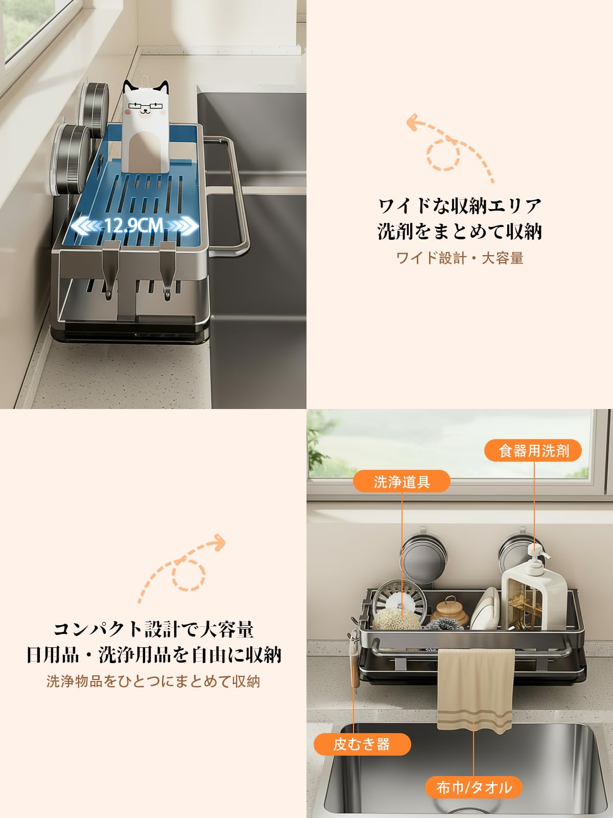 スポンジホルダー スポンジ置き キッチン 水が流れる 防錆 ステンレス製 たわし入れ キッチン 洗面台 収納 可動式仕切り 洗剤置き たわしホルダー 洗面所/キッチン収納 (シルバー)