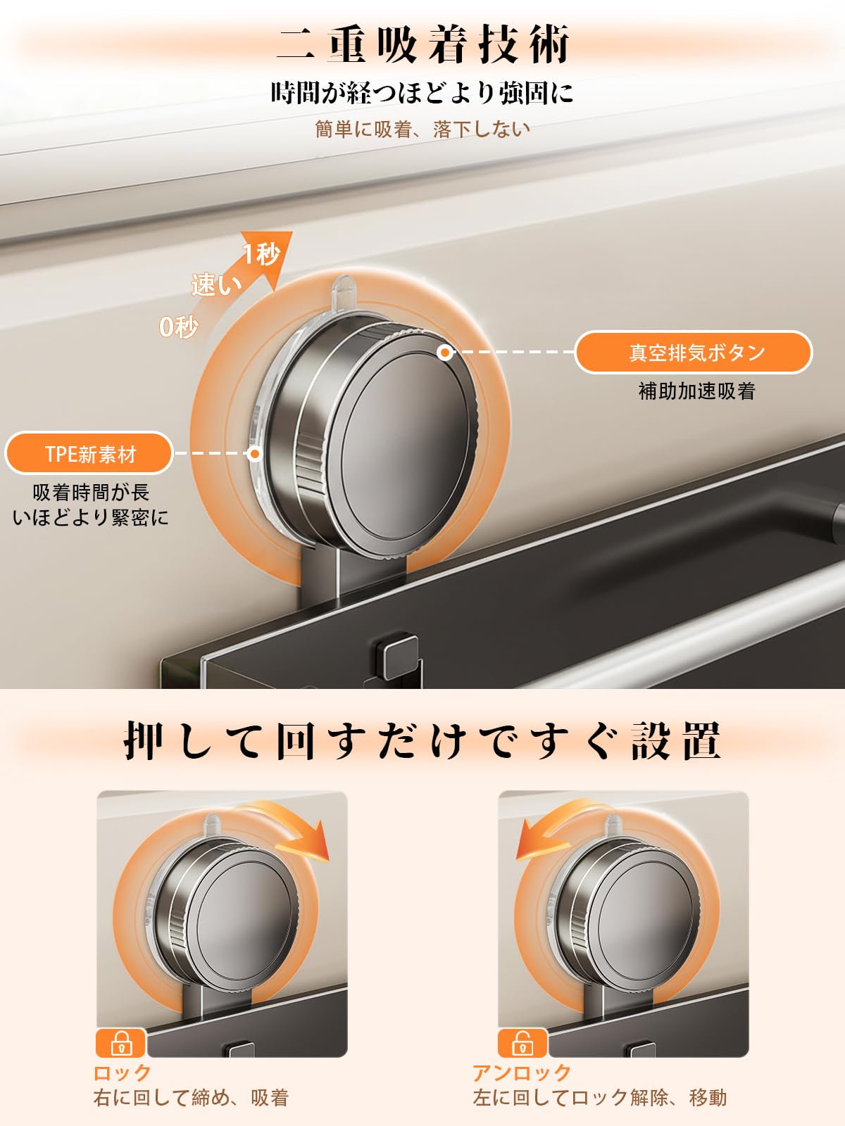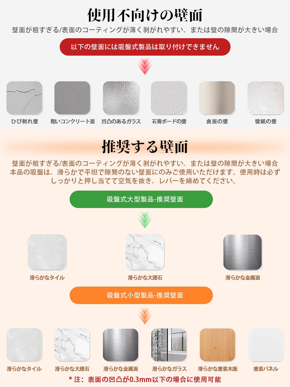 【ご使用上の注意】※金属、ガラス、タイル、ステンレス、アクリルなど、平滑で無孔の表面にのみご使用ください。凹凸のあるタイル、木目板、未研磨大理石、壁紙、乳膠塗装の壁面には絶対に使用しないでください。