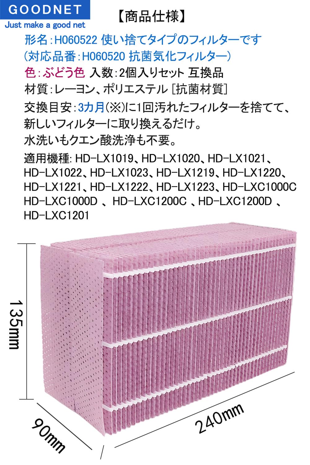 GOODNET H060525 加湿フィルター ハイブリッド式 加湿器交換用 HD-151 HD-153 HD-154 HD-1500F HD-181 HD-182 HD-183 HD-184 HD-242 加湿機 フィルター 互換品 ぶどういろ 2個入り
