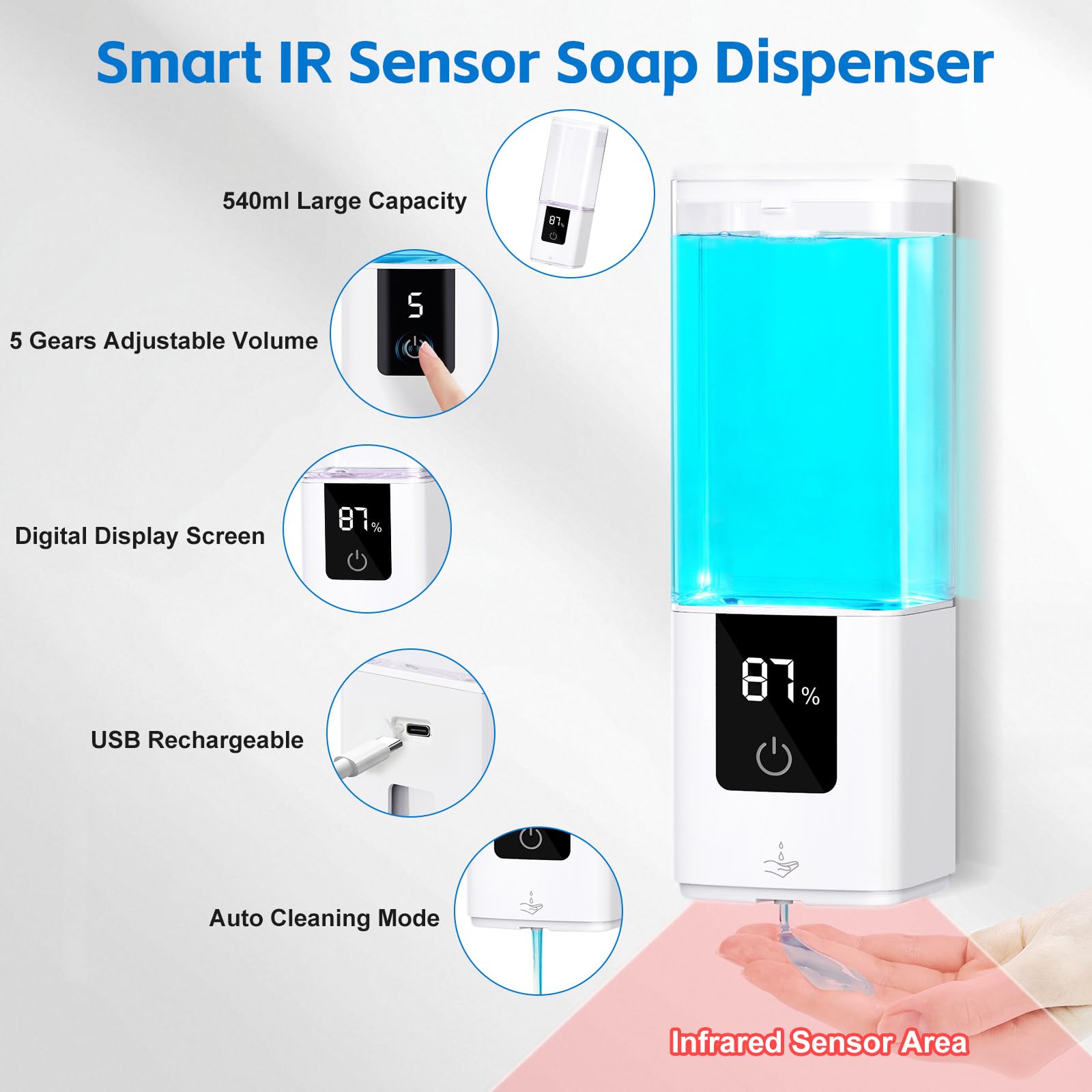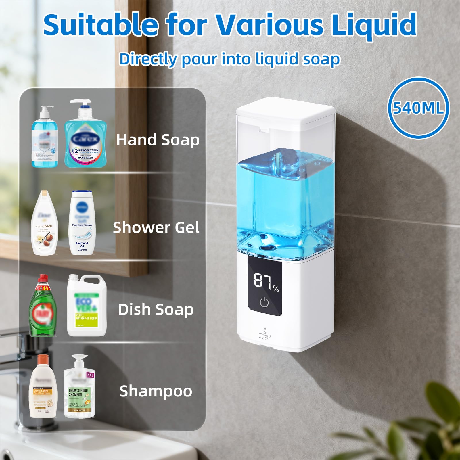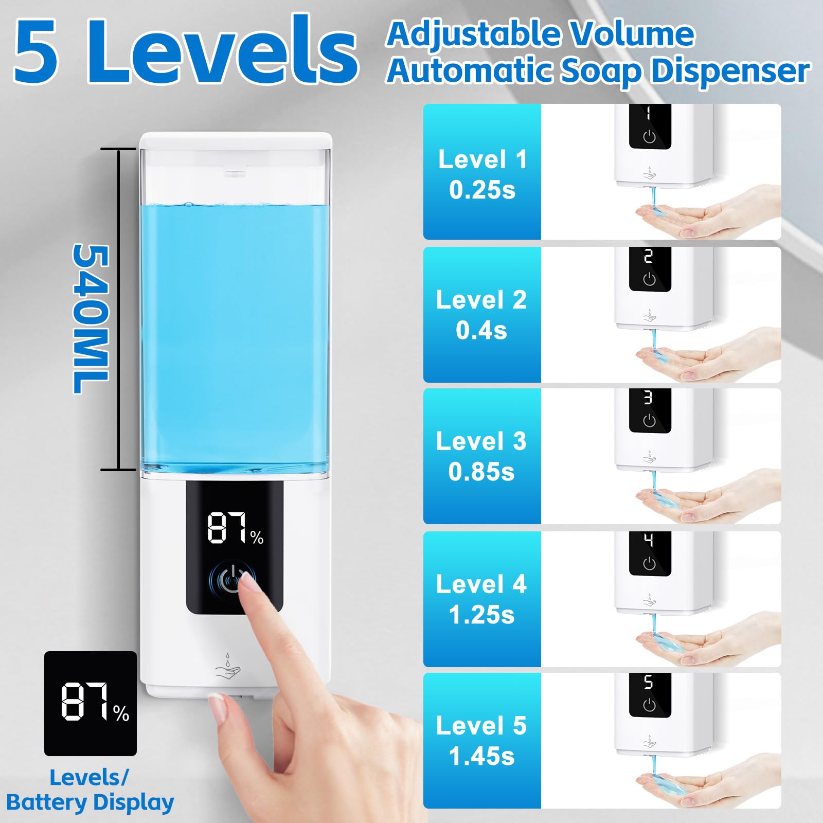 LAOPAO ソープディスペンサー 自動 液体 壁掛け シャンプーディスペンサー 5段階調整 デジタルディスプレー 充電式 IPX7防水 センサー式 シャンプーボトル 浮かせる 詰め替えボトル オートディスペンサー ハンドソープディスペンサー ボディーソープ 食器洗剤 540ml大容量 ホワイト [並行輸入品]