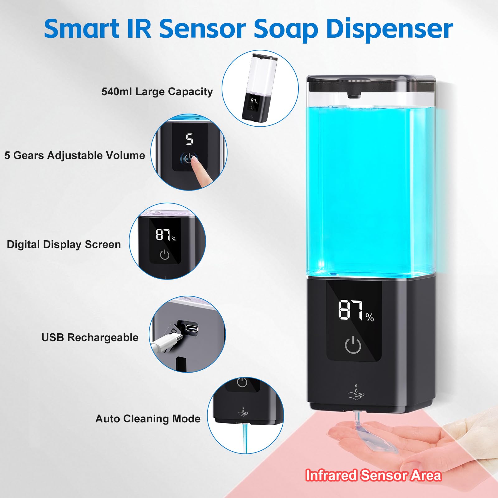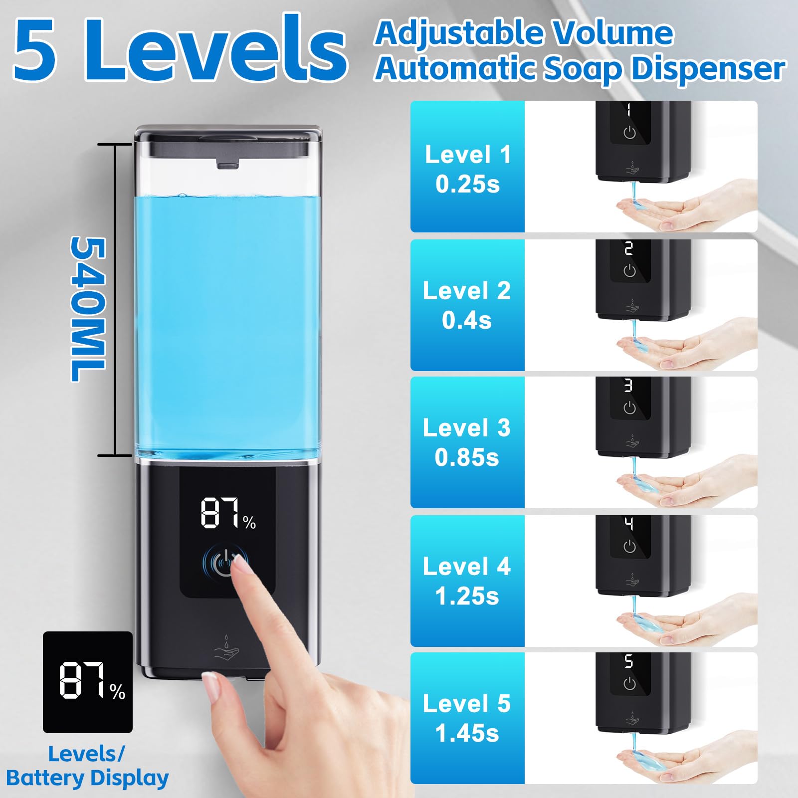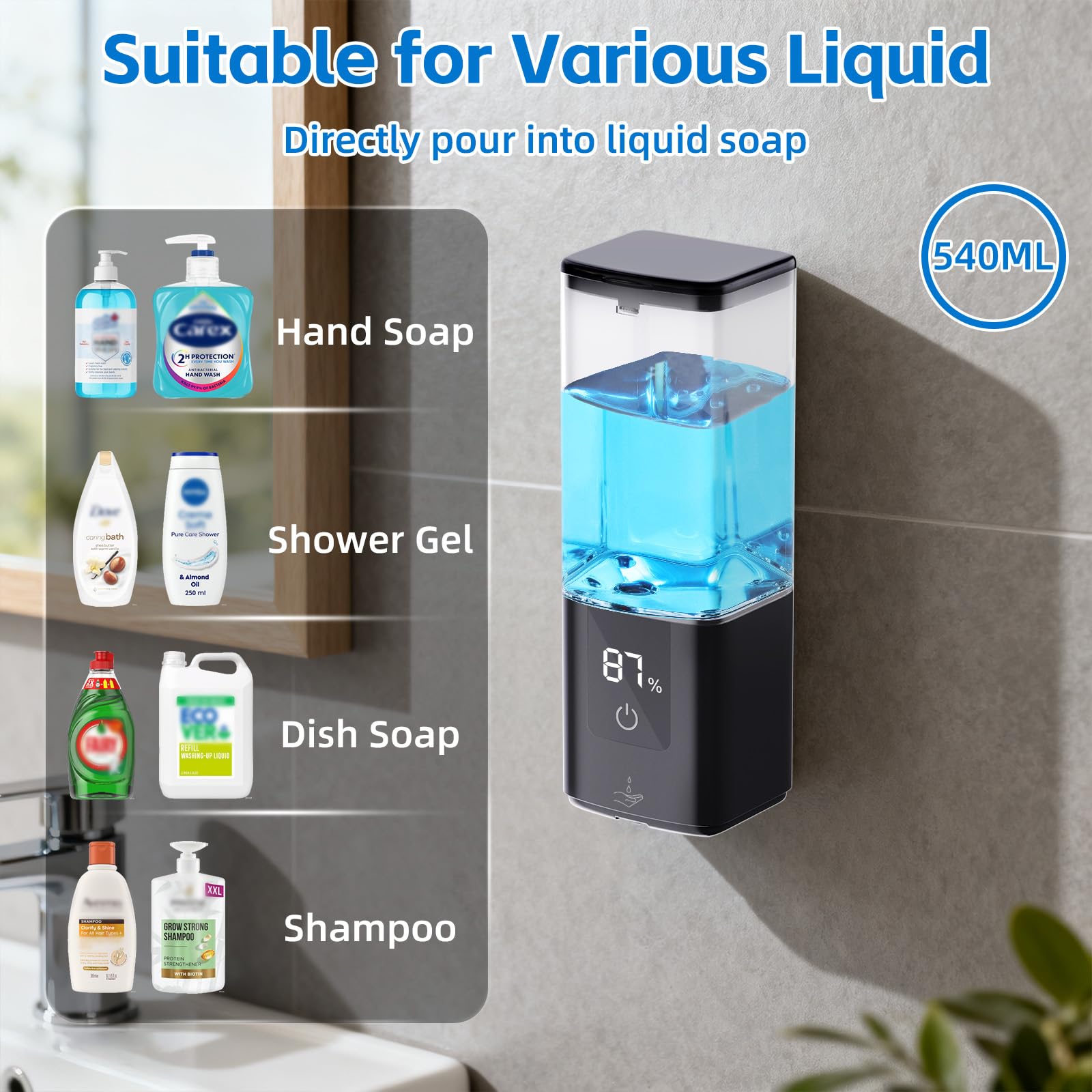 LAOPAO ソープディスペンサー 自動 液体 壁掛け シャンプーディスペンサー 5段階調整 デジタルディスプレー 充電式 IPX7防水 センサー式 シャンプーボトル 浮かせる 詰め替えボトル オートディスペンサー ハンドソープディスペンサー ボディーソープ 食器洗剤 540ml大容量 ブラック [並行輸入品]