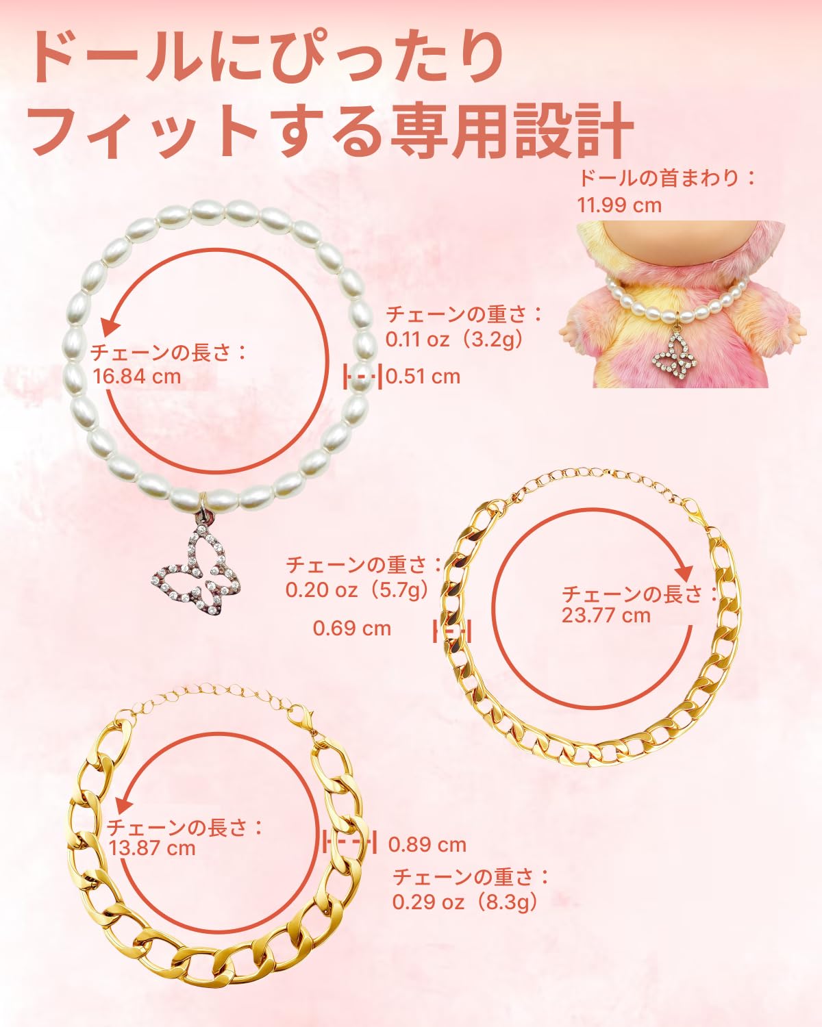 17cm人形ドール用 3本セット パールネックレス(バタフライペンダント付き)&ゴールドチェーンネックレス ラブブ用