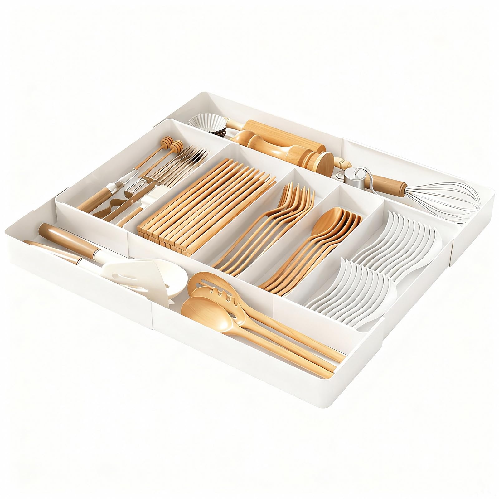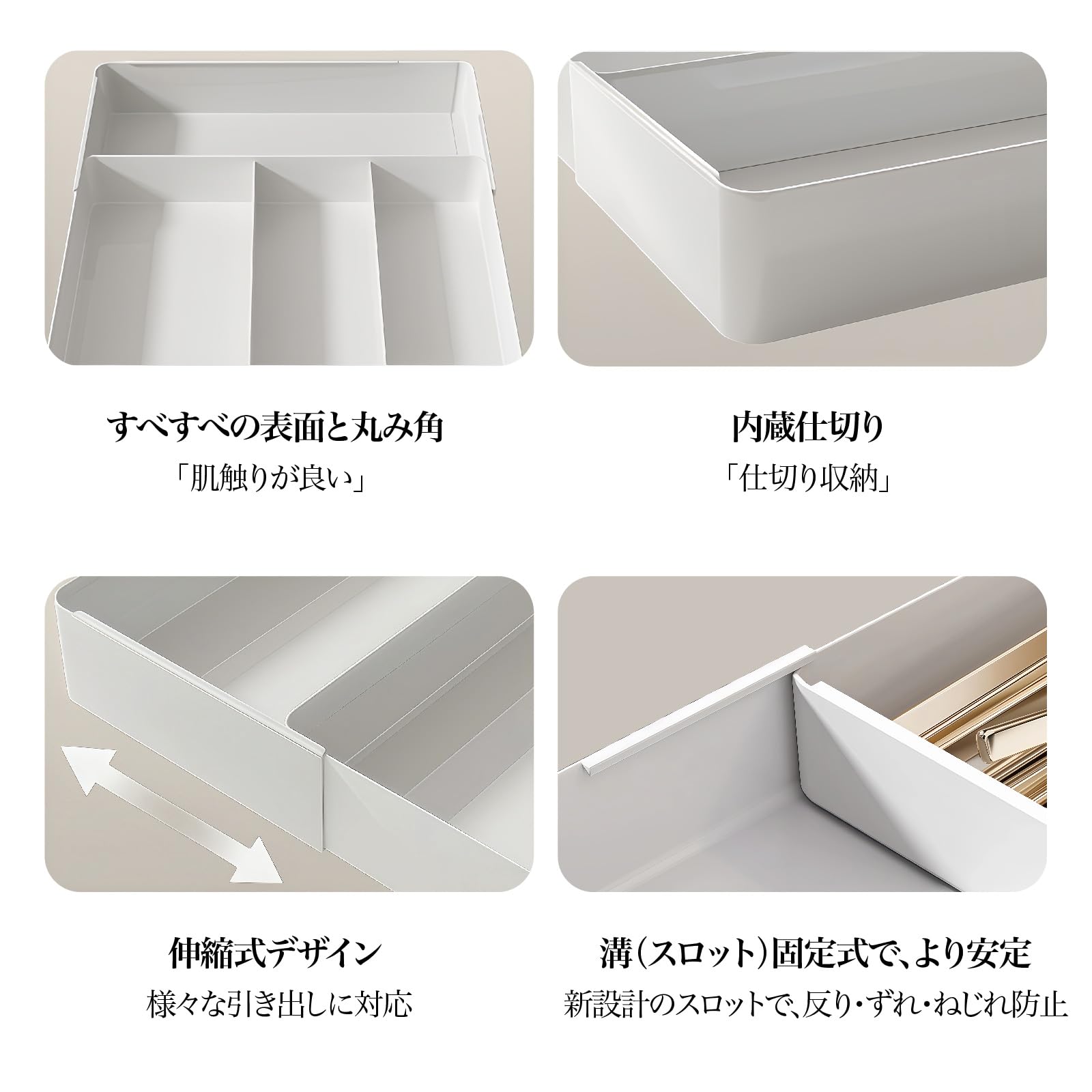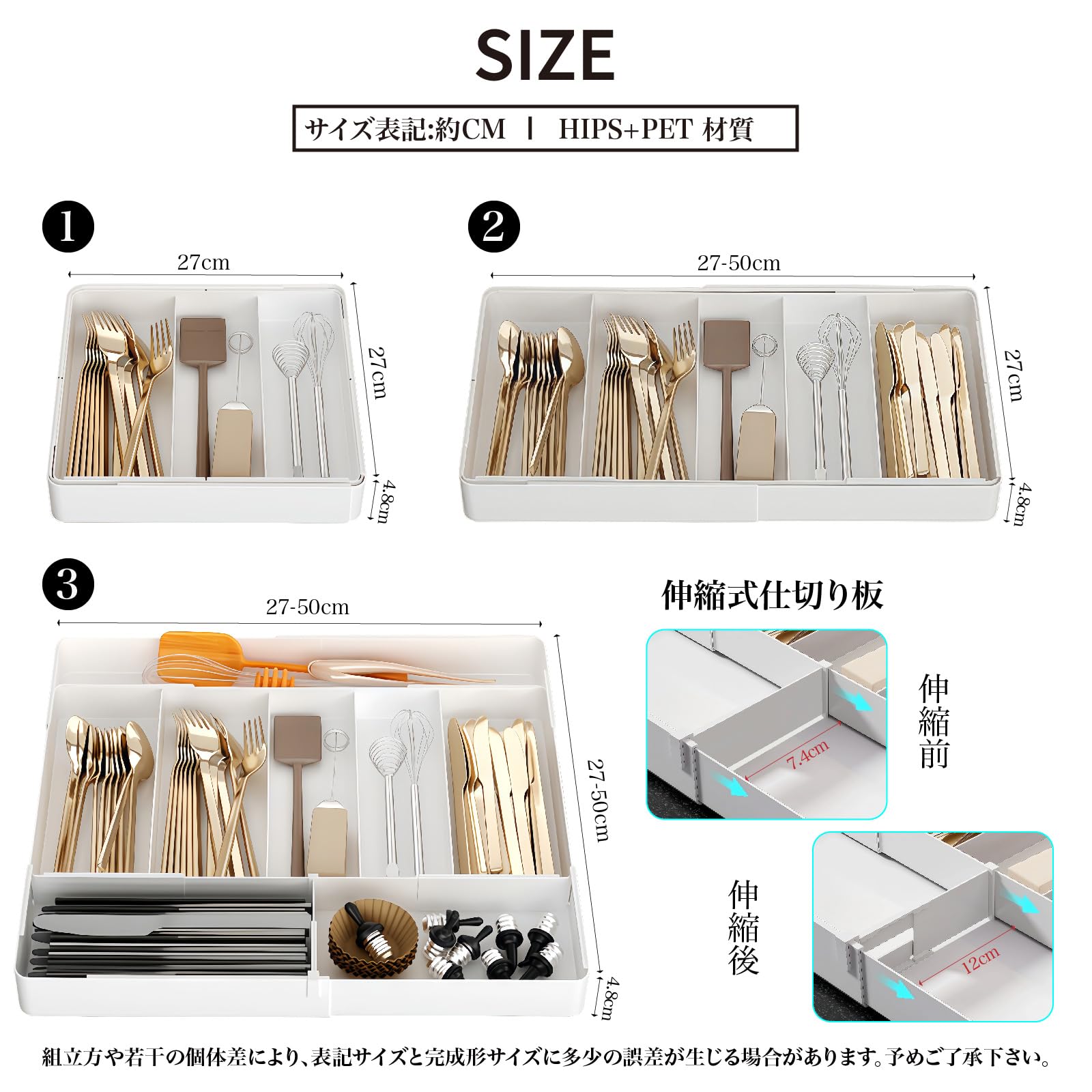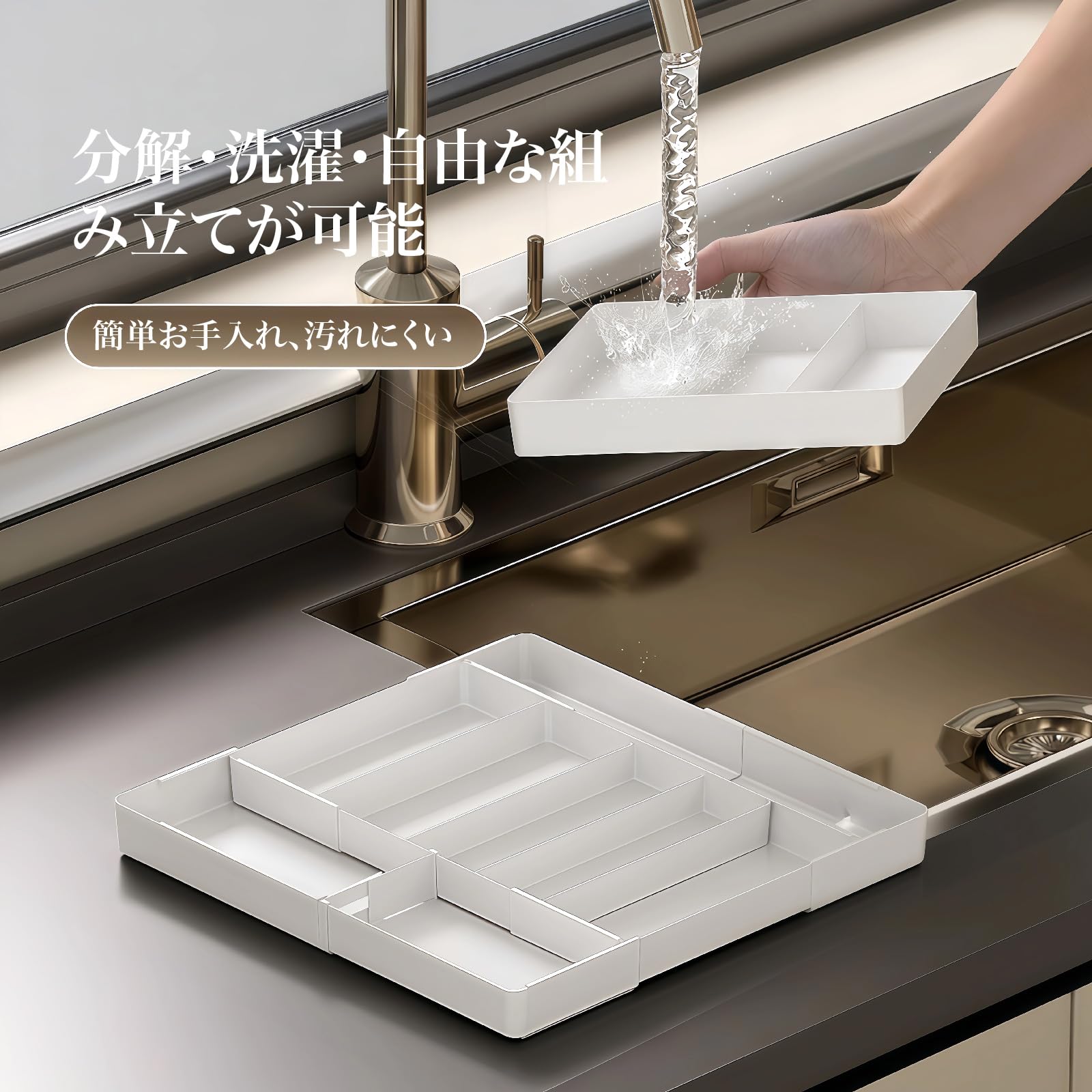 ママ倉 カトラリーケース (伸縮 調節可能) カトラリートレー 4面伸縮 引き出し 仕切り お手入れ簡単 キッチン収納 引き出し W27~50×D27~50×H4.8 取外し可能 カトラリー 収納 ホワイト