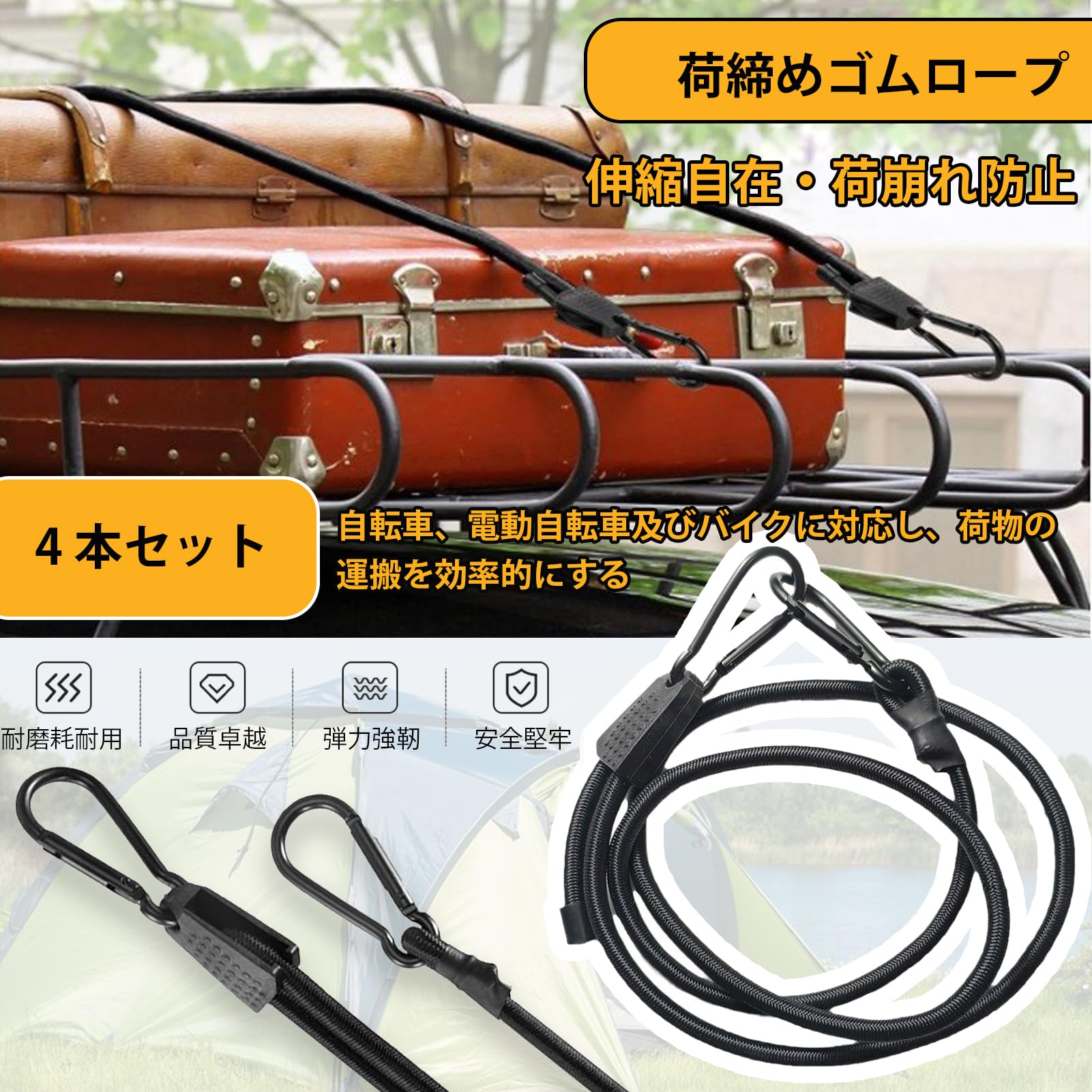 ゴムバンド 自転車 荷台 ゴムロープ 4本組: 1M ゴム紐 フック付き - バイク 台車 荷物 荷紐 固定 伸縮調節可能 フック 固定バンド ブラック