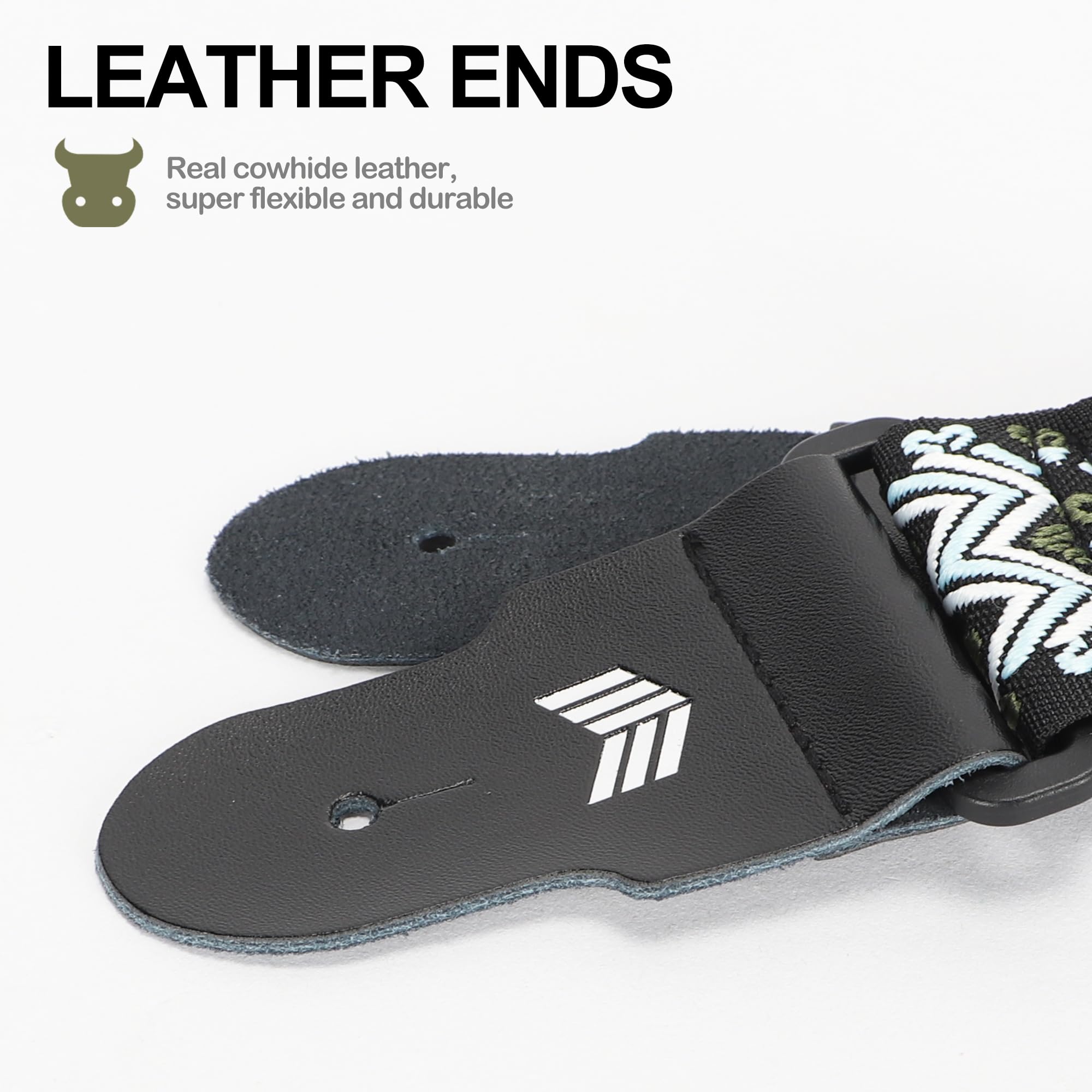 [MOOZAK] ヴィンテージ刺繍入りコットンギターストラップ, 本革エンド, アコースティック&エレクトリックギター対応, ピック3枚・ロック2個・ヘッドストックタイ1個付き