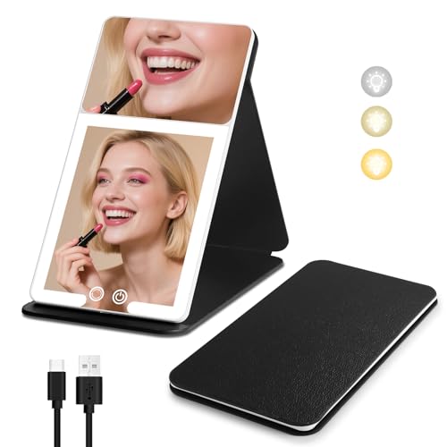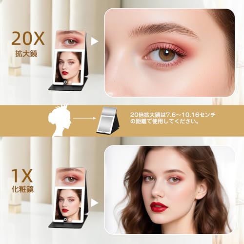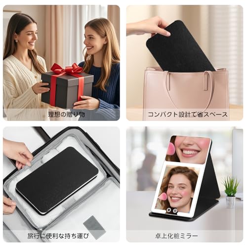 化粧鏡 卓上鏡 LEDライト付き 3光色 明るさ無段階調光 USB充電式 スタンドミラー コンパクトに折りたたんで持ち運び 折り畳み式 明るさ無段階調光 USB充電式 消し忘れ防止機能 収納便利 旅行用 持ち運びに便利 (拡大鏡付き ブラック)