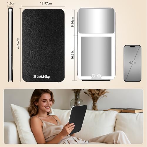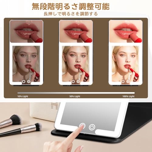 折立鏡 LED化粧鏡 PUレザー 折りたたみ式 スタンドミラー 三色調光 卓上ミラー 女優ミラー 指タッチ 充電式 メイクアップ VIKMARI(ブラック)
