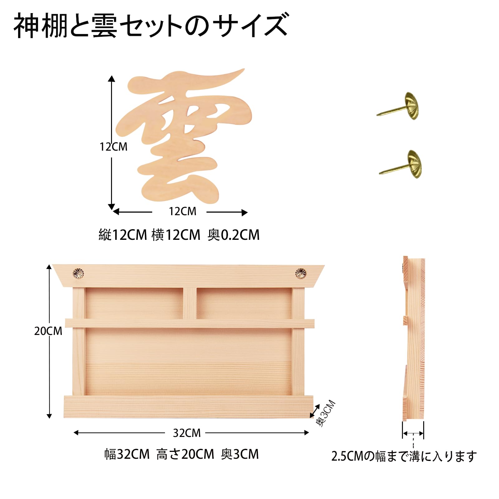 神棚セット【鳥居付きお札立て+雲板+菊座釘2本+両面テープ】白松製 壁掛け・置き兼用 穴開け不要 簡易神棚