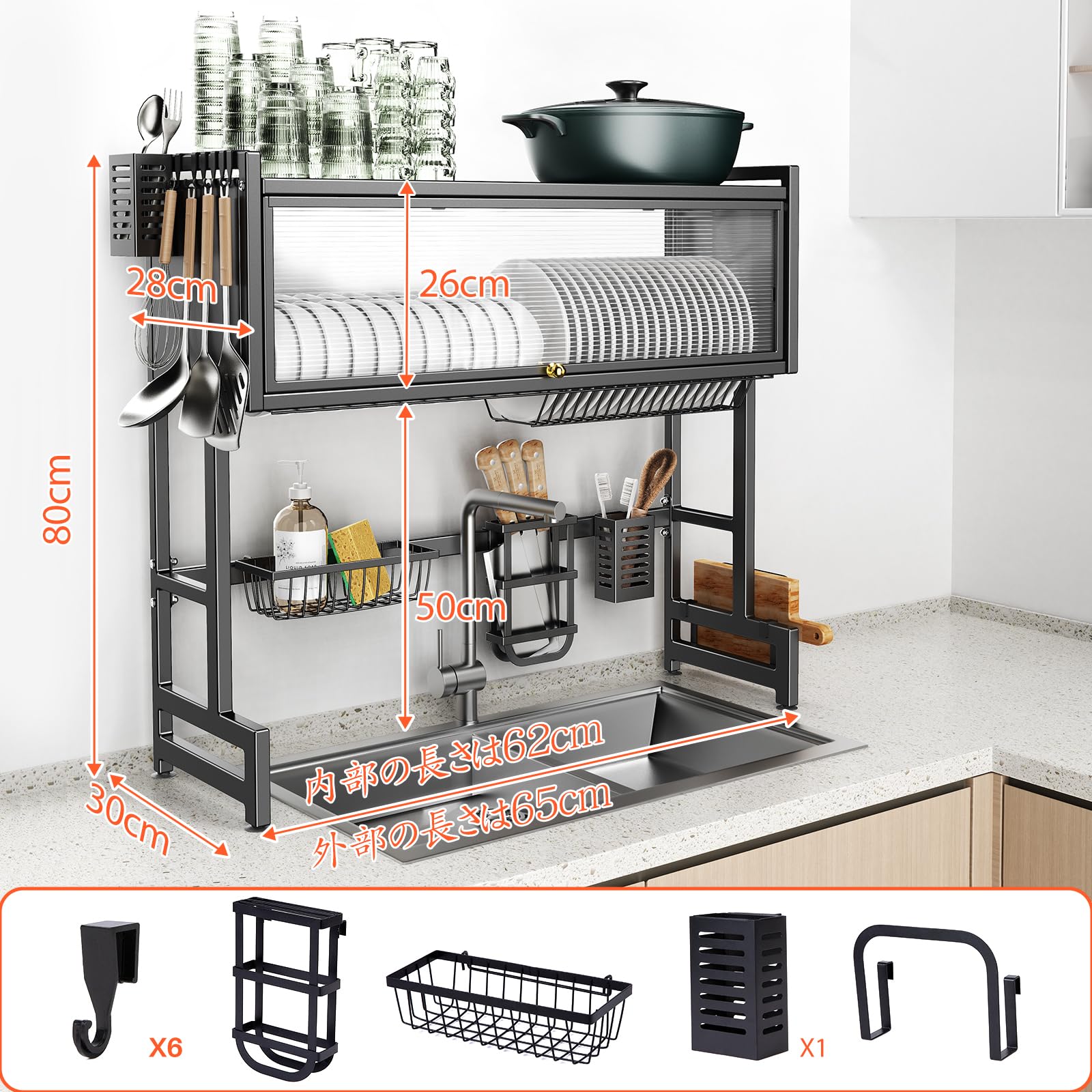 Sythdio Myth 水切りラックシンク上 蓋付き 3段 食器棚 大容量 水切りかご キッチンラック 食器乾燥 錆びない 洗い物ラック 省スペース 水が流れる皿立て多機能収納 包丁スタンド 組み立て簡単 dish drying rack 日本語の説明書付き (ブラック-蓋付き-長さ65cm)
