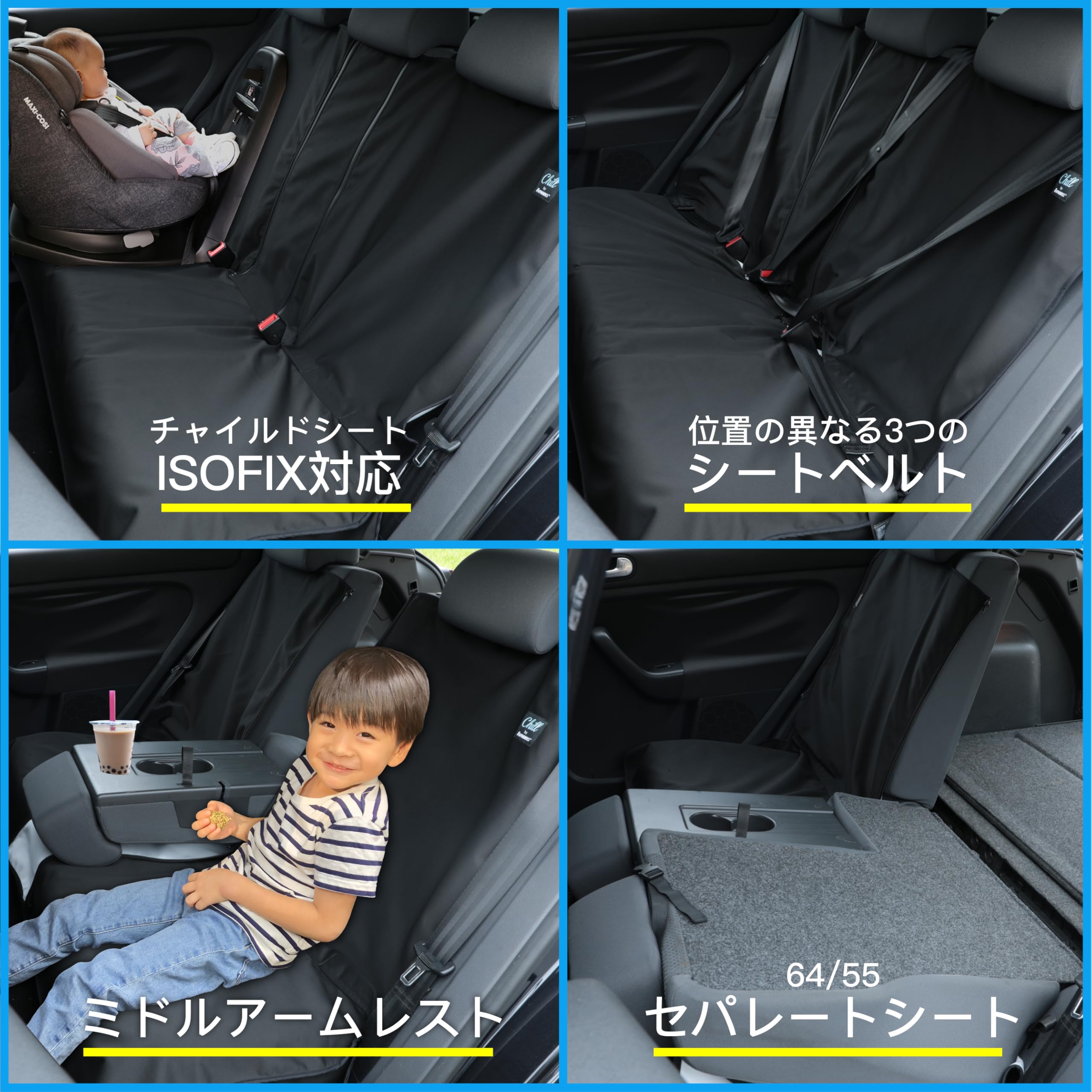台湾と日本でのクラウドファンディングの総額が1500万を突破しました!シートカバーランキングで非常に高い評価を受けています。 Chillの乗車体験をこよなく愛するすべての方に捧げます~ 【取り付け方法】 1.左右のヘッドレストの後ろにゴムバンドを掛けてバックルを留め、後部座席の高さに合わせて長さを調整してください。 2.ファスナー開口部を開くと、後部座席の両側のシートベルトを締めることができます。 3.シートカバーの裏側にはゴムバンドがあり、シートへの固定力を強化することができます。 4.チャイルドシート用のファスナー開口部もあり、2か所の開口部を開いてISOFIX固定金具を差し込んで後部座席に固定し、ファスナーを閉めれば取り付け完了です(使用しないときは閉めておいてください)。 5.シートカバーの両側のサイドパネルをシートの左右に設置します。 ※シートカバーの向きを変えて後部座席に敷き、両側のヘッドレストにゴムバンドを固定すると、「後部座席保護パッド」としてお使いいただけます。 【セパレートモデル】 1.中央位置のシートベルトを使用する場合:該当する位置のファスナーを引き、シートベルトを引き出した後にファスナーを閉じると、シートカバーを装着した状態でシートベルトをお使いいただけます。 2.真ん中のアームレストを使う場合:2つのファスナーを開けるだけでお使いいただけます。 3.64セパレートシートまたは55セパレートシートに使用する場合:シートを分割したい位置のジッパーを開ければ、お使いいただけます。 【お手入れ方法】 1.洗濯機で丸洗いすることができます。洗濯ネットに入れて洗濯してください。 2.低温コースで洗ってください。ドライクリーニングはせず、洗濯後に自然乾燥させてください。 3.漂白剤や柔軟剤は使用しないでください。柔軟剤に含まれるシリコンが抗菌繊維を覆うため、抗菌効果が失われてしまいます。 ※人体や環境に害を与えないよう、長持ちする抗菌繊維(非銀イオン)を使用しています。 【商品スペック】 【カラー】:ファッションブラック/ディープシーブルー/グラファイトグレー/オリーブグリーン/アースブラウン 【サイズ】: リアシート用セパレートモデル:長さ120×幅138cm 【素材】: 上層:ポリエステル49%、ナイロン51%、中層:TPU、底層:ポリエステル100% MIT台湾製 【注意事項】 1.ヘッドレスト付きのシートにお使いいただけます。カバー装着後の平坦度はシートの形状により異なります。 2.本製品のサイドはオープンデザインで、伸縮性のあるゴムバンドを使用しているため、シート側面のエアバッグに影響を与えにくくなっています。 3.本製品は純正品ではなくオプション品です。自動車メーカーごとにシートの設計や使用条件が異なりますので、本製品の取り付け・取り外しの際は、エアバッグ装置に影響を与えないよう注意が必要です。本製品の適合性については、お客様ご自身でご判断いただき、ご不明な場合はメーカーにお問い合わせください。