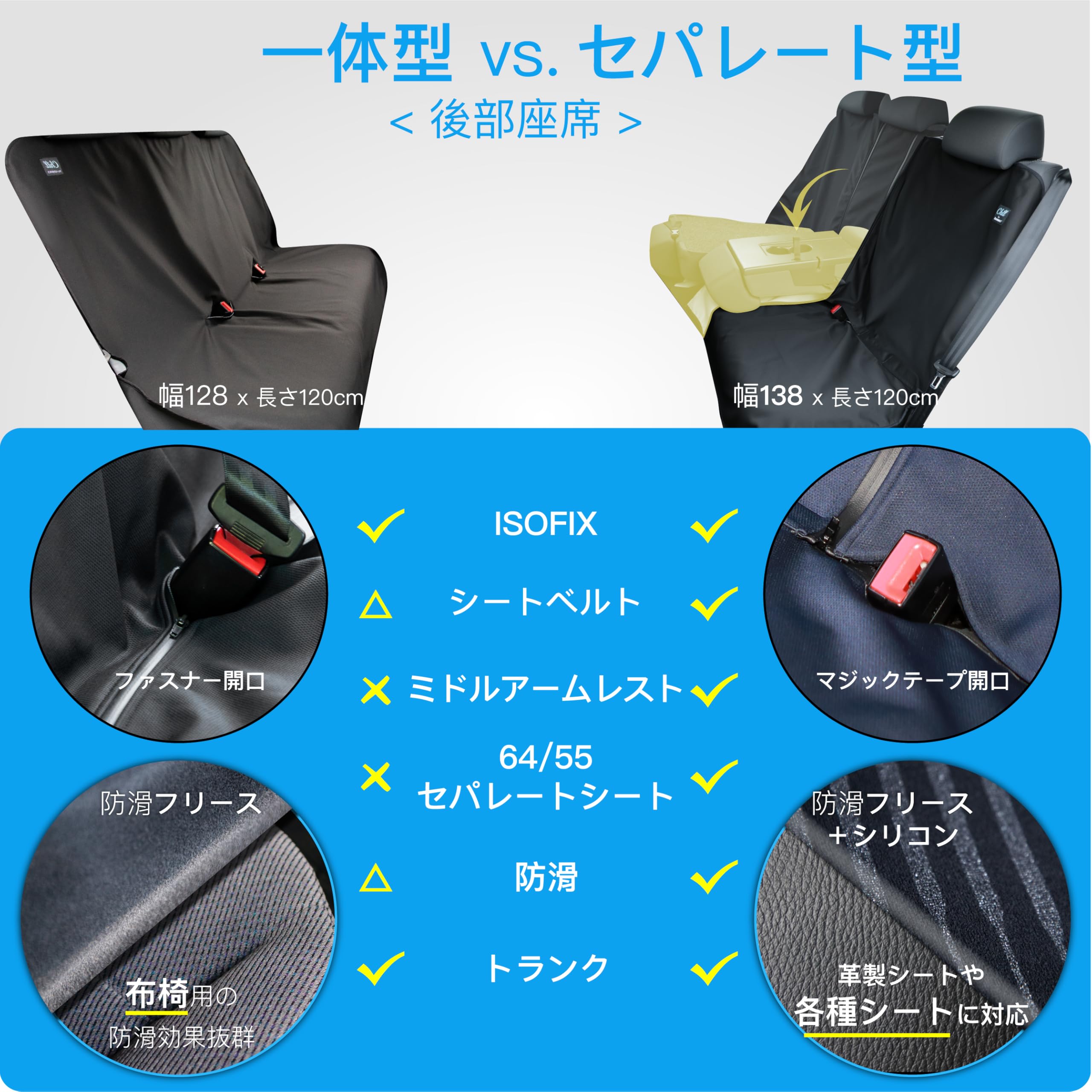 AUTHENTICS Chill カーシートカバー 汎用 軽/普通車対応 丸洗いOK - 防水 吸汗 抗菌 消臭、取付簡単のシートエプロン、台湾製の機能性生地、肌に優しく快適、化学製品の臭いがしない - セパレート型リア後部座席 、ISOFIXチャイルドシート対応 (W138 x L120cm)