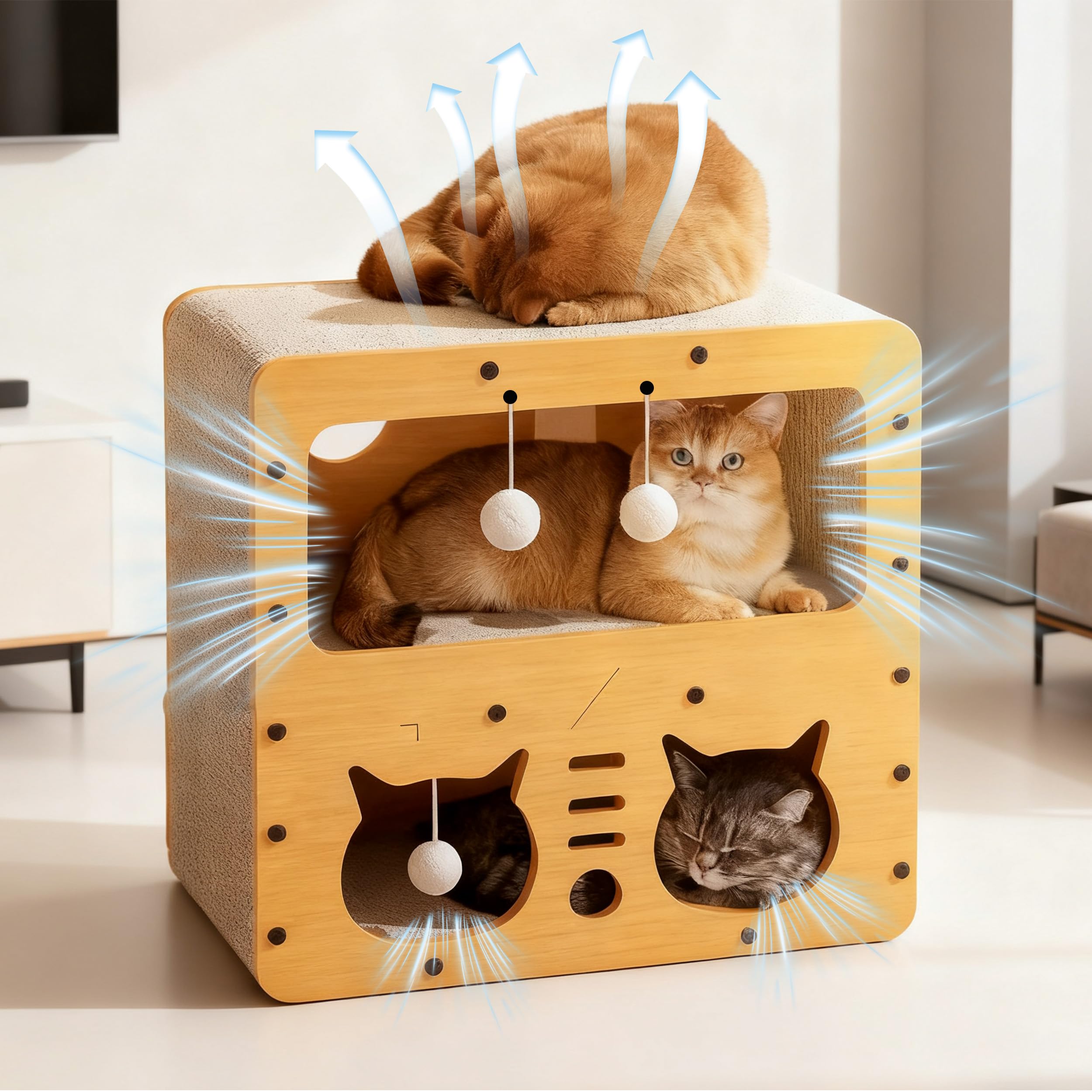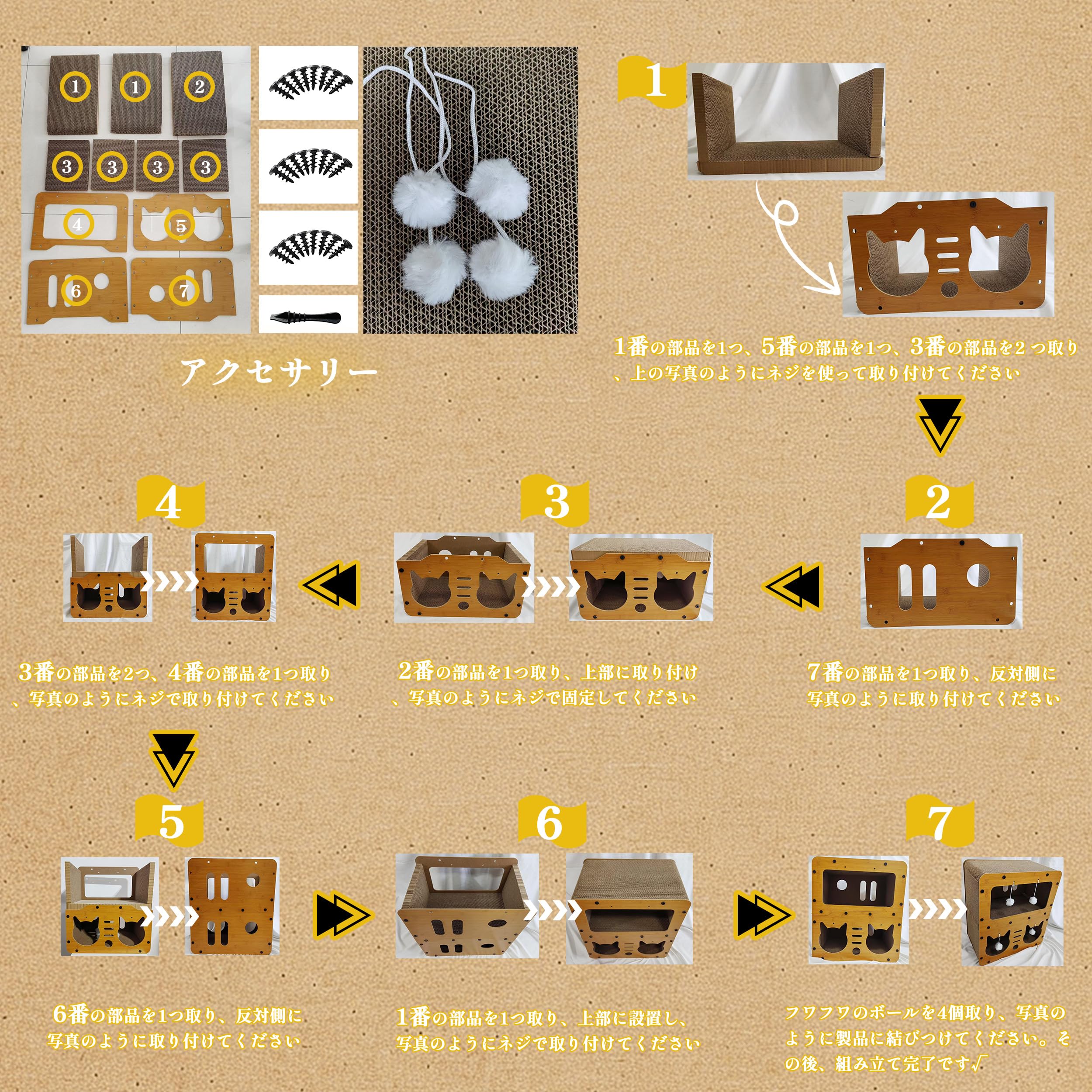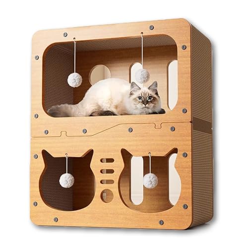 SmartMaster 猫 爪とぎ 段ボール キャットハウス 三階猫 ハウス 木製 強化ダンボール 爪磨き 爪とぎハウス 猫 爪研ぎ 組み立て式 爪とぎ兼ベッド 猫箱 猫 ダンボールハウス 猫窓 鯉柄のれん コンパクト 収納簡単 省スペース 通気性 2部屋 (ダークイエロー)