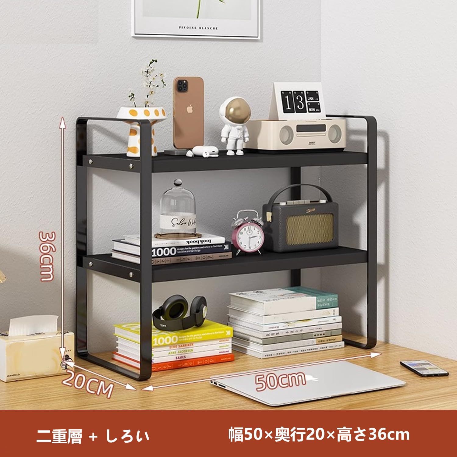Vinnatsu卓上 ラック 小さい棚 デスク上収納ラック デスク 棚 ラック 小さい 整理棚 デスク上置き棚 卓上本棚 2段 机の上に置く棚 デスク収納 デスクシェルフ 本立て 高さ調整 オープンシェルフ 2段 木製 収納 本棚 クランプ式 簡単組立 スペース活用 おしゃれ (ブラック, 50cm*20cm*36cm)