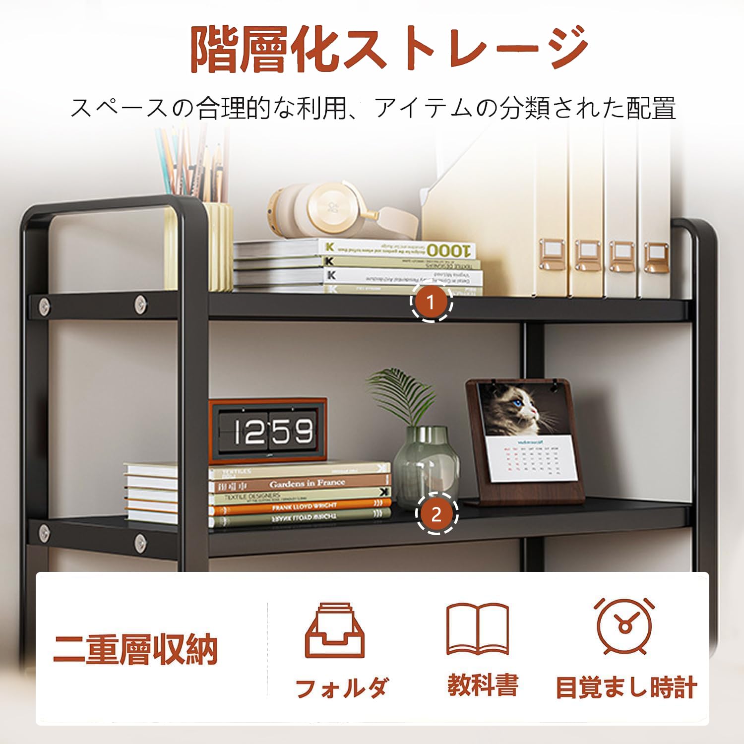 ブランデスク上2段本立て仕切り付置棚 机上本棚 書類整理デスク周り整頓おしゃれ省スペース小物収納棚