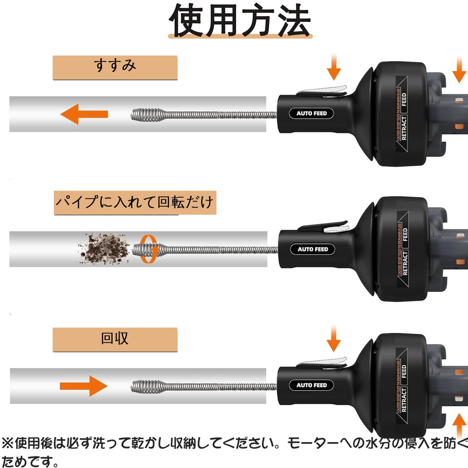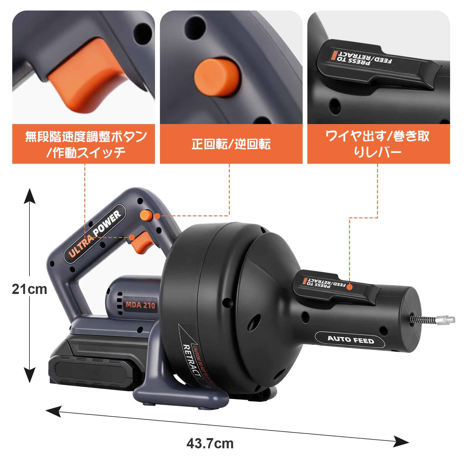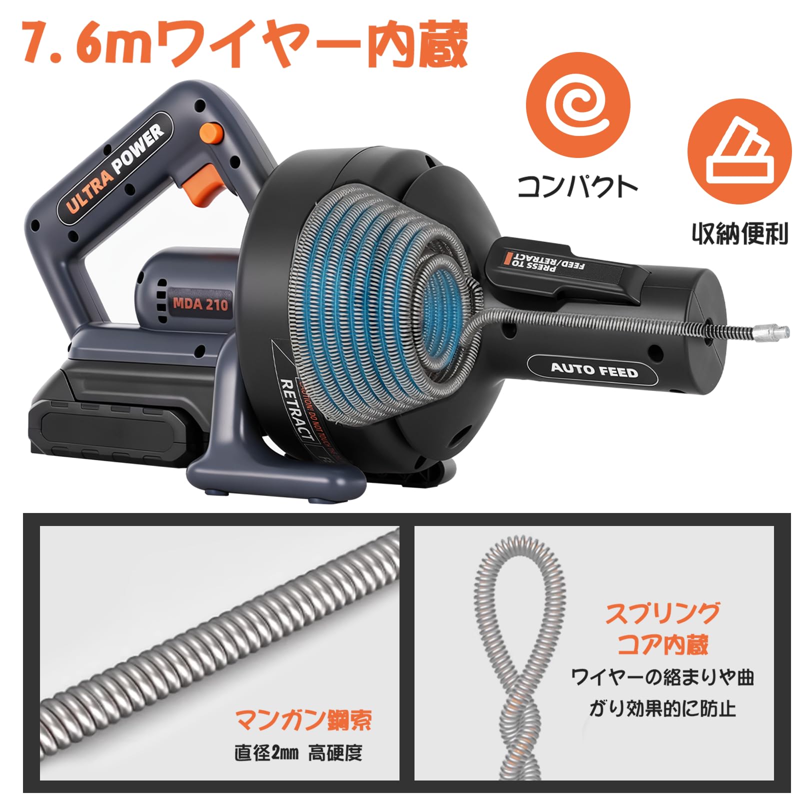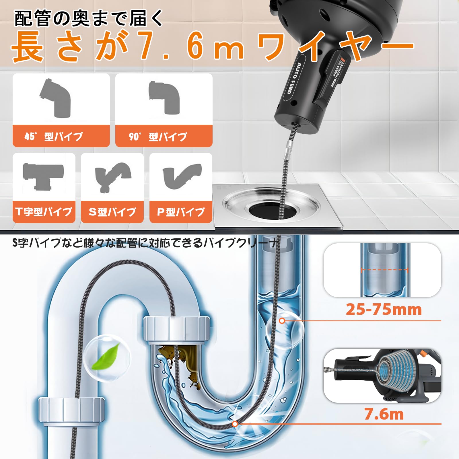 MXBAOHENG 電動排水管クリーナー ワイヤー パイプ クリーナー 21V 自動送り/巻き取り 軽量 7.6mワイヤー内蔵 無段階変速&正逆転 詰まり 解消 トイレ 風呂 キッチン 洗面台 排水溝 パイプ掃除