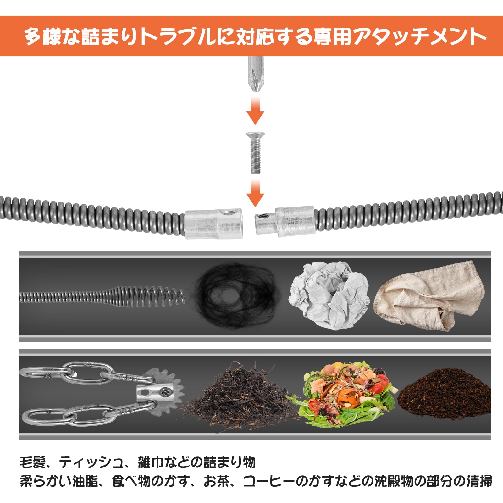パイプクリーナー ワイヤー 排水管 掃除 ワイヤーブラシ 回転式 排水溝 つまり 解消 パイプブラシ手袋 保管袋 スポンジ付き パイプ疏通ツール 下水/排水口/キッチン/お風呂/トイレ/洗面所 修理(5m)