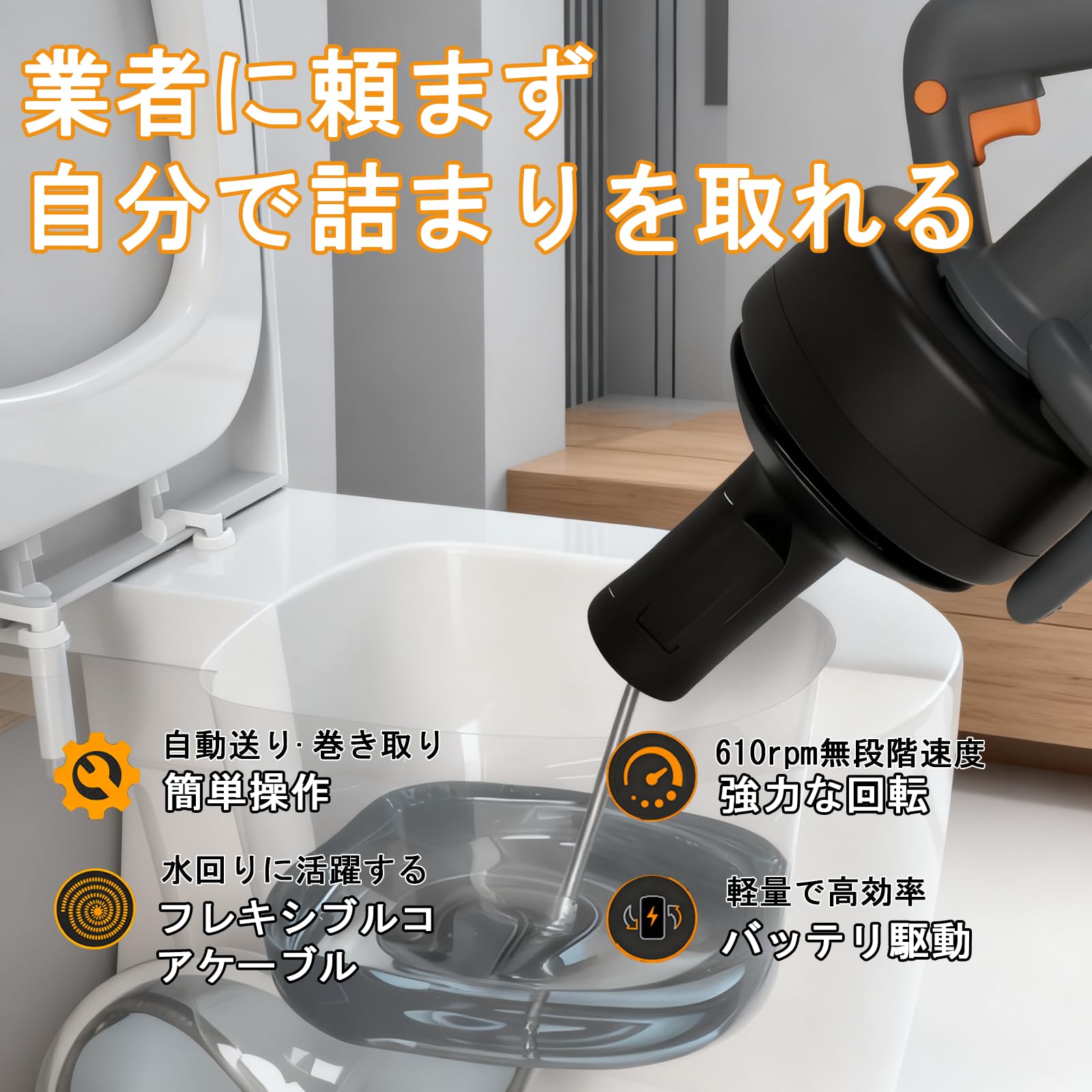 BAOSHISHAN 電動式トイレつまり解消道具 充電式パイプクリーナー 詰まり解消ツール トイレクリーナー バッテリー内蔵 加圧式真空式詰まり除去 3種類のヘッド付き 洋式トイレ/和式トイレ/洗面台/流し台強力 家庭用 水道屋さん業務用