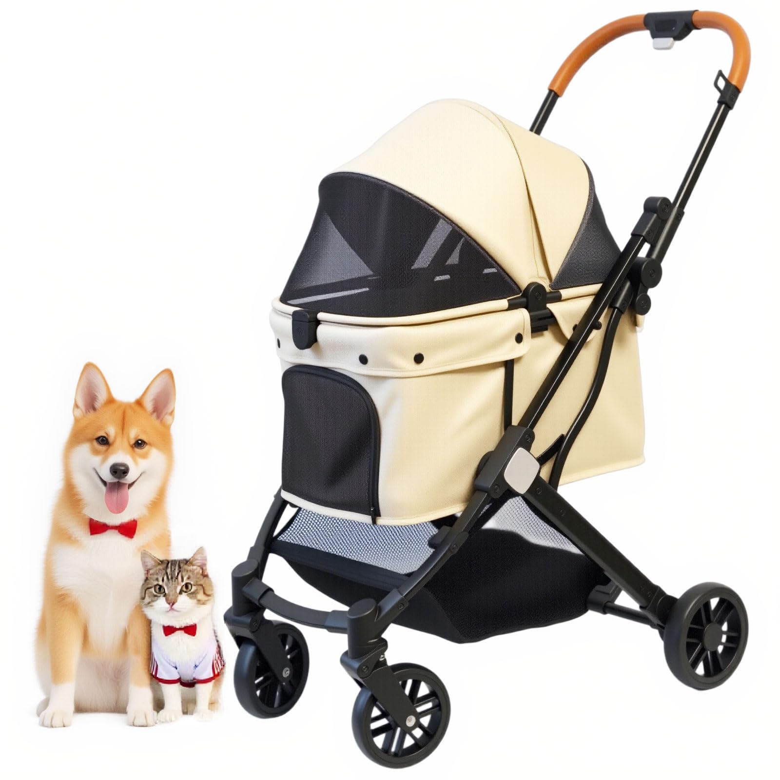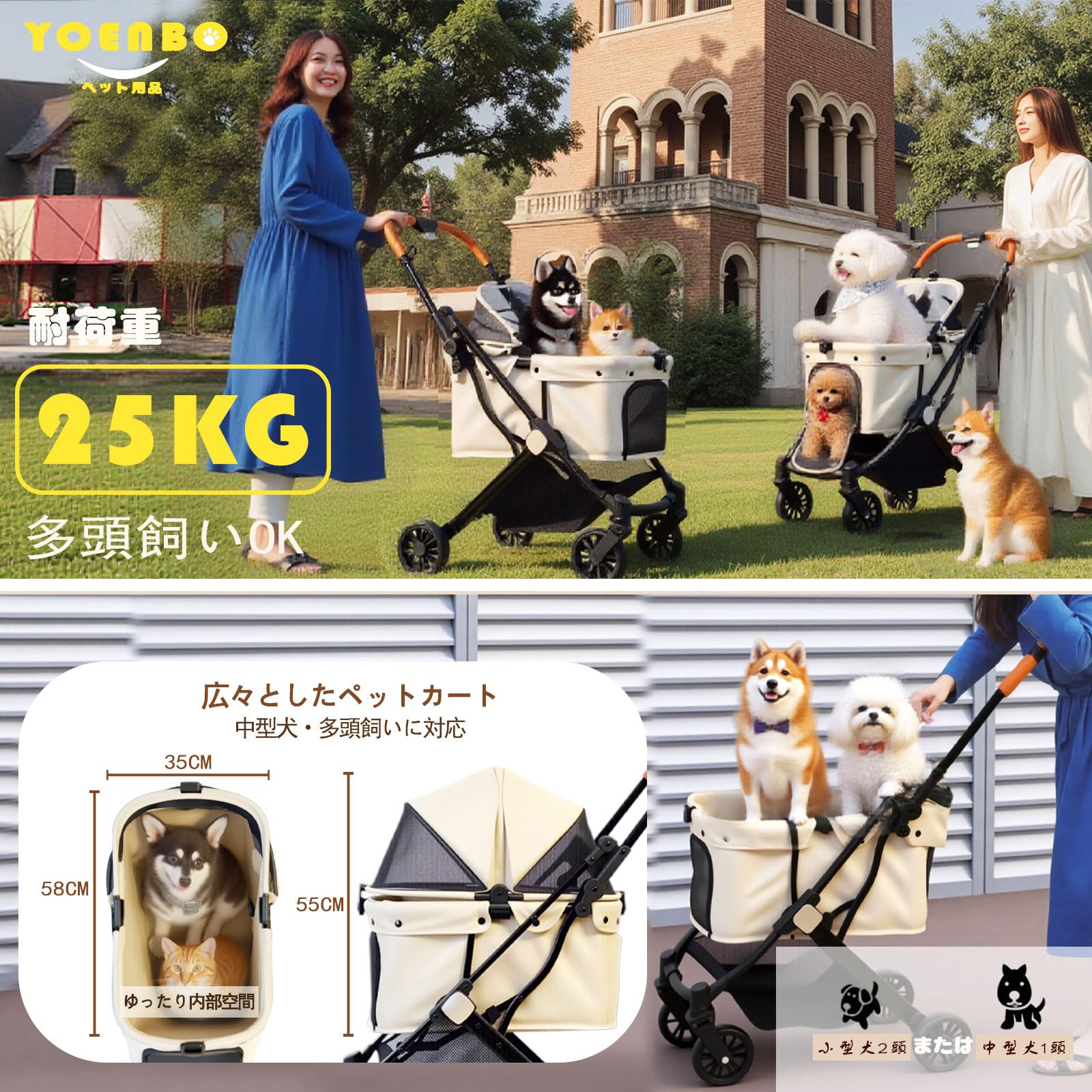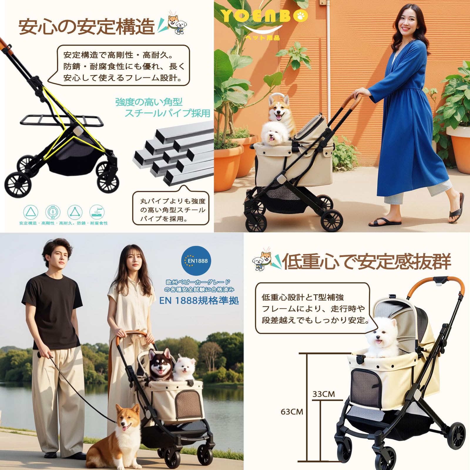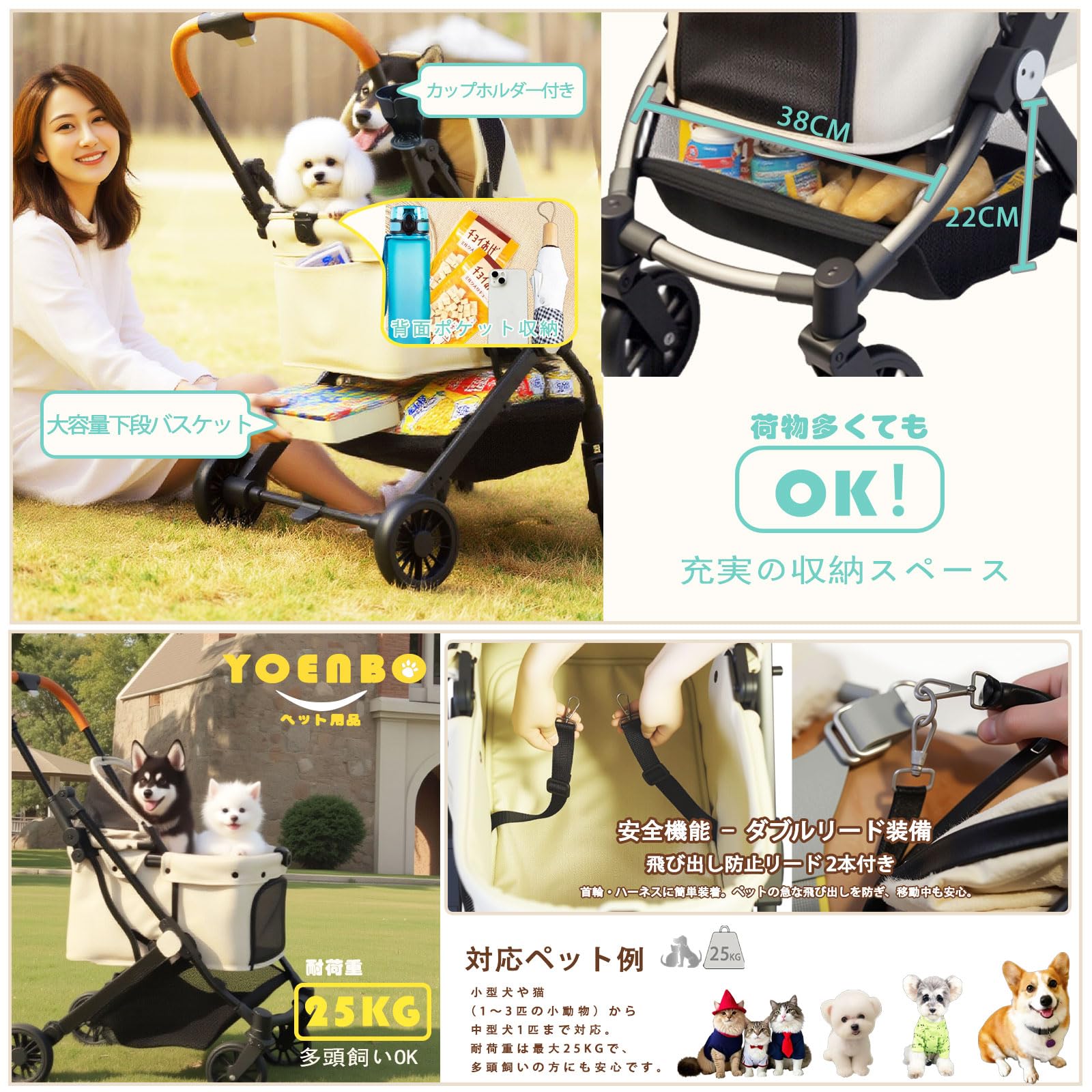 YOENBO ペットカート 小型犬 中型犬 対応 対面/背面両用式 猫 犬 カート ワンタッチ コンパクト 折りたたみ 自立式 ペットバギー 4輪 多頭対応 一体型 犬用カート 耐荷重30kg 飛び出し防止リード2本付き 組み立て簡単 散歩 お出かけ 介護用 犬猫兼用 (ベージュ)