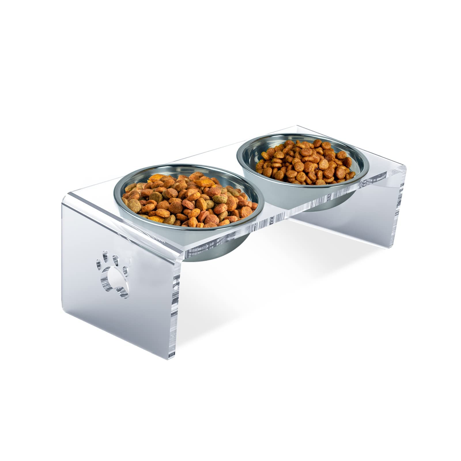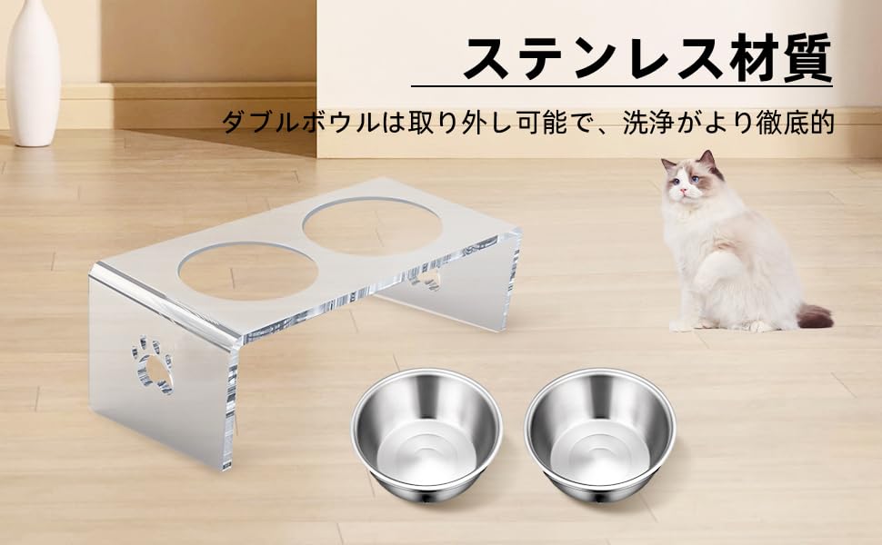 ペット用 アクリル製 ダブルボウルスタンド, ステンレス製フードボウル付き, 透明 エレガント 犬猫用 取り外し可能 食器セット