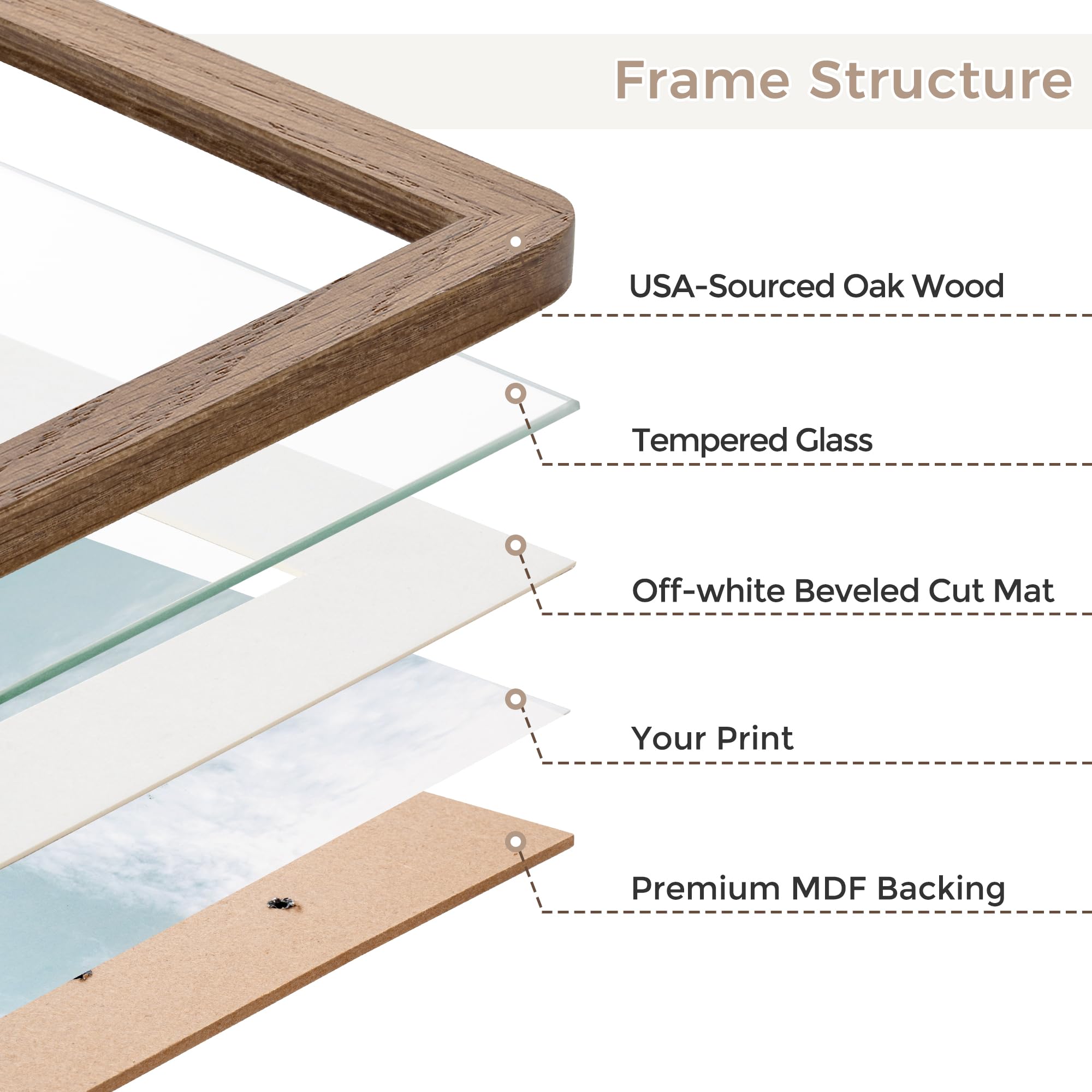 オーク無垢材 フォトフレーム 5x7インチ(はがきサイズ写真対応)マット・プレキシガラス・吊り下げ金具一式付属 ウォールナット色