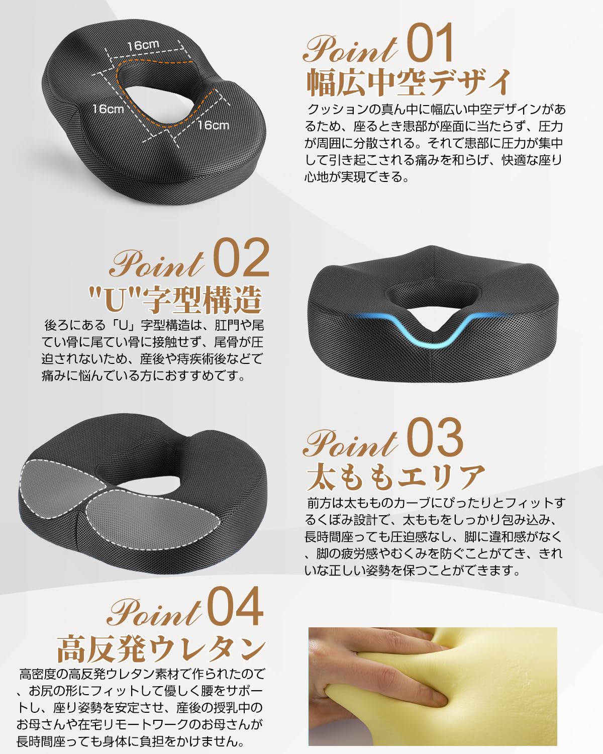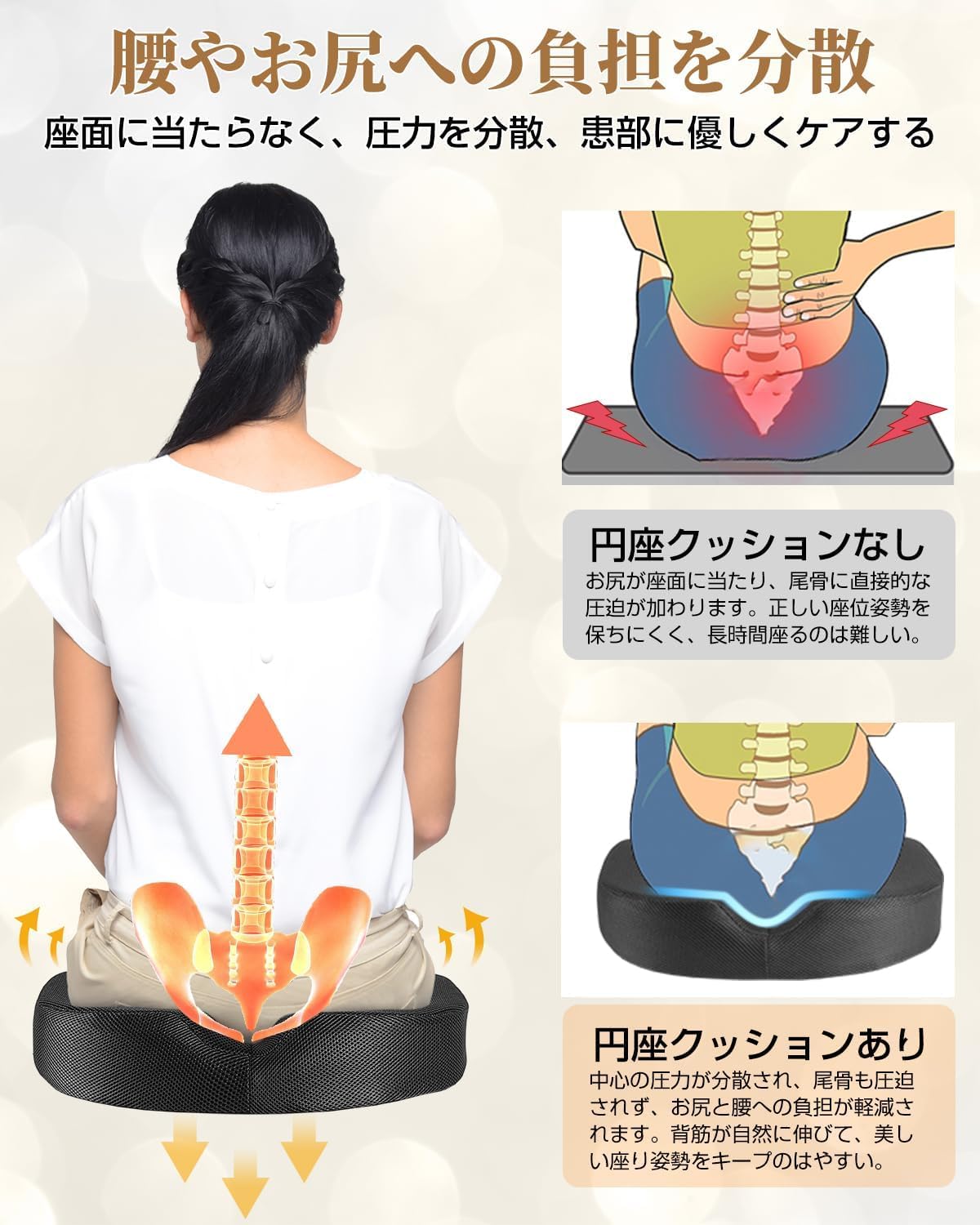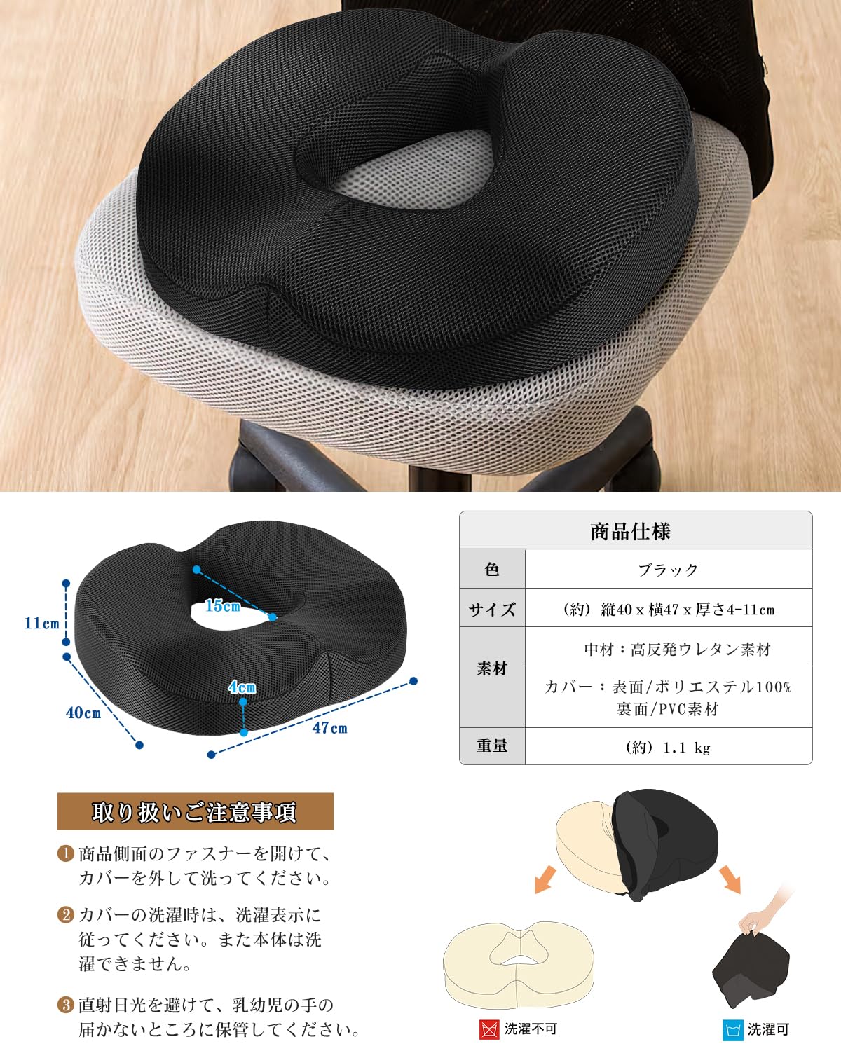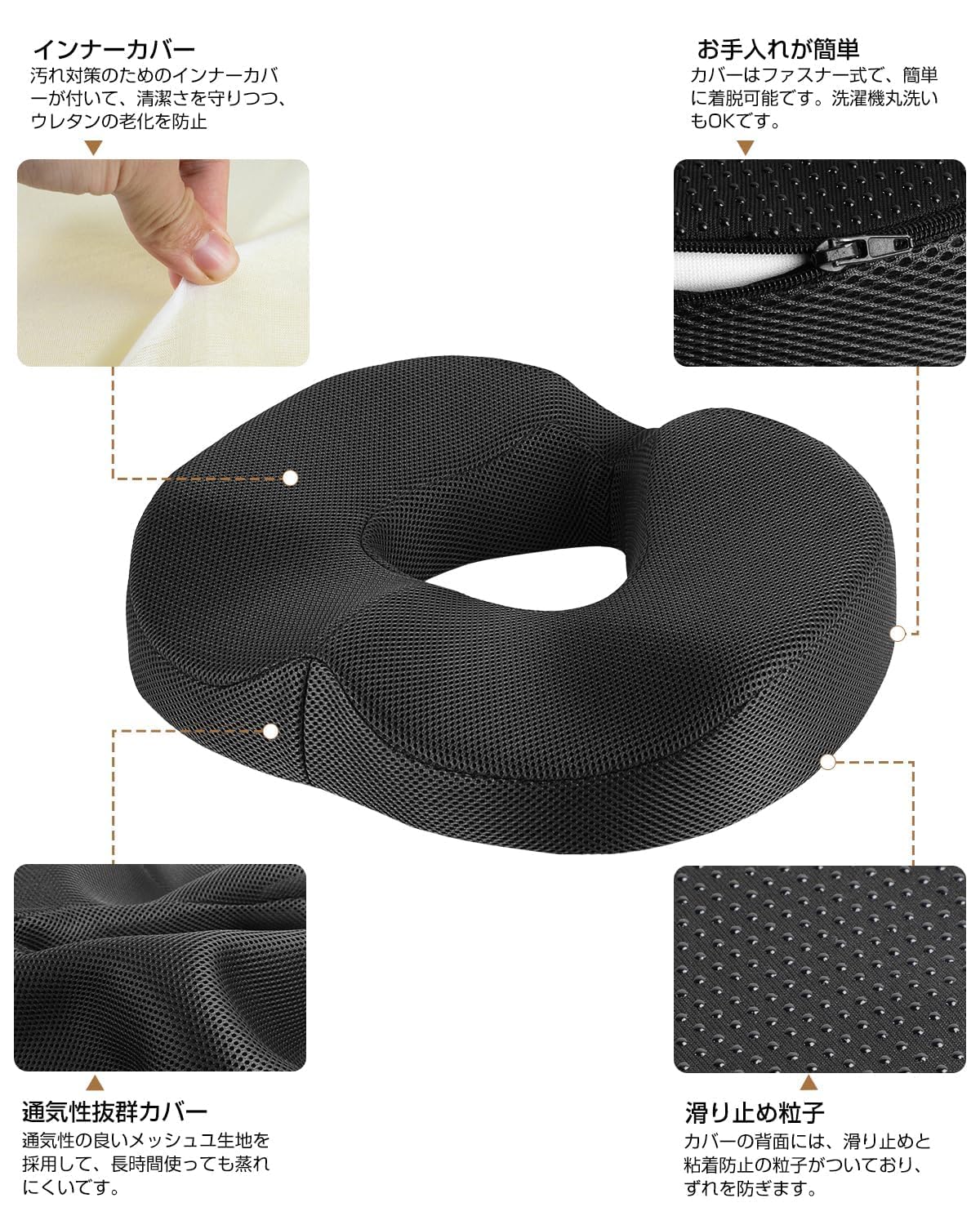 円座クッション ドーナツクッション 産後 痔 高反発: 穴あき 尾てい骨が痛くならない 椅子 座布団 フロアクッション 通気性 カバー洗える 滑り止め付き 女性 男性 誕生日プレゼント ブラック