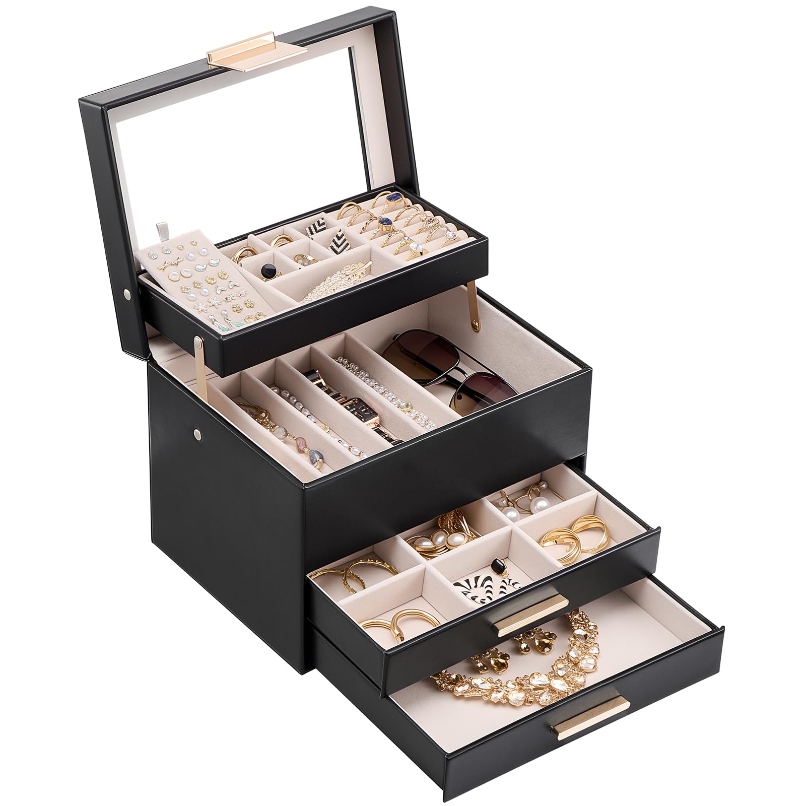 Lolalet ジュエリー整理ボックス クリアウィンドウ アクセサリー収納 ジュエリーオーガナイザー 指輪 ピアス 蓋 引き出し付き 防塵 -ブラック