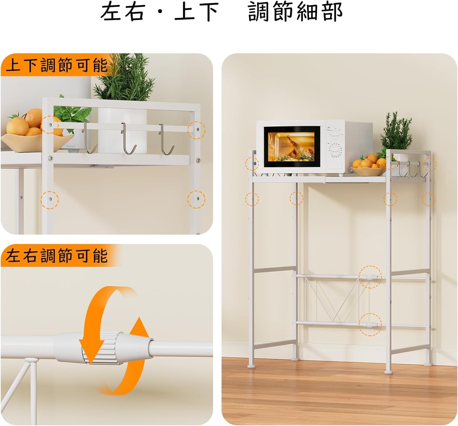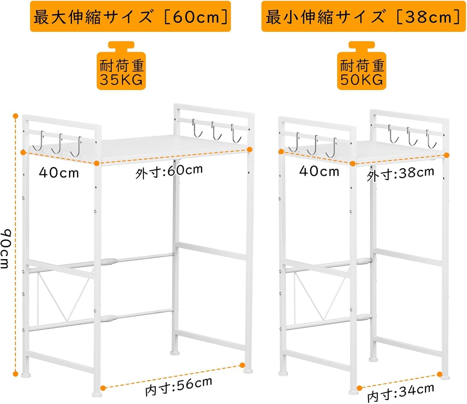 レンジ上ラック キッチンレンジ 伸縮式 幅(40-60cm)トースター 棚板高さ調節可 電子レンジ 台 収納 耐荷重50kg フック6つ付き お洒落 収納ラック (白)