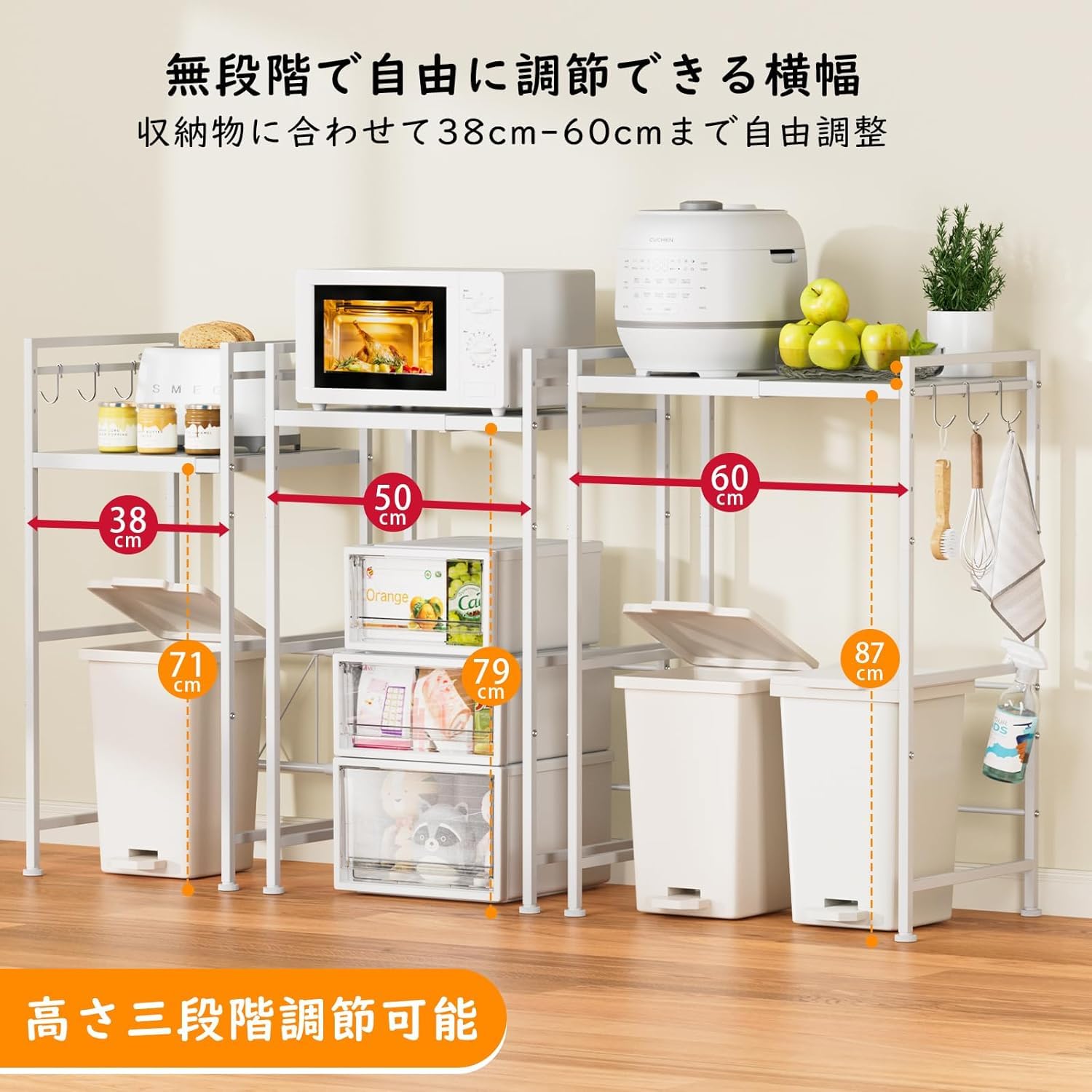 キッチンラック レンジラック 幅38-60cm ゴミ箱上ラック スチール製 伸縮式 冷蔵庫上収納 キッチン多機能収納棚 炊飯器置き場 塵箱上 kitchen rack 組み立て式 (白)