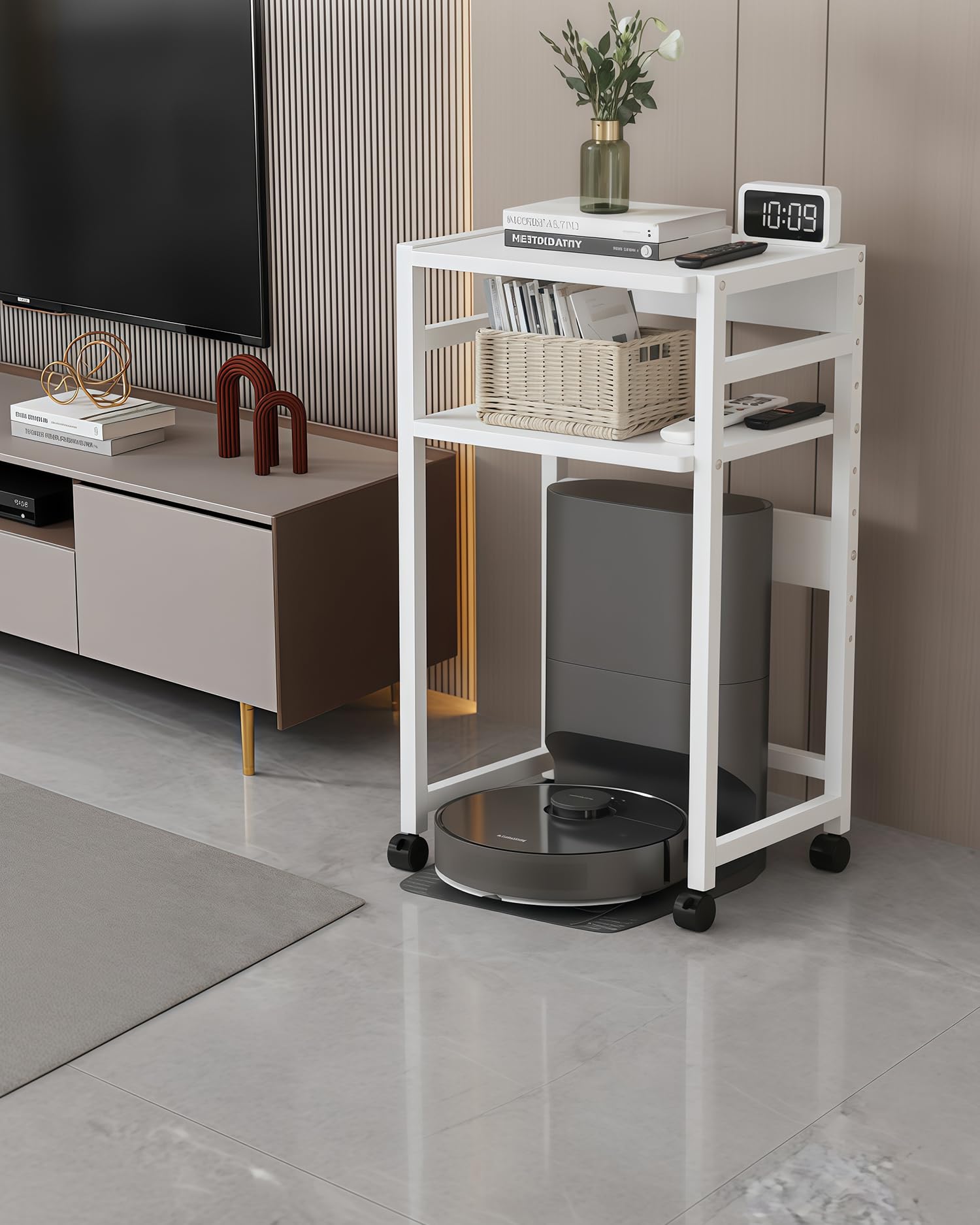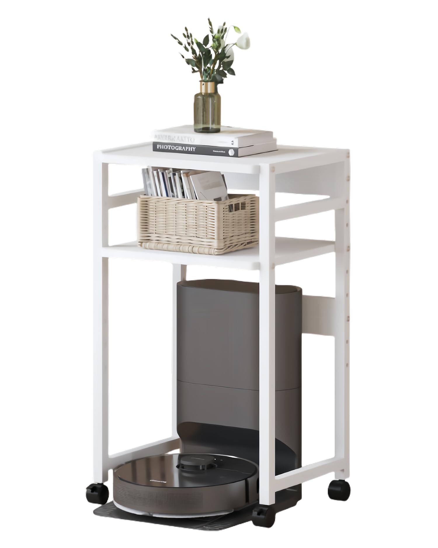 SUOWUKS ロボット掃除機収納ラック 多サイズ対応 お掃除ロボット置き台 高さ調節可能収納ラック サイドテーブル 落下防止 ベッドサイドテーブル キャスター付き 移動便利 空間活用ラック 寝室 リビングルーム ソファ ベッドサイド 室内収納 移動便利 (ホワイト, 幅49CM) [並行輸入品]