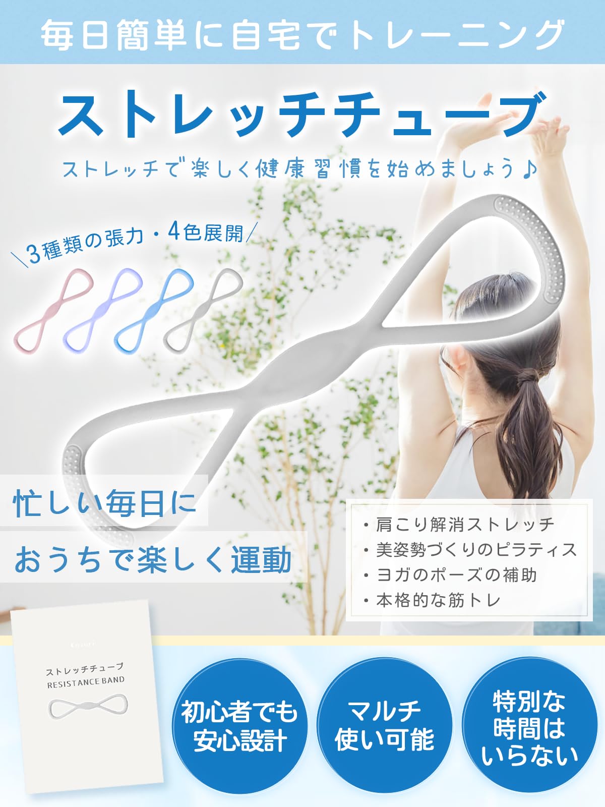 ストレッチチューブ ストレッチバンド 【3種類の張力・4色展開・初心者/中級者/上級者】 トレーニング チューブ 筋トレ チューブ 肩 エクササイズバンド 背筋 肩甲骨 肩こり 防止 猫背 姿勢 矯正 ストレッチ チューブ フィットネス バンド 筋トレ ながらストレッチ 自宅 シェイプ 超高弾性 滑り止め