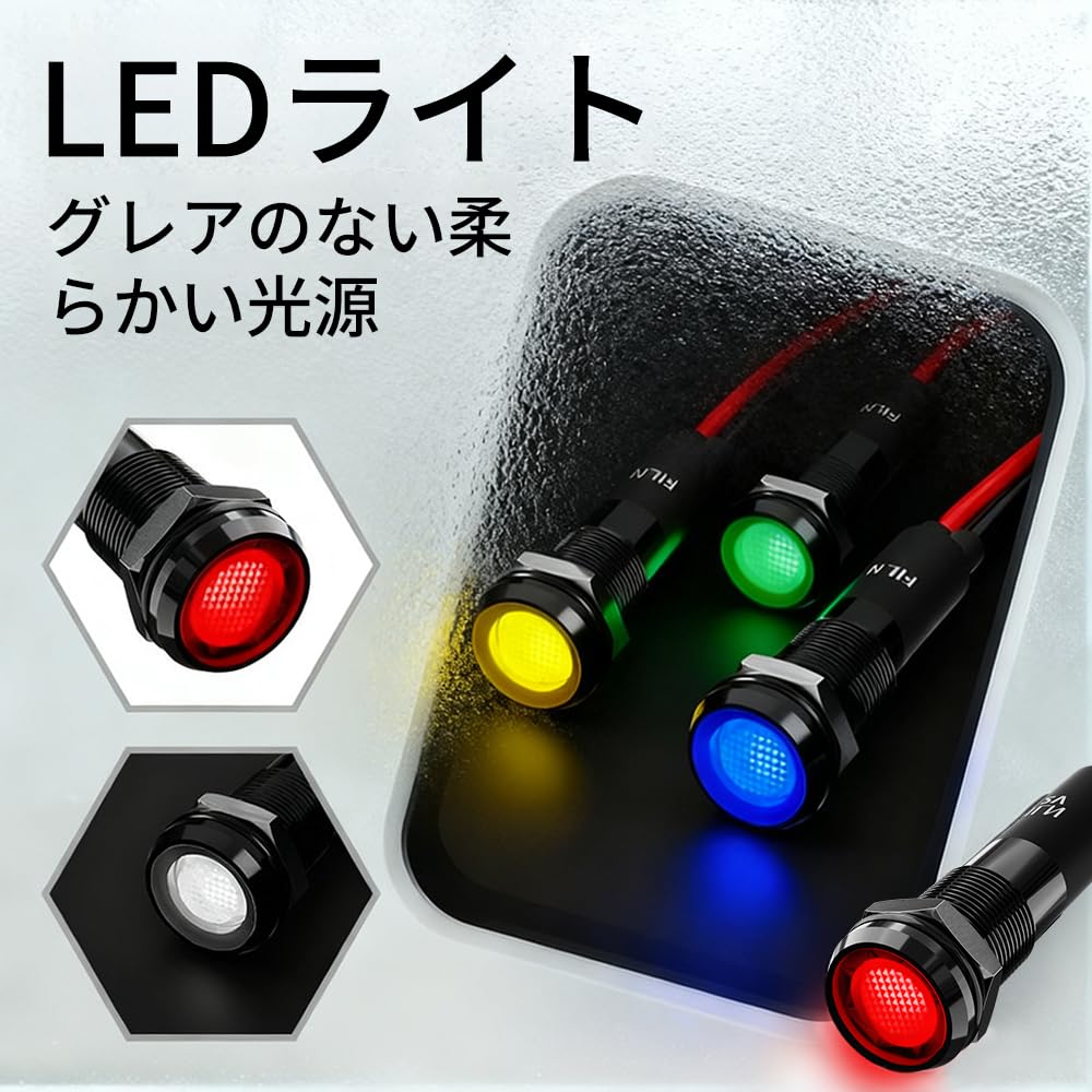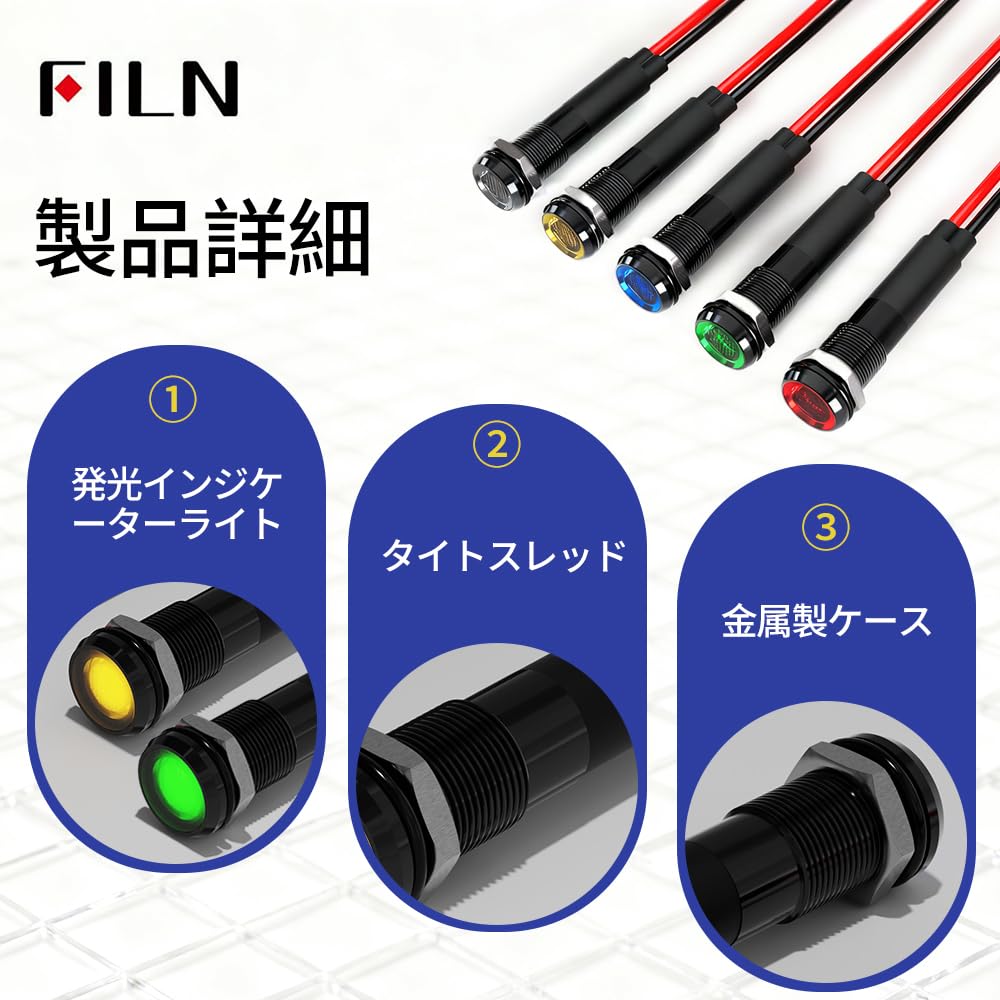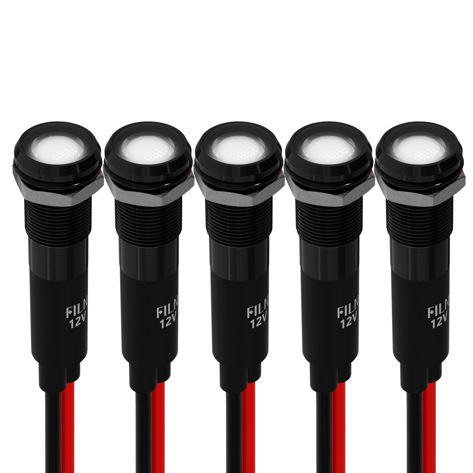 FILN 5個8mm 12-24V 表示灯LEDライト、車内用小型LEDライト、防水信号ランプ パイロットダッシュ方向指示灯 トラック・ボート用 配線付き-亜鉛アルミニウム合金(白)