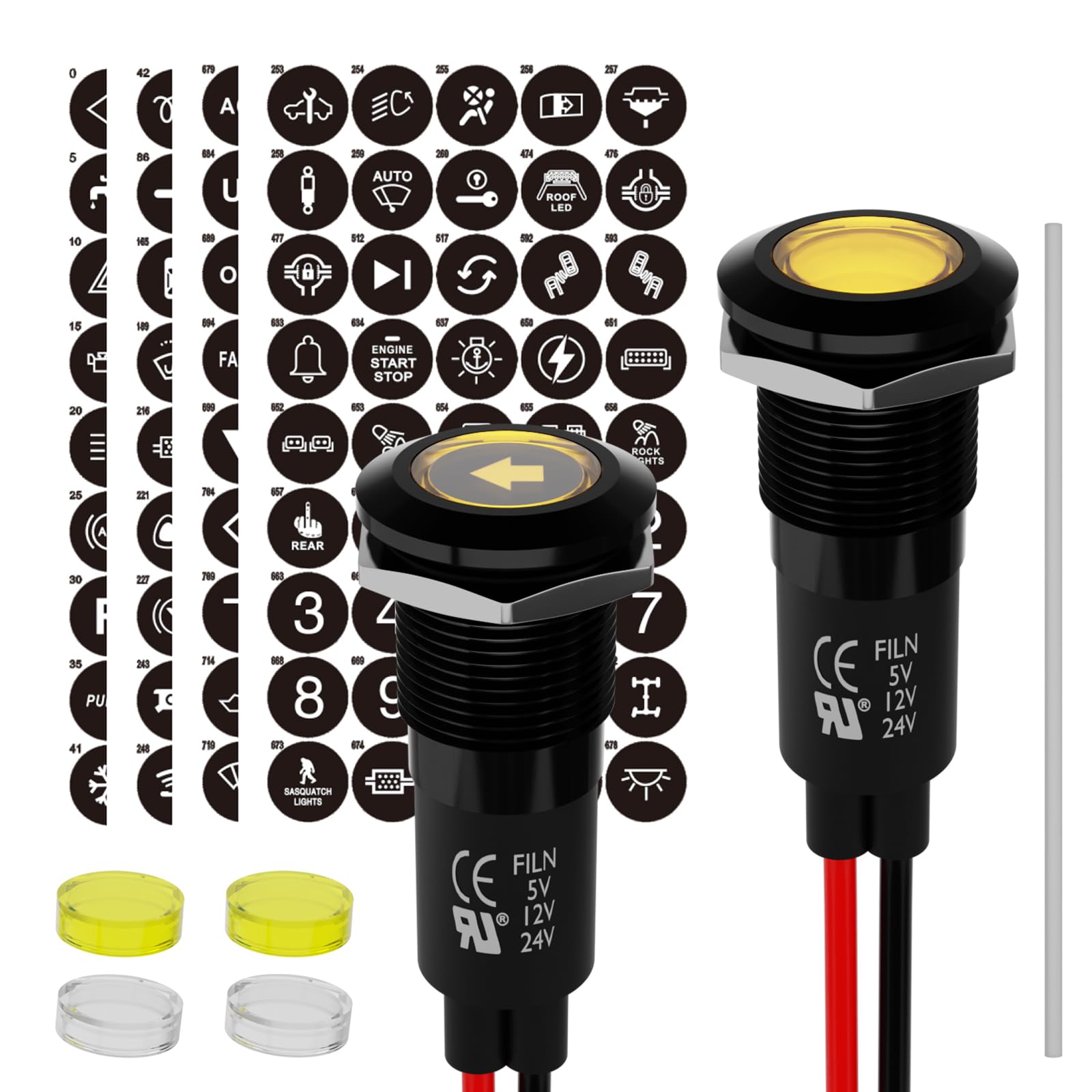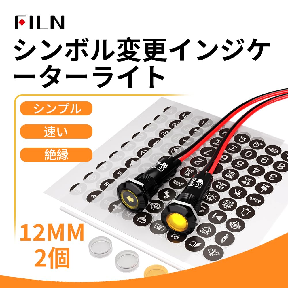 FILN 2個12mm 12-24V自動車用LEDランプ、自動車内装用小型LEDランプ、185個の交換可能符号を搭載、防水信号ランプ、ナビゲータ、ダッシュボード、指向車、電線付きトラック船(黄)