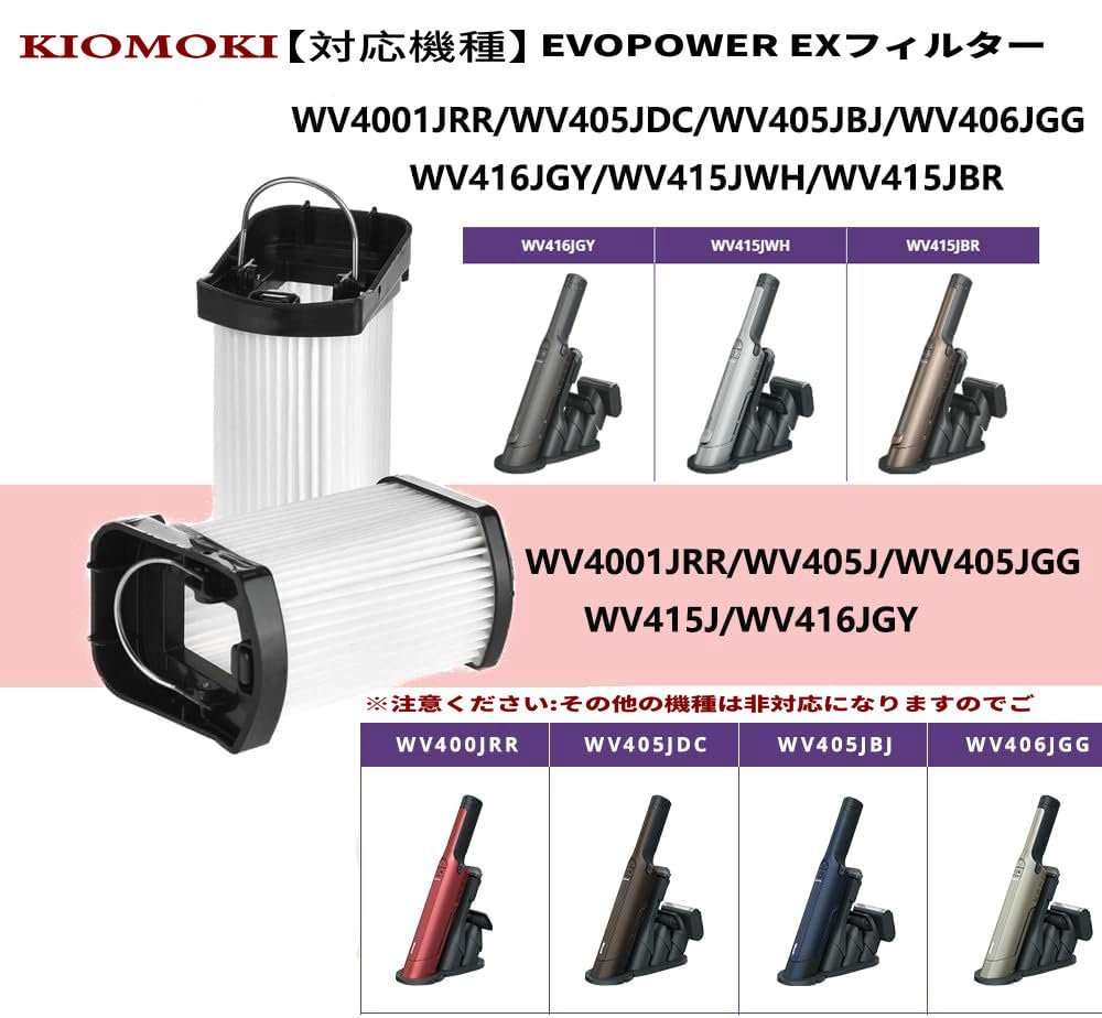 【対応機種】:EVOPOWER EX WV400J、WV405J、WV406J、WV415J、WV416J、WV310JMV 【型番】:XFFWV400J【パッケージ内容】:フィルター:3個;クリーニングブラシ:1個。EVOPOWER EX用の取り外して水洗い可能なフィルター。 1か月に一度の洗浄をお薦めしています
