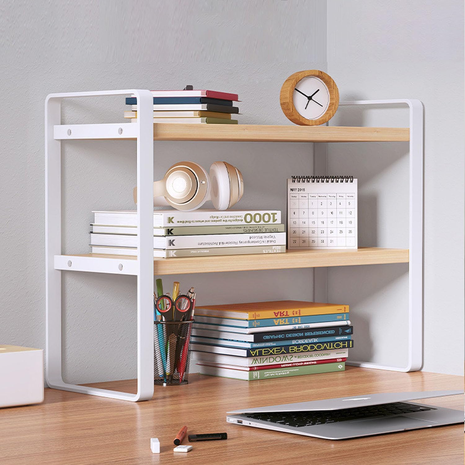 LIKENNY 卓上収納棚 デスク上 本棚 ハンガー付き 2段式 キッチン収納 調味料置き 小型棚 机上用 パソコン台 PCスタンド 高さ調整可能 43×20×43cm (ホワイト)