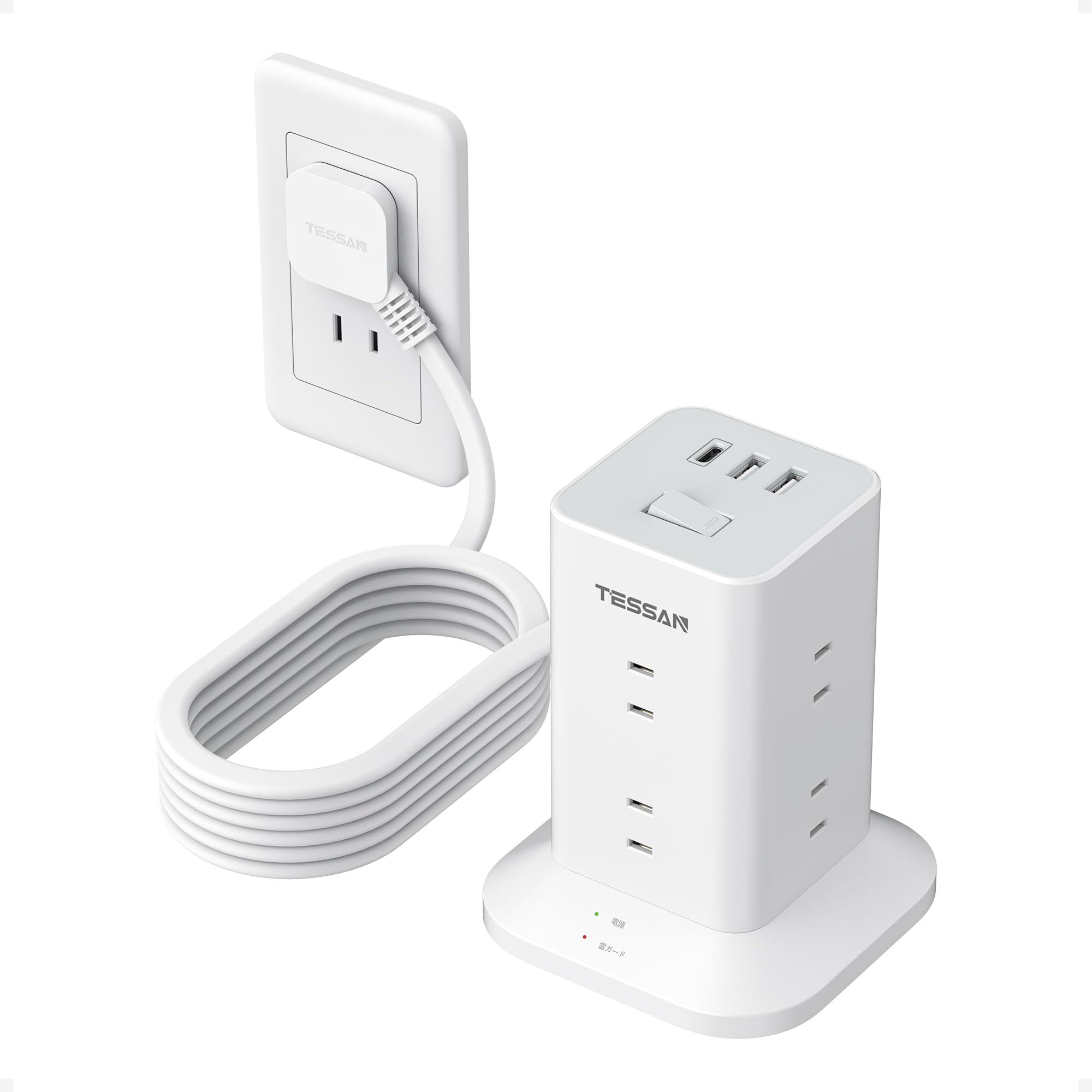電源タップ タワー型 薄型プラグ 延長コード 1m 8個AC コンセント 3USBポート付き 180°スイングプラグ TESSAN テーブルタップ たこあしコンセント タコ足配線 マルチ OA 雷ガード 一括スイッチ 省エネ mini型