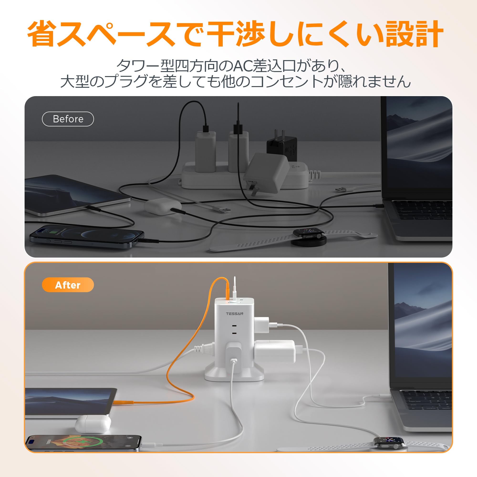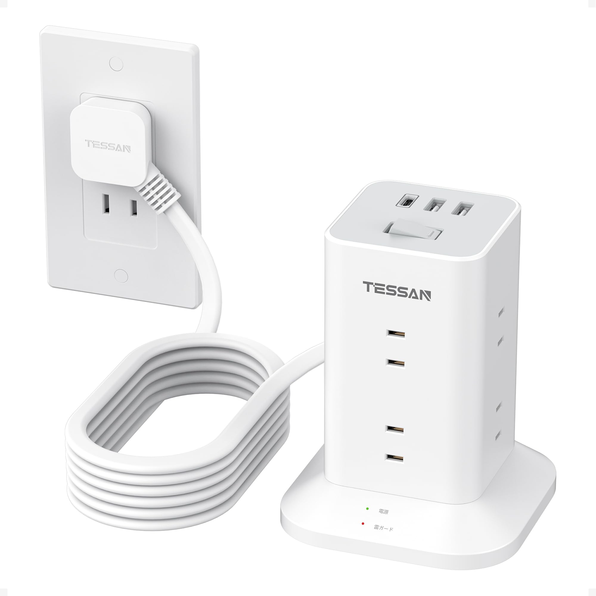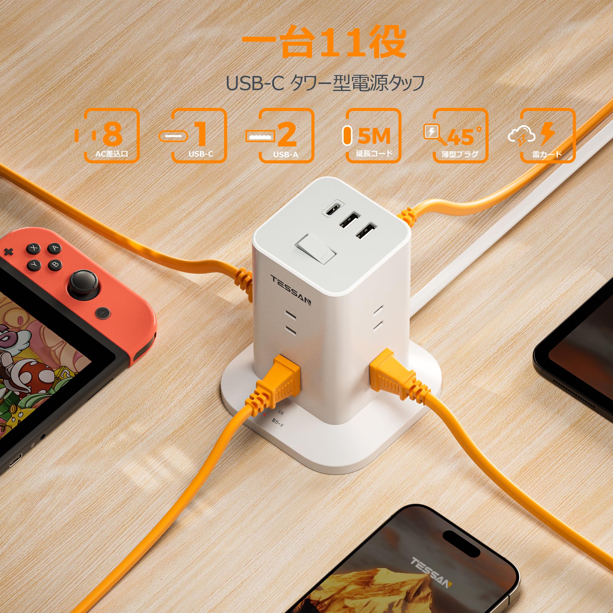 電源タップ タワー 延長コード 5m 8個AC コンセント 3USBポート付き 180°スイングプラグ TESSAN 延長コンセント 雷ガード マルチ 蛸足コンセント タコ足配線 テーブルタップ oa mini型
