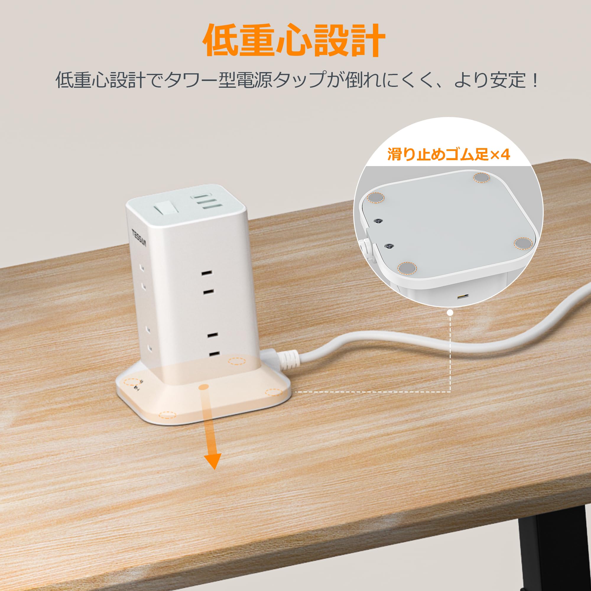 電源タップ タワー 5m 延長コード タコ足配線 12個AC口 2USB-Aと2USB-Cポート付 180°スイングプラグ 一括スイッチ 過負荷保護 雷ガード NTONPOWER テーブルタップ 机の下固定可 蛸足コンセント オフィス 会社 部屋 家庭用 ホワイト