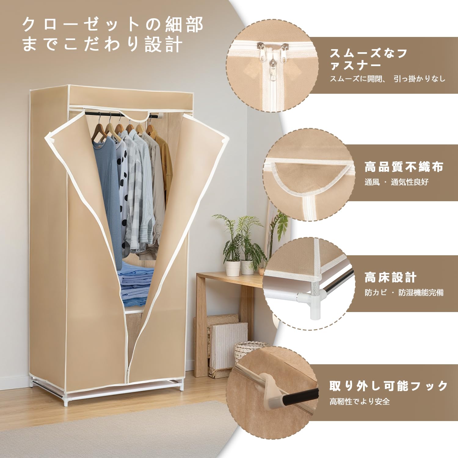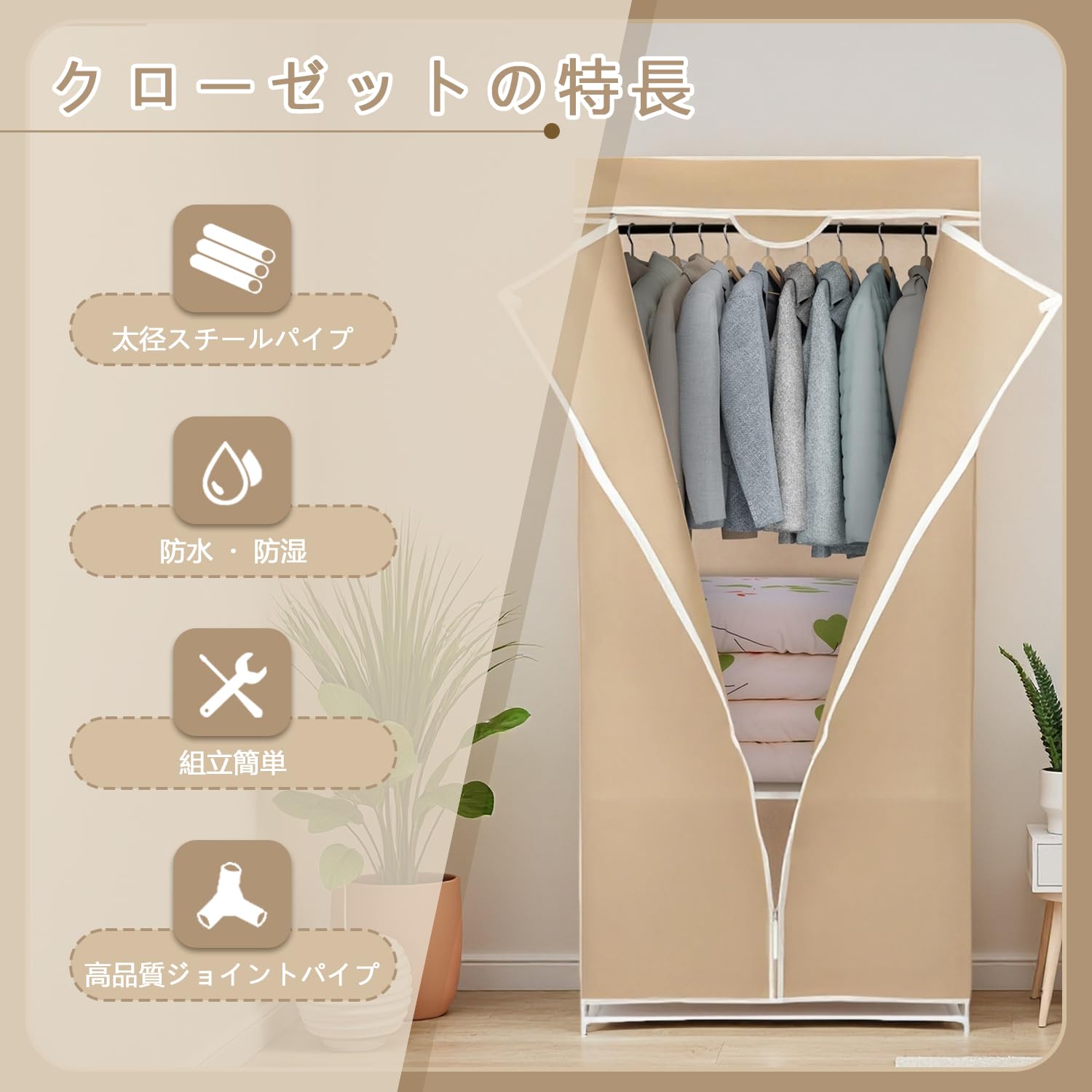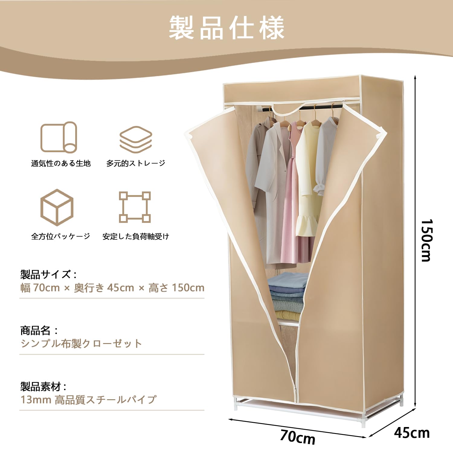 SUKIZUKI ワードローブ クローゼットハンガー カバー付き 収納棚 衣類収納ラック 幅150CM×奥行45CM×高さ170CM シンプル ハンガーラック 整理タンス 洋服掛け 大容量 組み立て式 防水 防塵 防汚