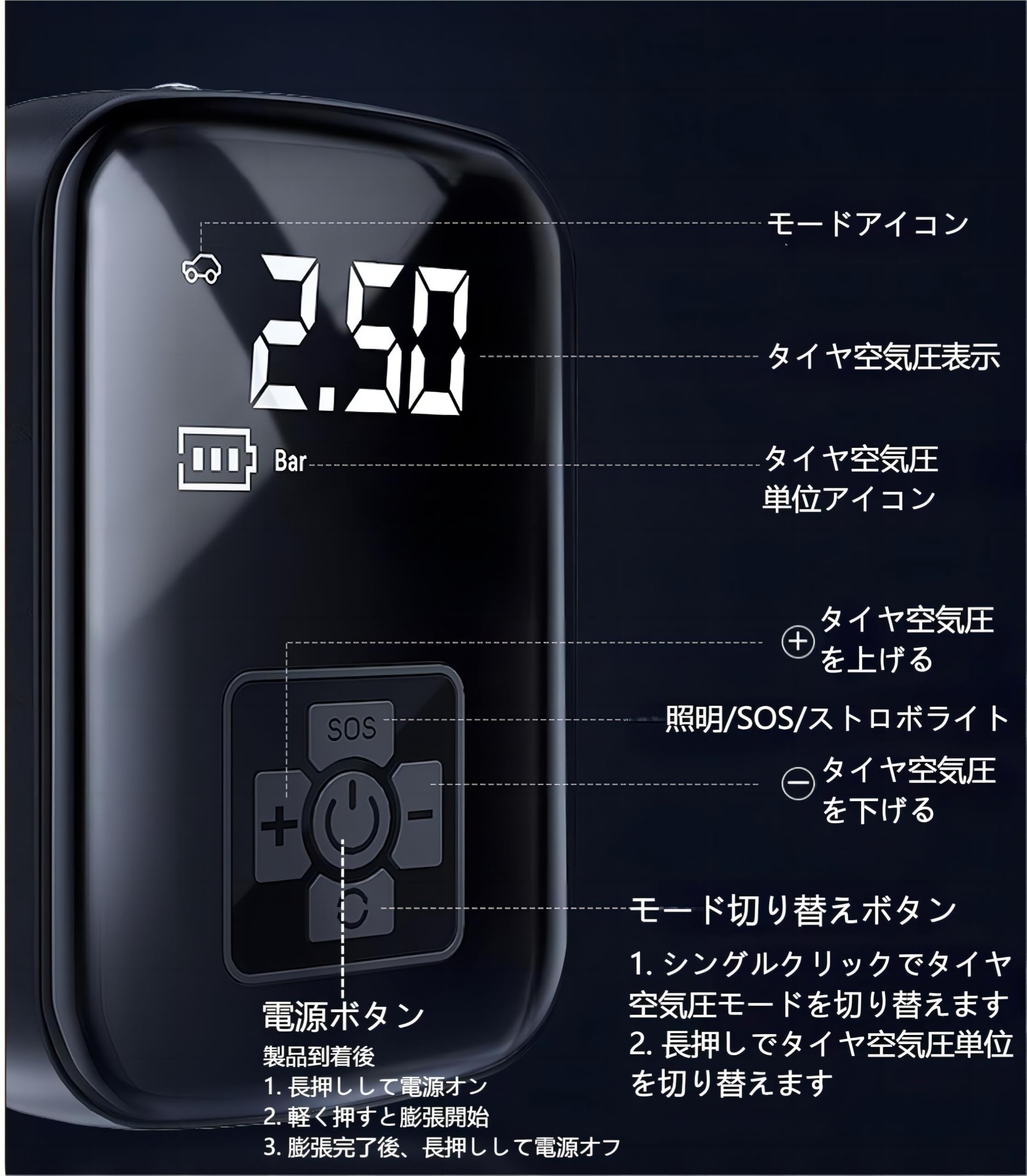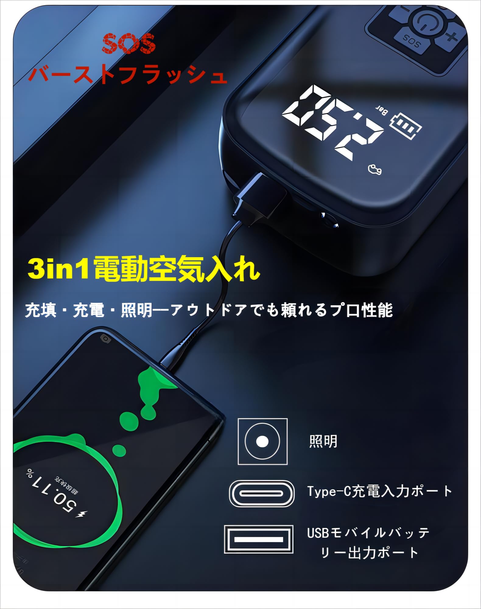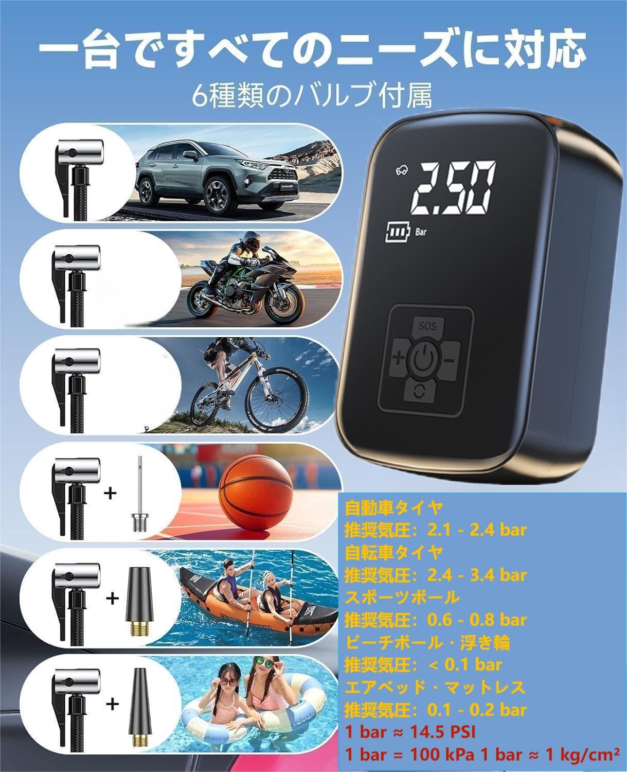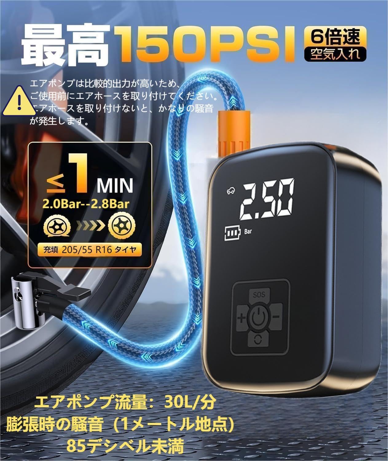 【Fanwer】【大功率&高速充填】デジタル空気入れ 充電式 電動空気ポンプ 車/バイク/自転車/ボール対応 自動停止 携帯 緊急用 タイヤ膨らまし器 アウトドア 家庭用 5分充填 強力モーター セット (静音モデル)