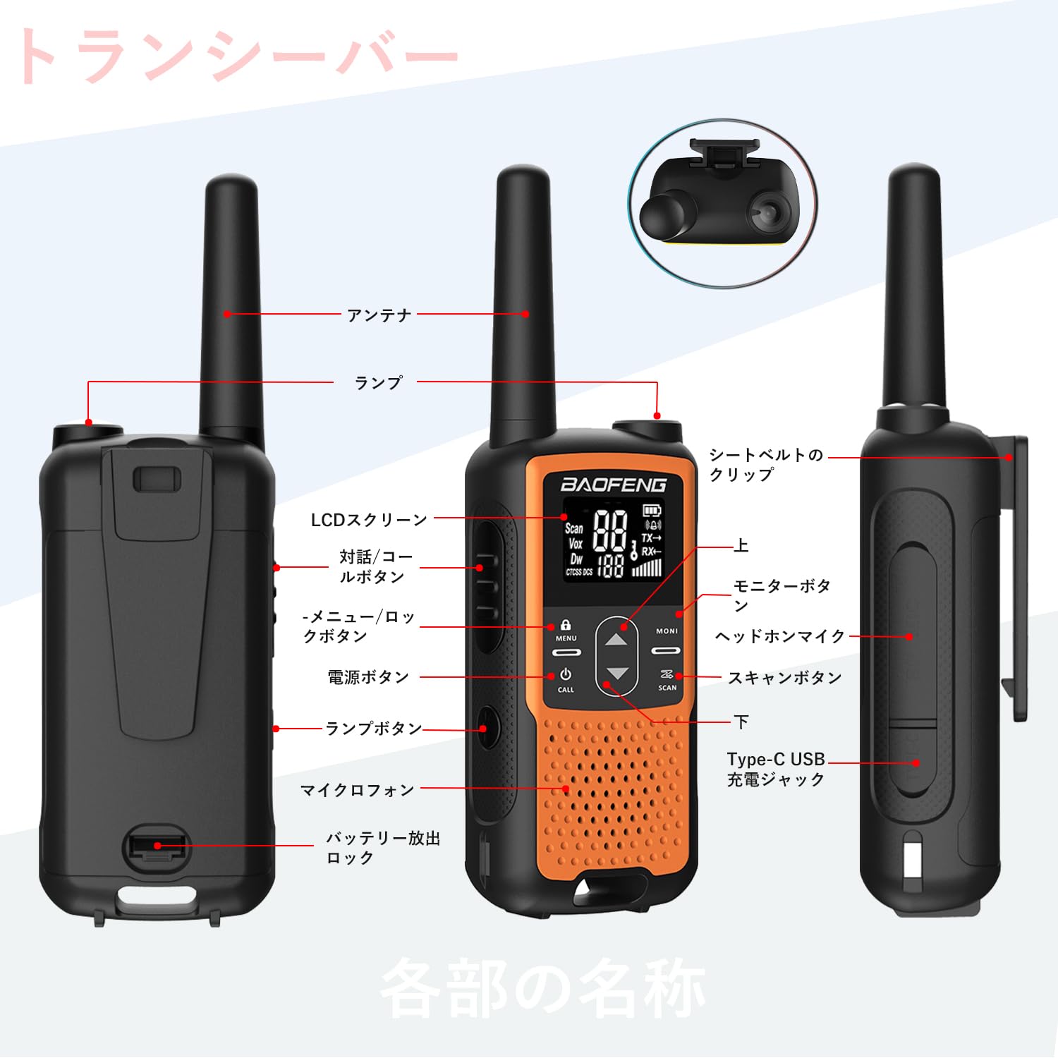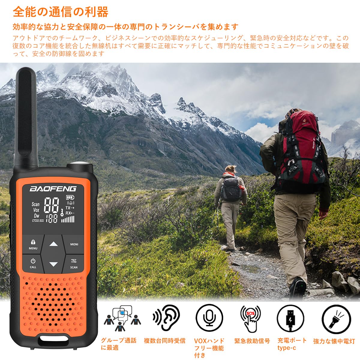 トランシーバー 無線機 免許不要 特定小電力 充電式 簡単操作 災害·地震 緊急対応 1200mAH 充電式バッテリー・USB充電ケーブル・ベルトクリップ付属 2台セット