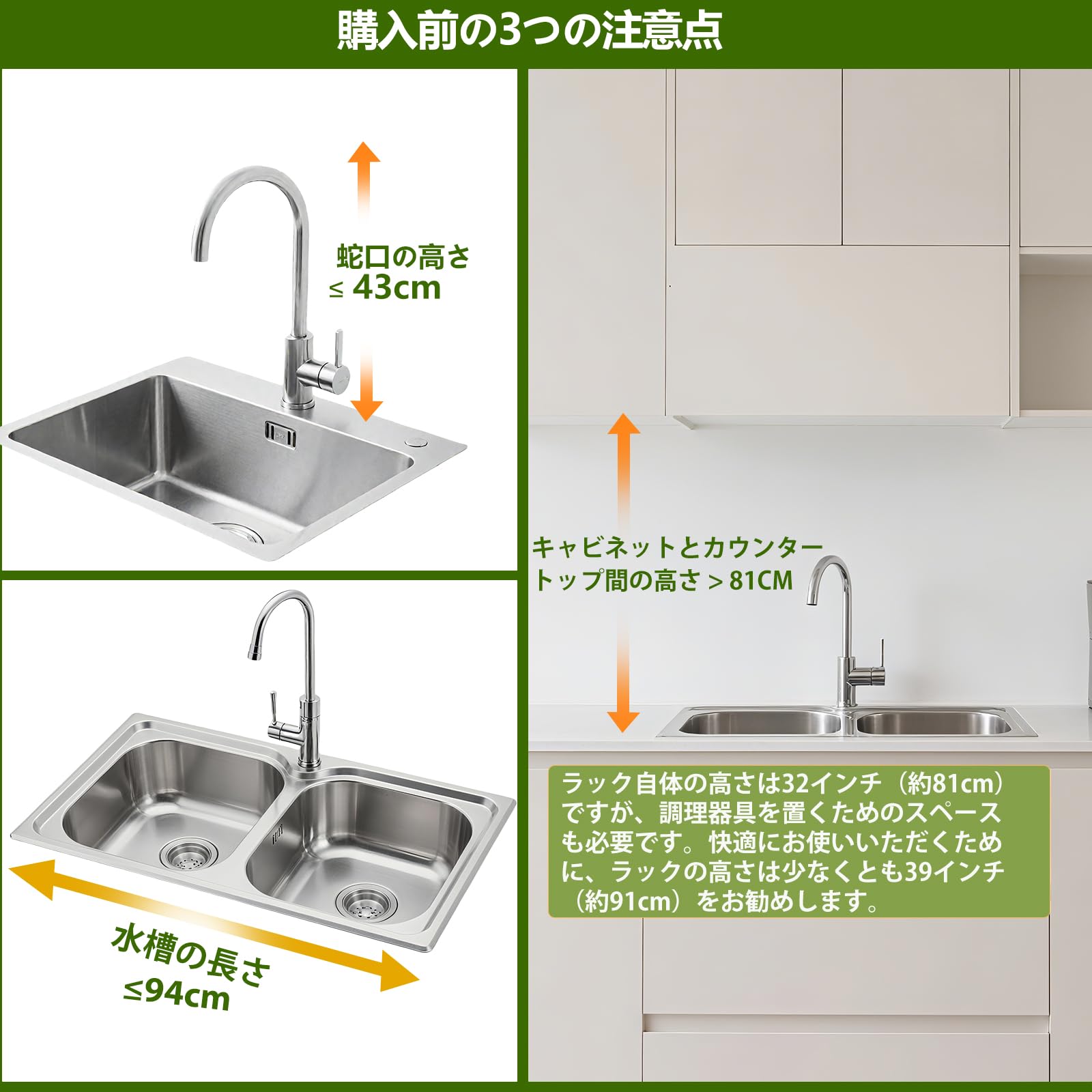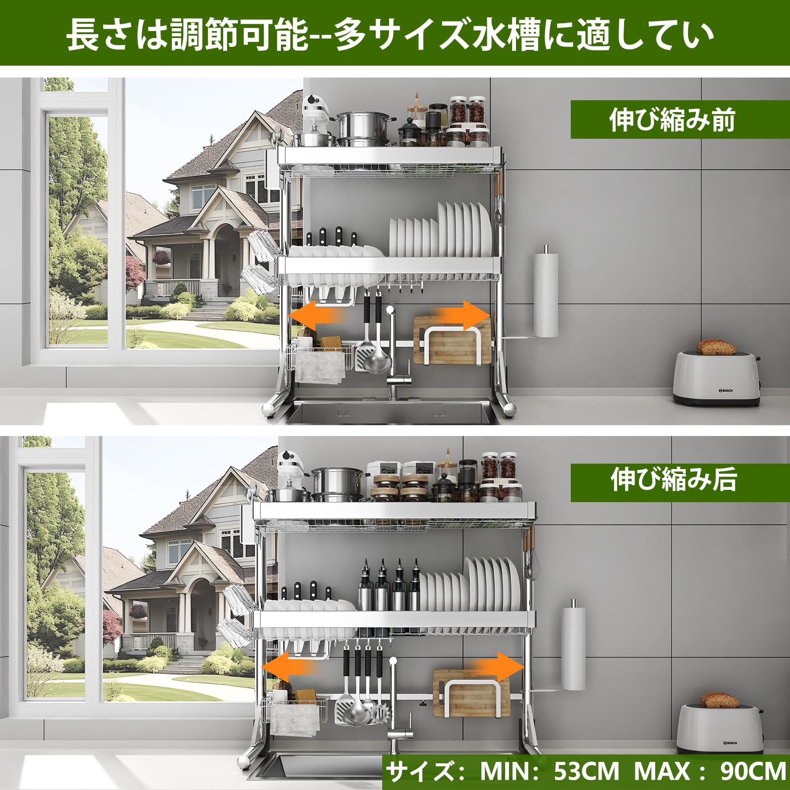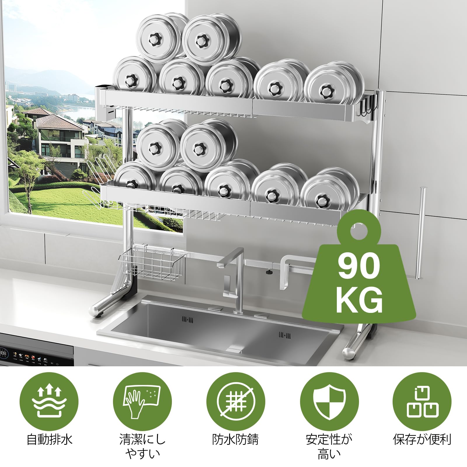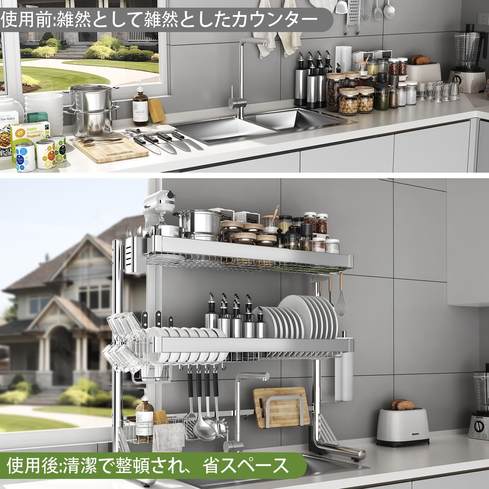 Zilnox 水切りラック シンク上 ステンレス 食器 水切り かご ラック 大容量 突っ張り つっぱり式 キッチン 省スペース 多機能収納 洗い物ラック シルバー 幅78x奥行30.5x高66.5-105CM