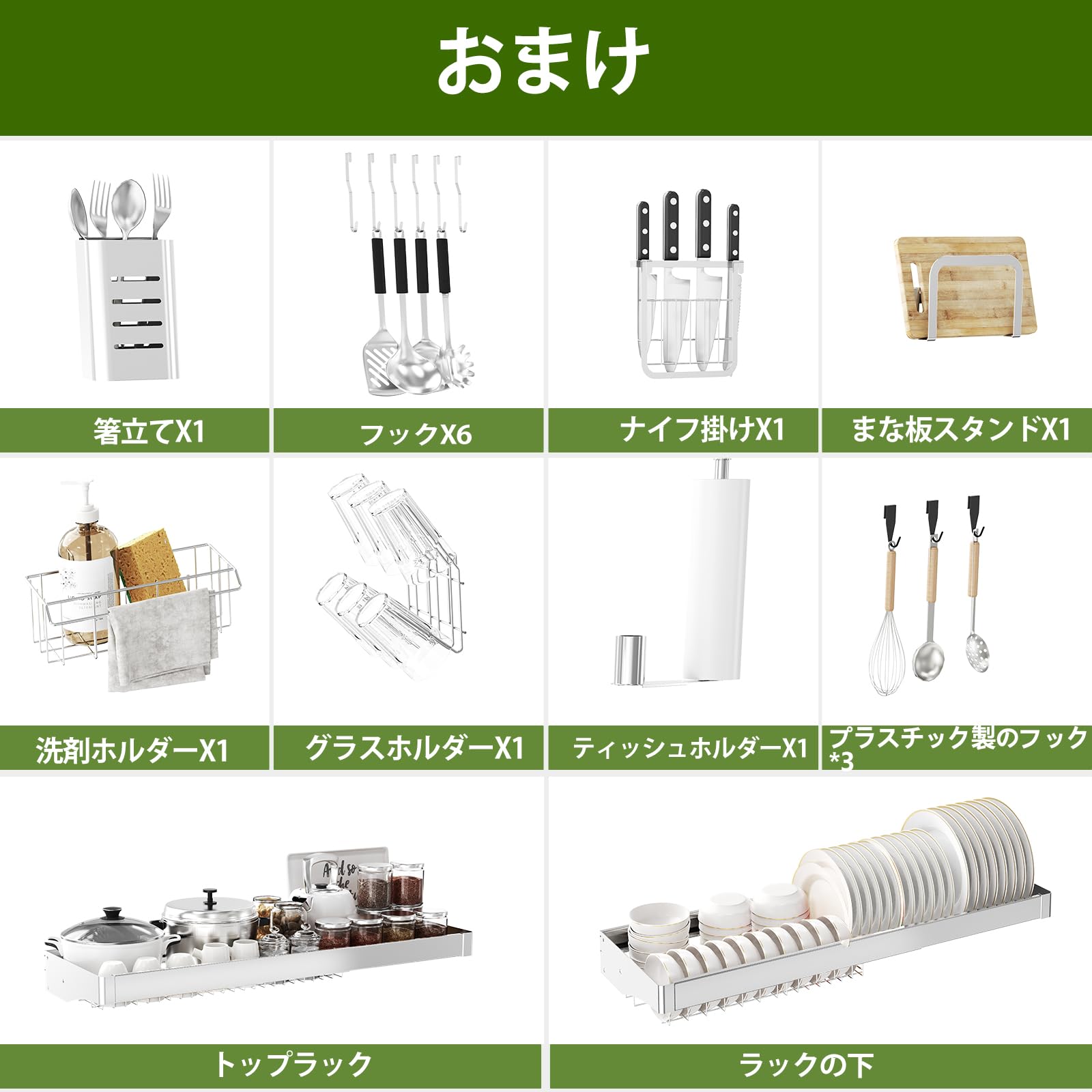 Sakugi シンク上水切りラック 食器乾燥かご 食器置き場 伸縮式【幅80〜100cm】304ステンレス製 錆びない 自動排水 多機能 包丁・スタンド付き キッチン収納 ラック 組み立て簡単(ホワイト)