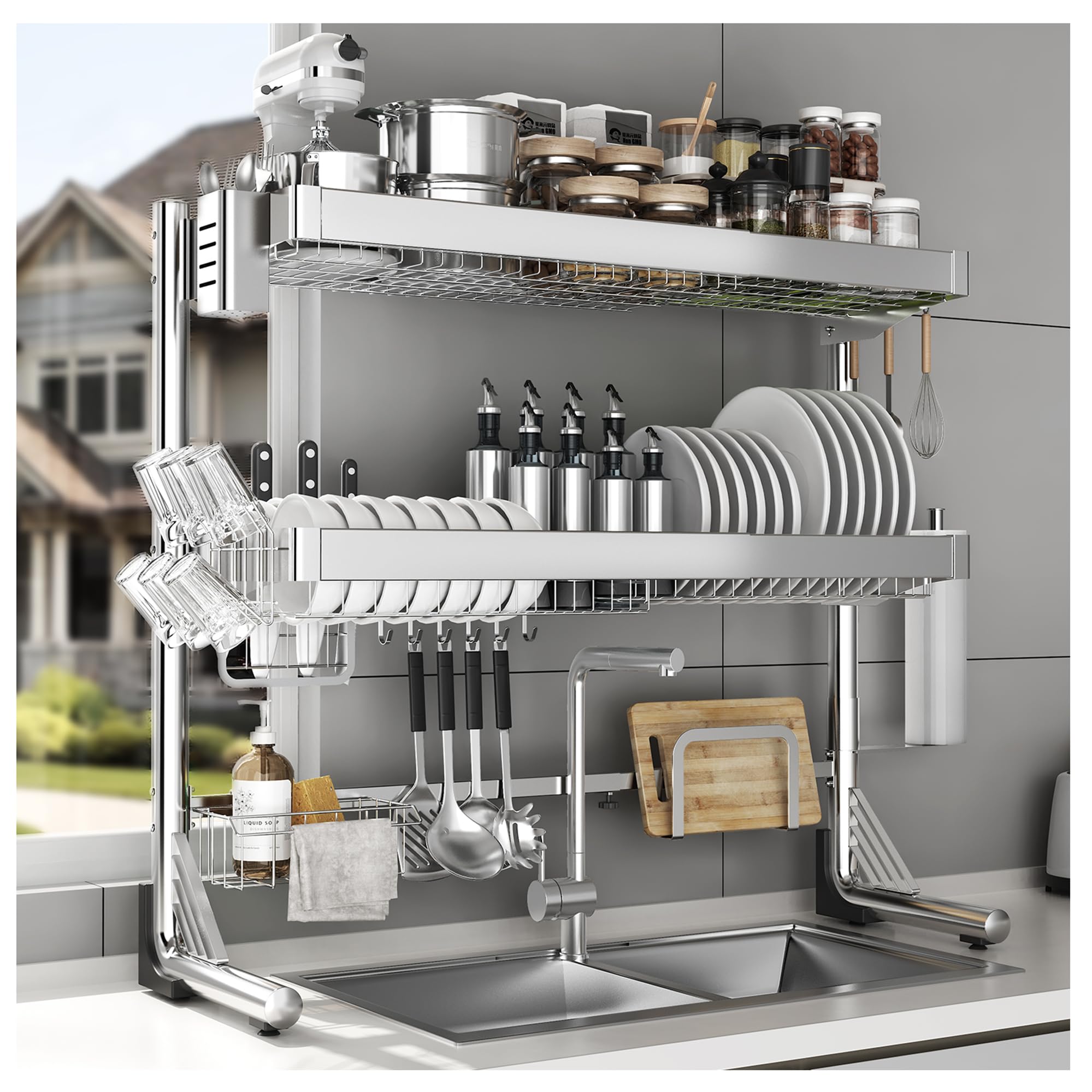 Sakugi 大型二層食器ラック - 高容量ステンレス製ディッシュドライヤー、効率的な排水設計、キッチン用