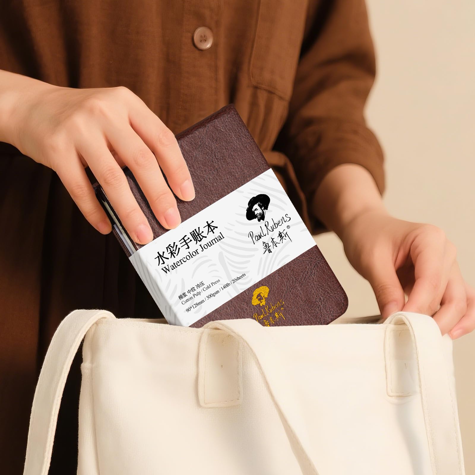 Lightwish 水彩日記帳 綿100% 水彩紙 195 x 130mm 20枚 300g 細目 無酸性 水彩絵の具、グワッシュ、アクリル用画材(茶色のカバー)
