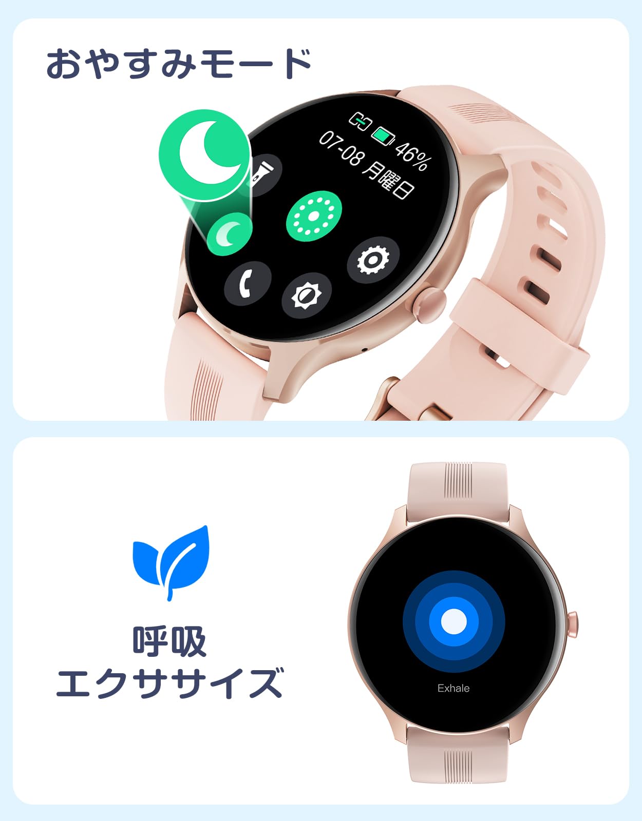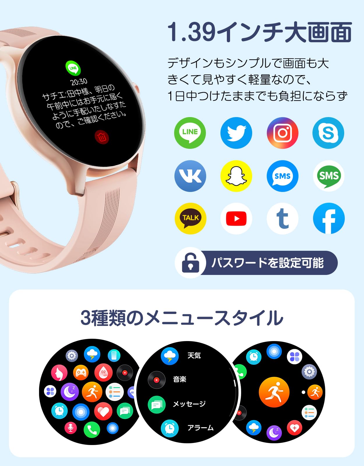 HUAKUA スマートウォッチ レディース iPhone アンドロイド対応 通話機能付き 通話音声調整可 一発消音 Smart Watch 1.39インチ大画面 丸型 腕時計 歩数計 着信通知 天気予報 IP68防水 長持ちバッテリー 長座注意 スマート探す TELEC認証済み