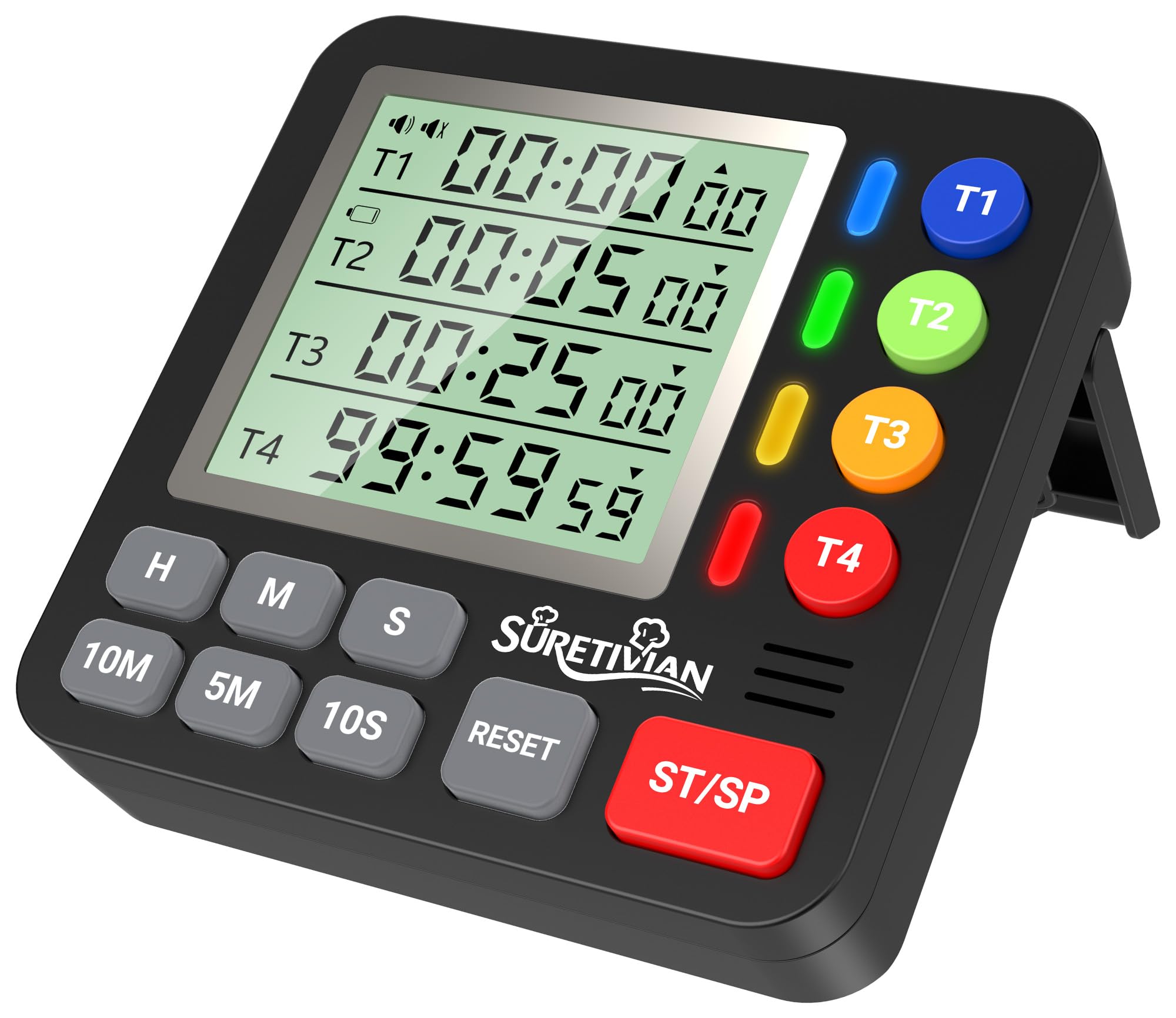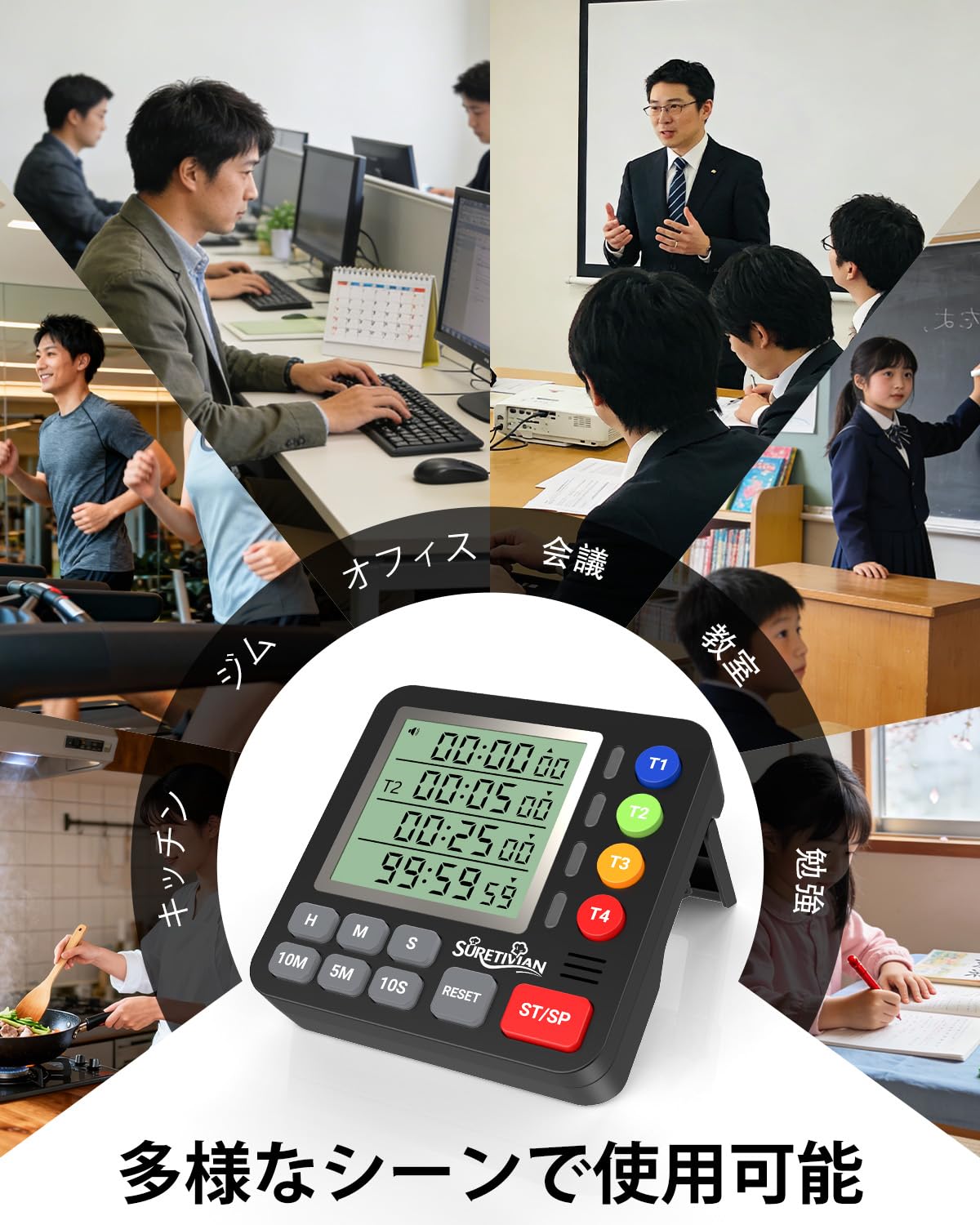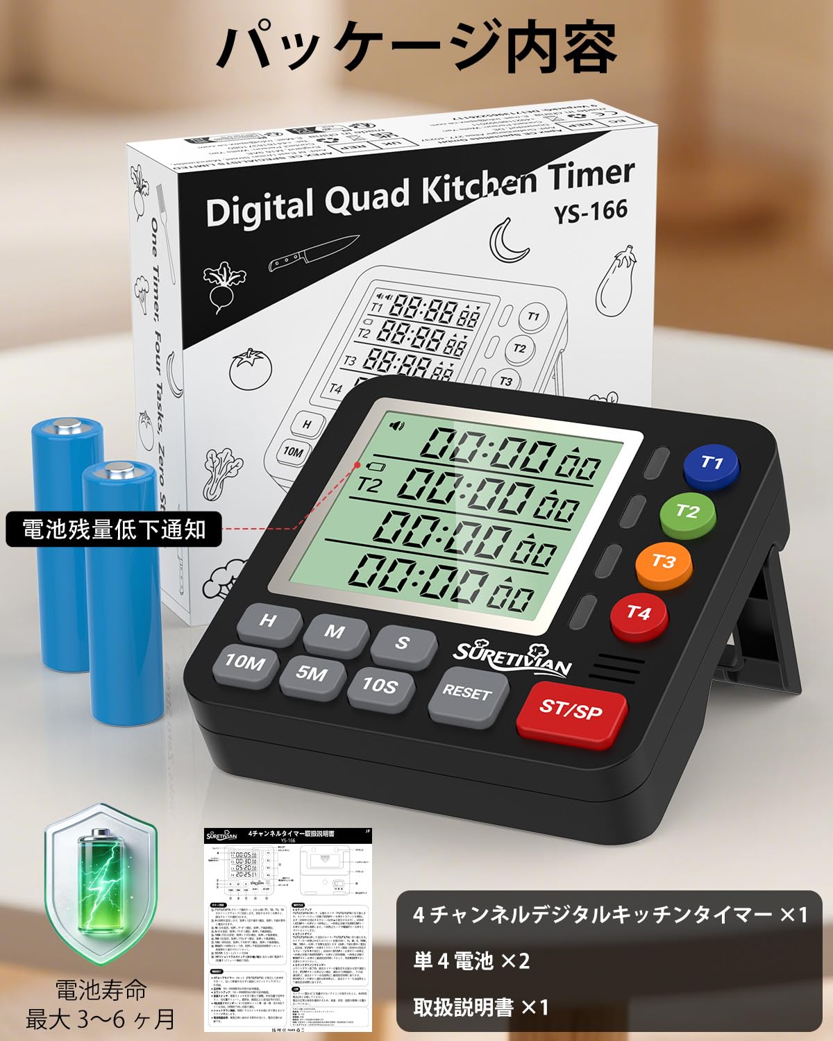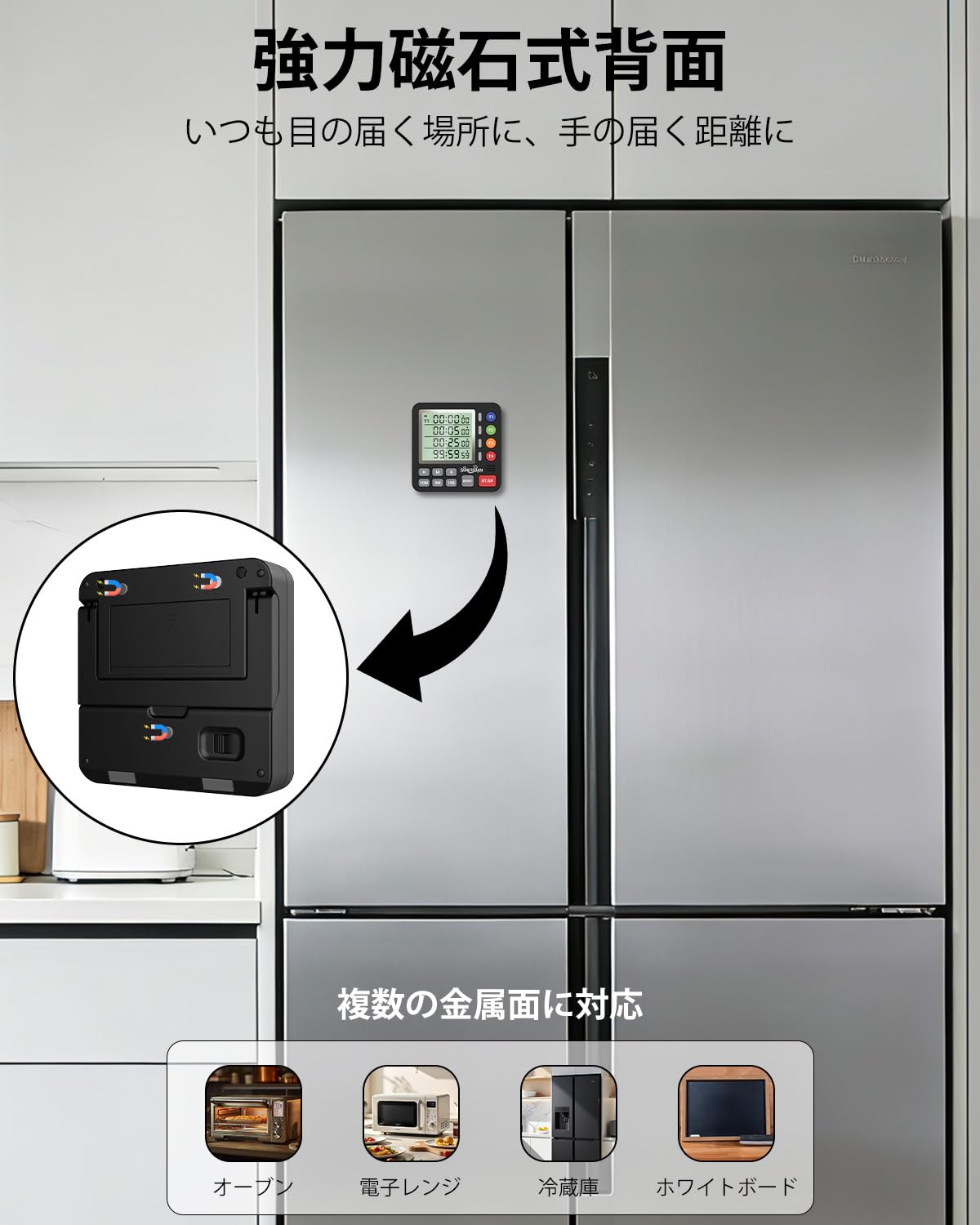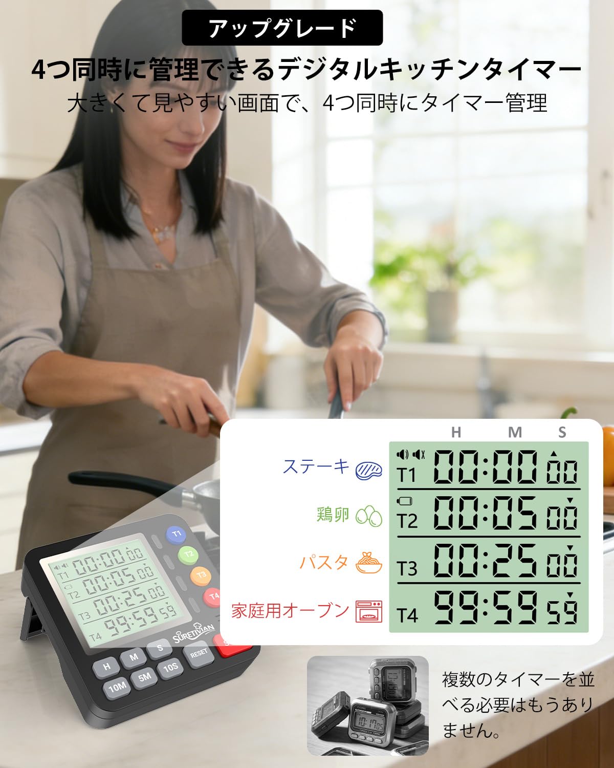 キッチンタイマー 4チャンネル デジタルタイマー 大画面 アラーム・静音切替 カウントアップ/カウントダウン タイマー 卵・勉強・教室・運動用 電池付 (ブラック)