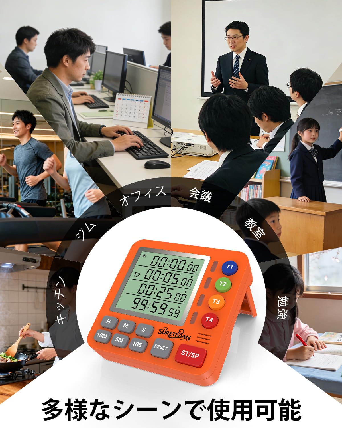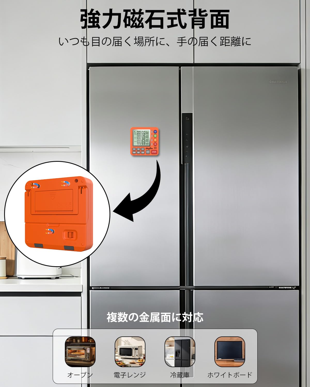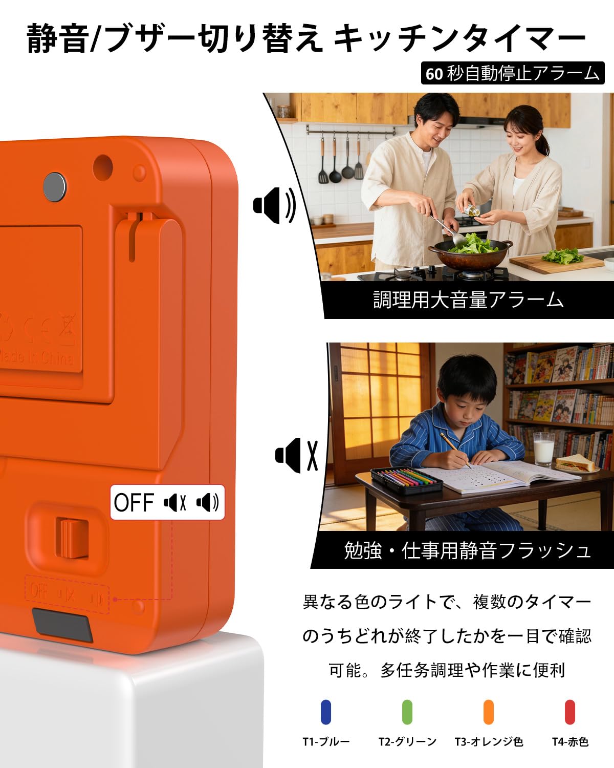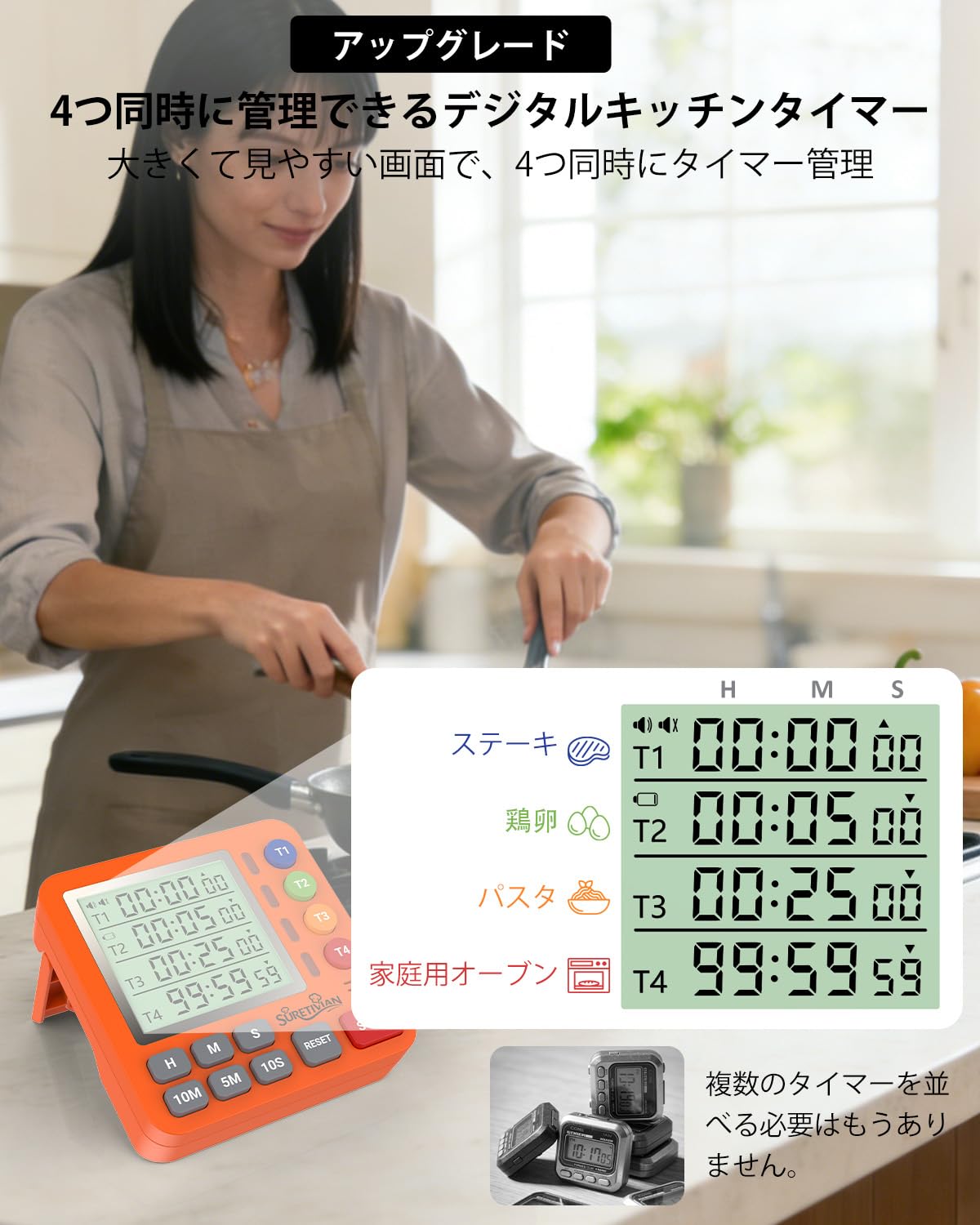 キッチンタイマー 4チャンネル デジタルタイマー 大画面 アラーム・静音切替 カウントアップ/カウントダウン タイマー ・卵・勉強・教室・運動用 電池付 (オレンジ)