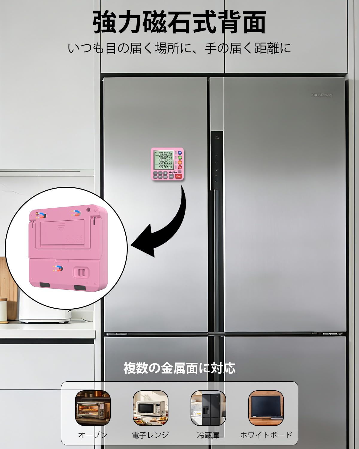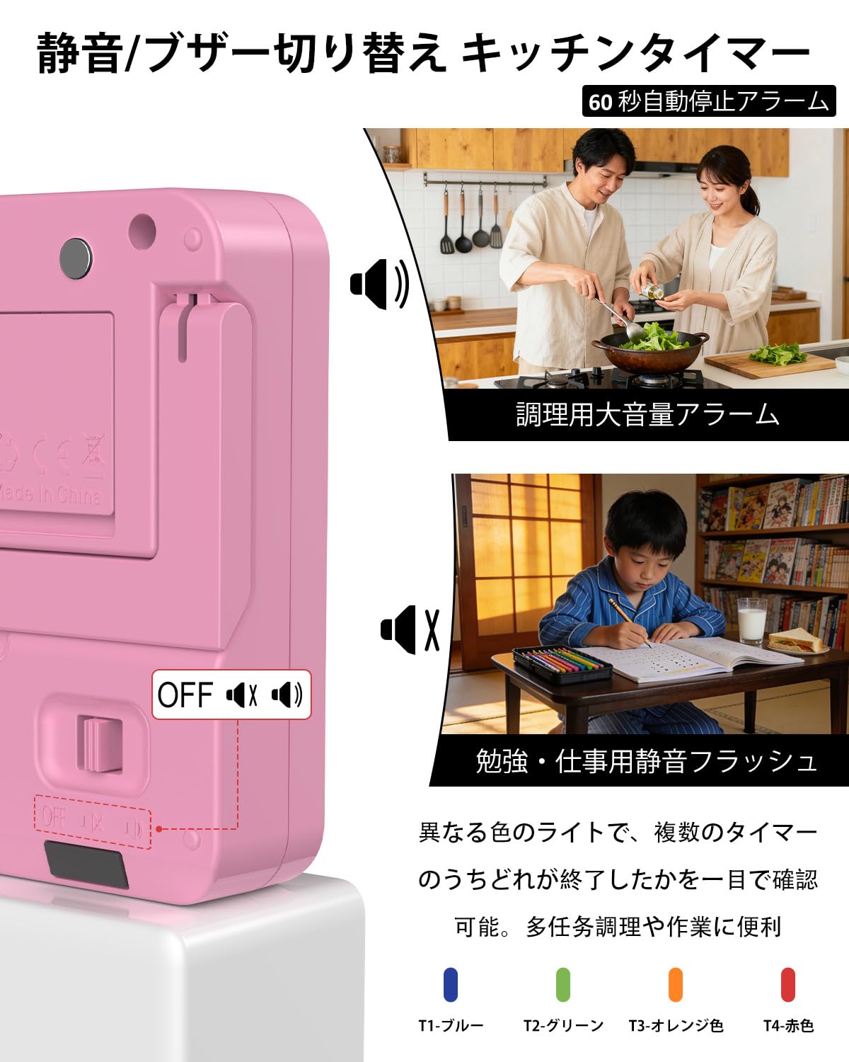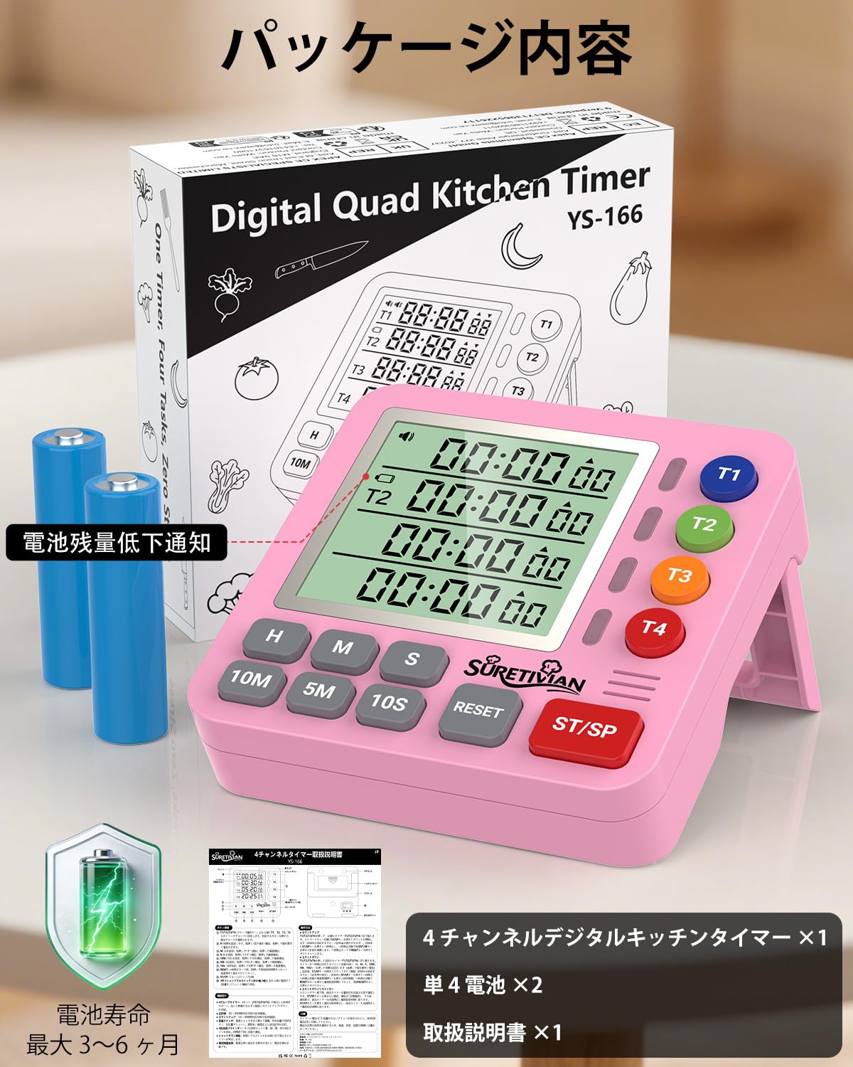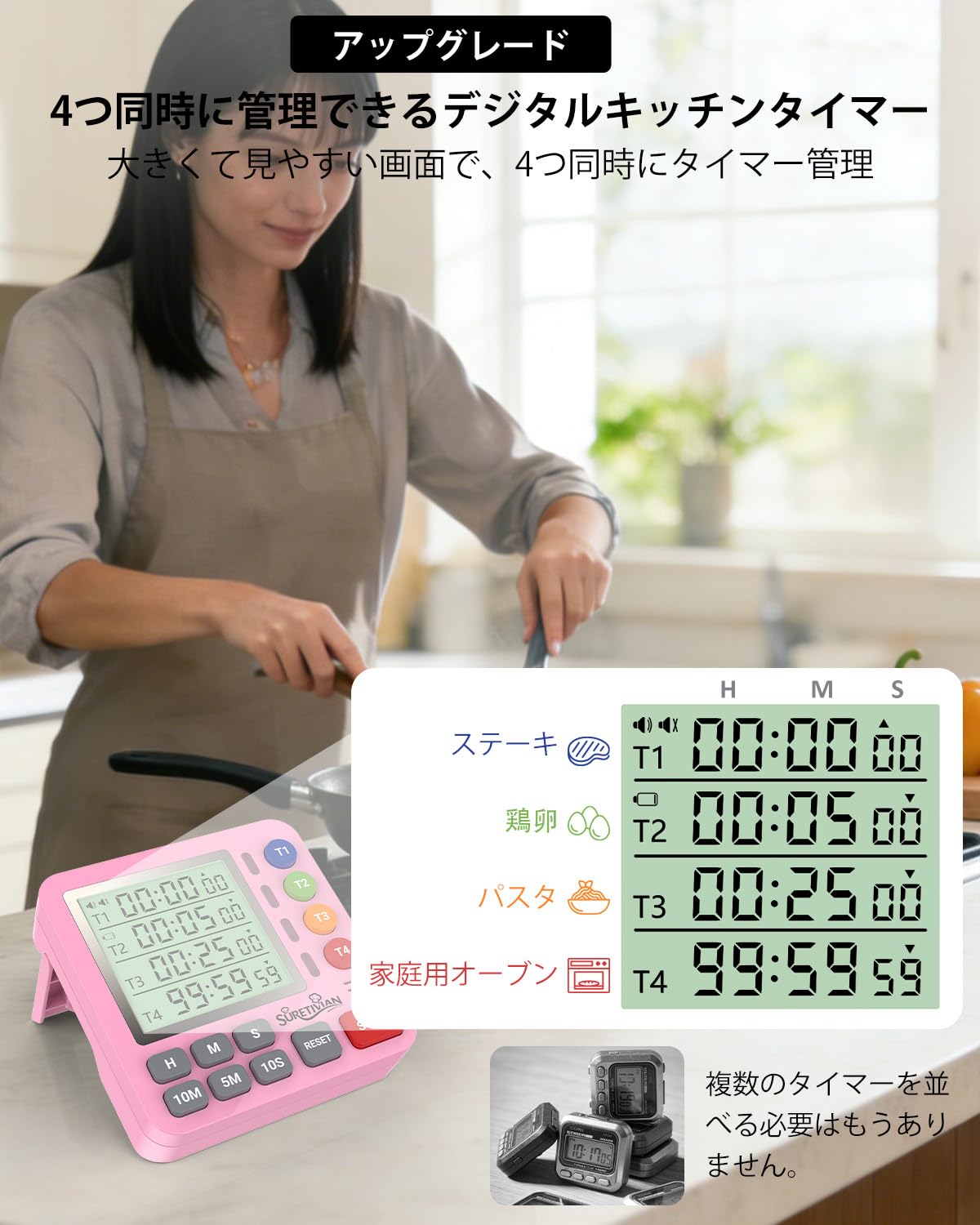 キッチンタイマー 4チャンネル デジタルタイマー 大画面 アラーム・静音切替 カウントアップ/カウントダウン タイマー ・卵・勉強・教室・運動用 電池付 (ピンク)