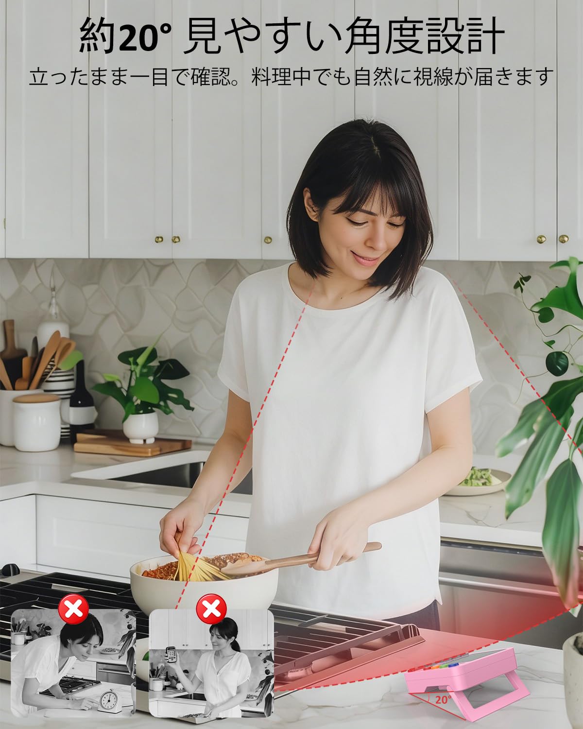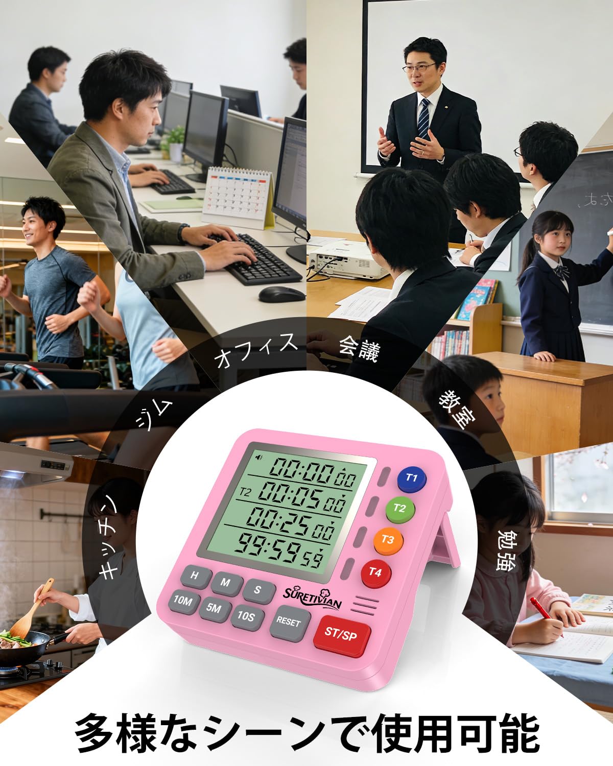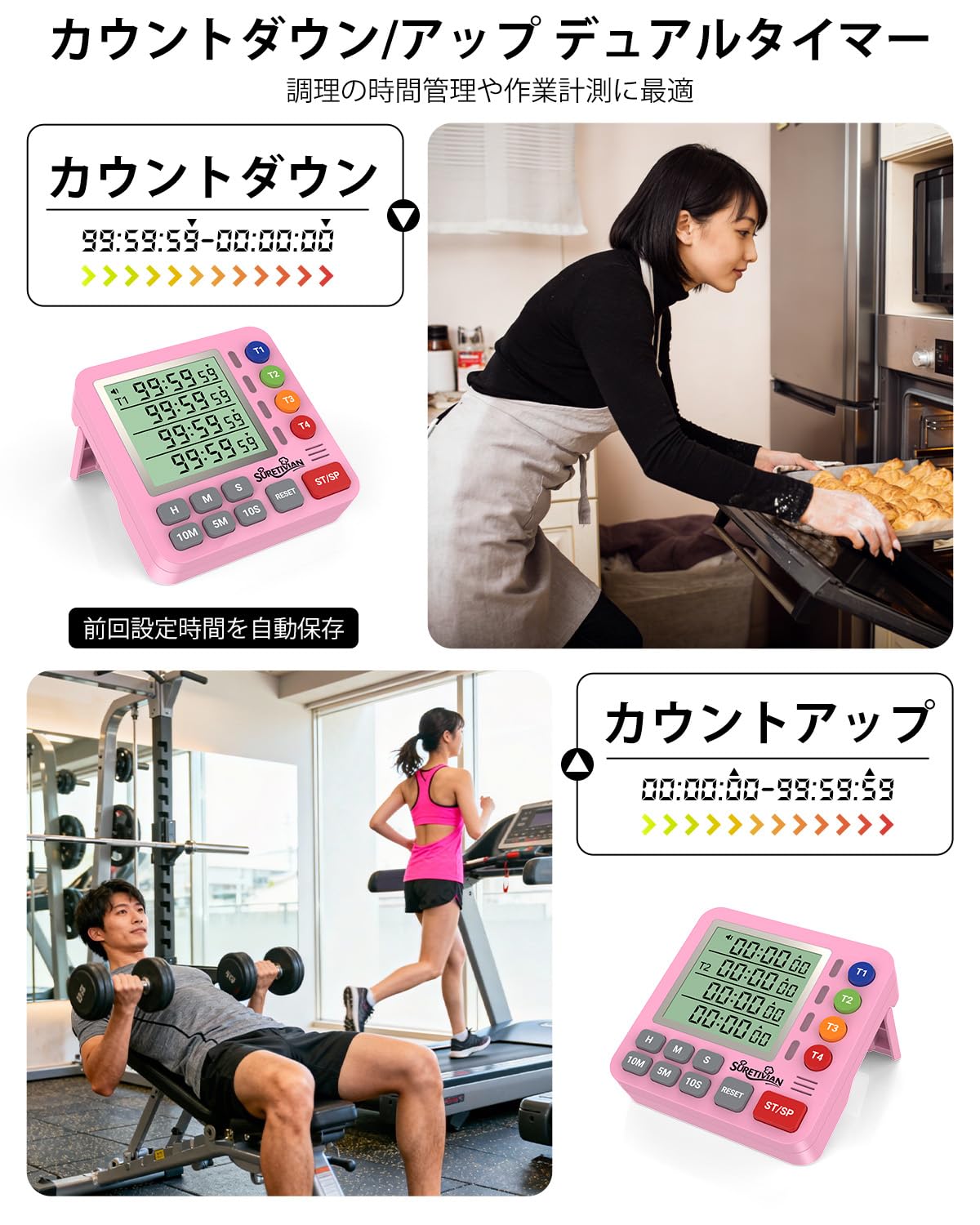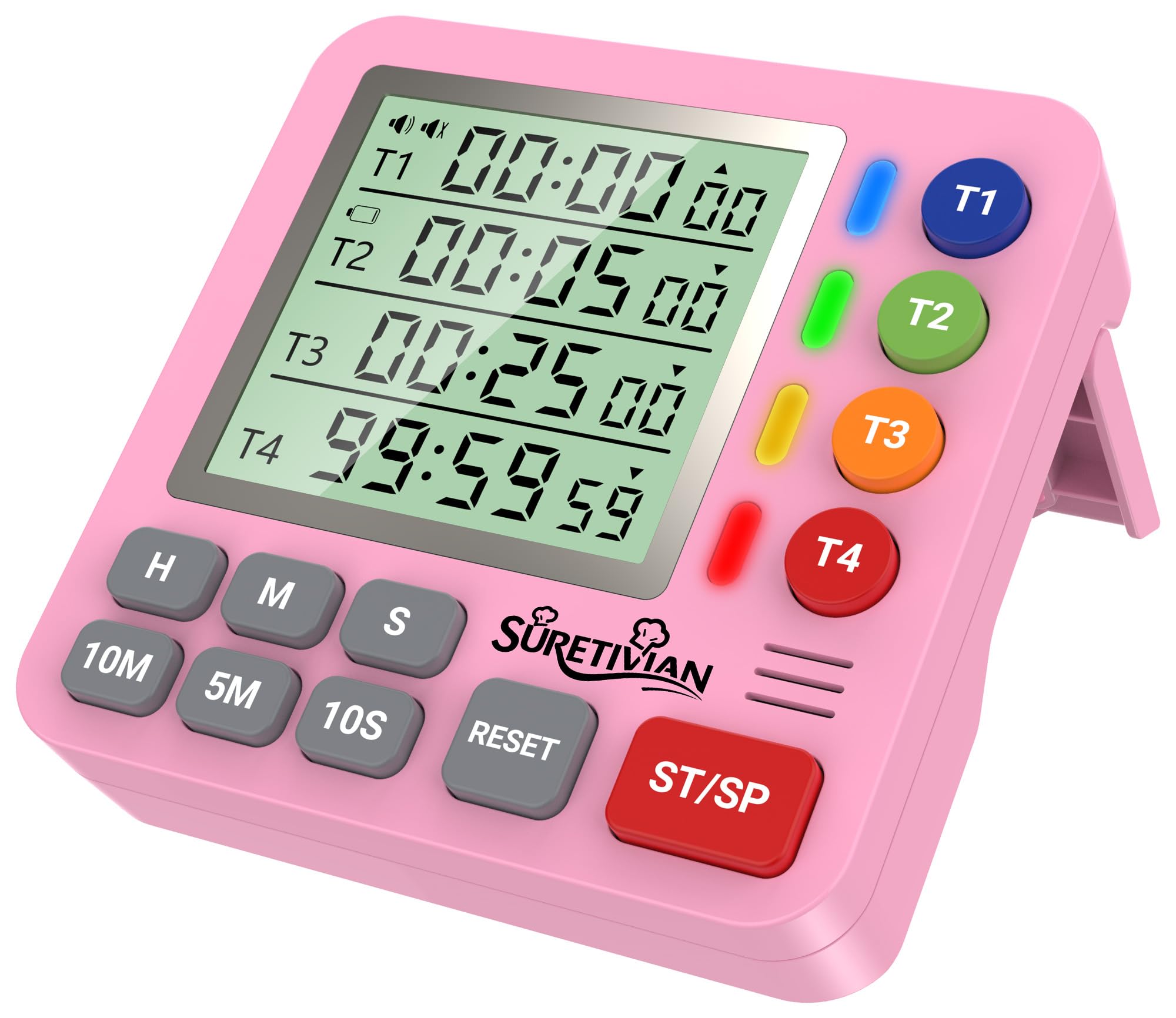 キッチンタイマー 4チャンネル デジタルタイマー 大画面 アラーム・静音切替 カウントアップ/カウントダウン タイマー ・卵・勉強・教室・運動用 電池付 (ピンク)